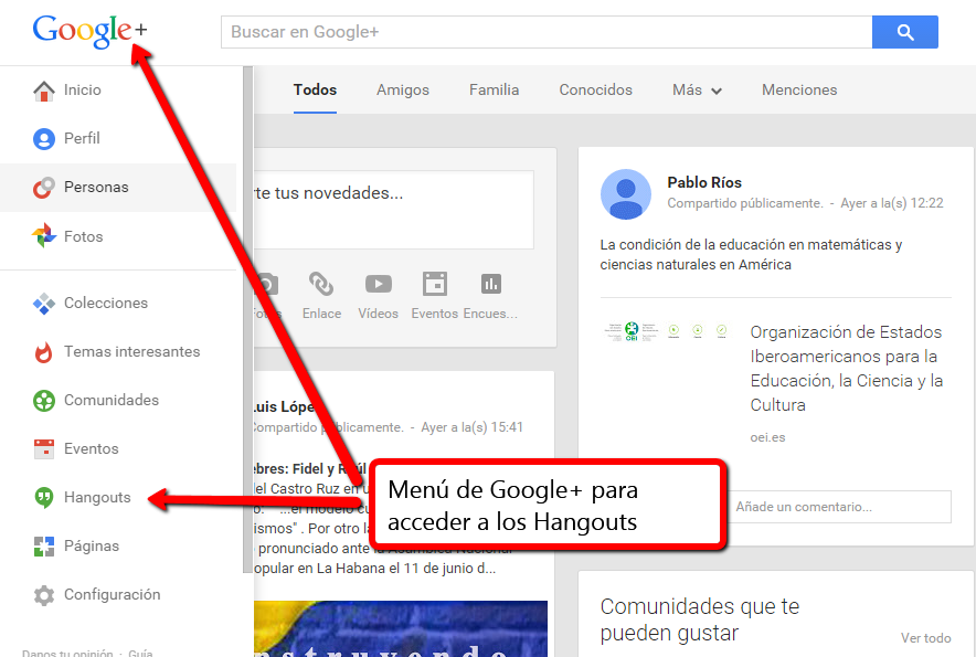 Menú en G+ para acceder a los Hangouts de Google.