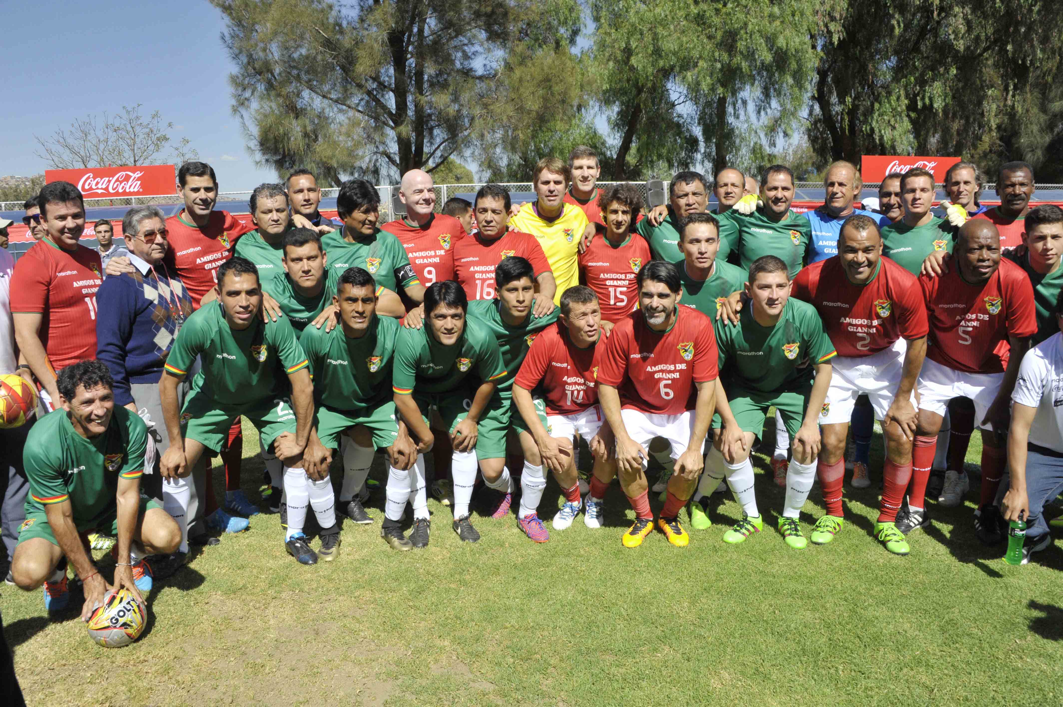 El Presidente de la FIFA se presentó con los exmundialistas Fernando Hierro (España), Marcos Evangelista de Morães Cafú (Brasil) y Martín Palermo (Argentina), mientras que Morales jugó acompañado por los exjugadores de la selección nacional que calsificó al Mundial Estados Unidos 94, entre ellos, Carlos Borja, el seleccionador nacional Julio César Baldivieso y el «Diablo» Marco Antonio Etcheverry.