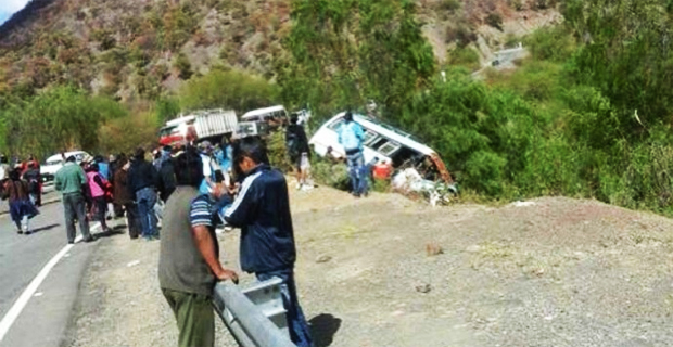 Un microbús con 20 pasajeros se embarrancó este domingo en el sector río Chico en el trayecto Sucre-Las Palmas, dejando a varias personas heridas que colapsaron el hospital Santa Bárbara de la ciudad capital, reportó este lunes radio Aclo de la red Erbol.De esa cantidad, 11 personas resultaron heridas de las cuales cuatro de gravedad, las mismas que fueron transferidas el hospital San Pedro Claver de Lajastambo, debido a que el hospital de la ciudad no tenía espacio para atender a los heridos.El director de la Red Siete de Oropeza, Juan Garnica, informó que los transferidos a Lajastambo son heridos por traumatismos. Según el hospital los heridos fueron identificados como Florencio Márquez, Bertha Quispe, Máxima Arratia y Paulina Callisaya.El director del Organismo Operativo de Tránsito, coronel José Guardia informó que se presume que las causas del hecho, fueron falla mecánica y humana, porque los frenos no respondían al motorizado.El microbus color blanco y verde con placa de control 496-DBI, era conducido por Florencio Márquez, quien se dirigía a la localidad Las Palmas sobre la carretera Sucre-Cochabamba. el hecho se habría producido a las 12:15 horas a 25 kilòmetros de la ciudad de Sucre.La autoridad policial anunció que en las próximas horas hará conocer las verdaderas causas del accidente.En Chuquisaca se registró el viernes por la noche, otro accidente en la carretera Yamparáez-Sucre, donde una camioneta Hilux de color blanco con placa 697 HIK-Santa Cruz, se accidentó dejando una mujer de 33 años fallecida y otras siete personas (tres mujeres y cuatro niños resultaron heridas.