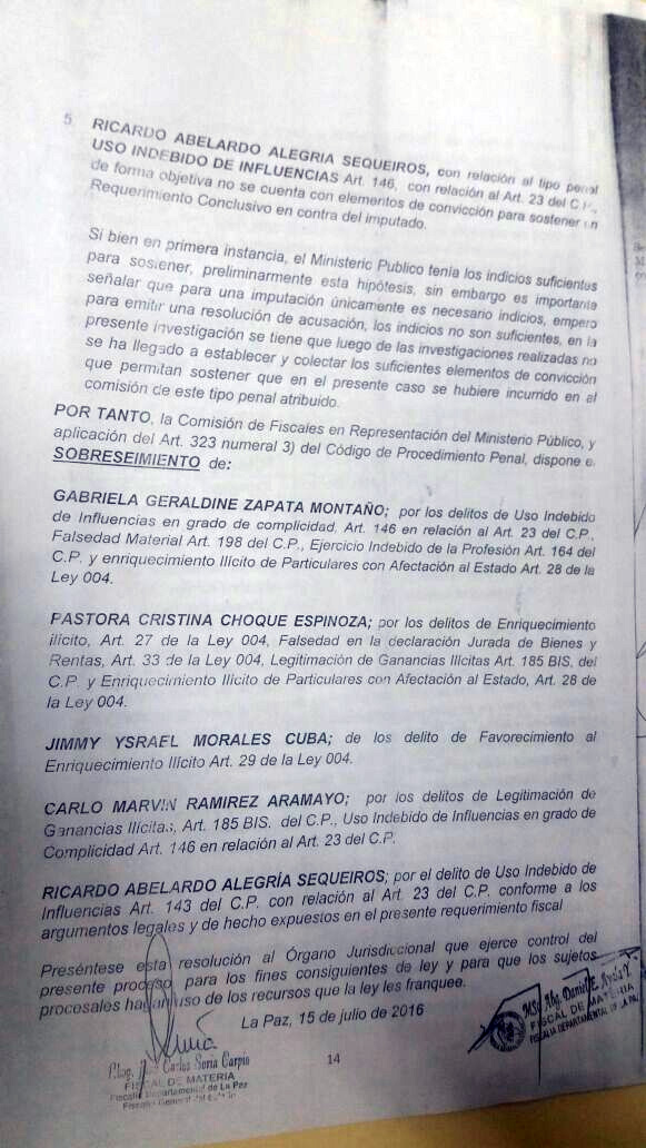 La red Erbol publicó la resolución fiscal, que fue dictada 12 días antes de la presentación de una imputación formal contra Zapata por los delitos de legitimación de ganancias ilícitas, falsedad ideológica, uso de instrumento falsificado, contribuciones y ventajas ilegitimas, además de uso indebido de bienes y servicios públicos.
