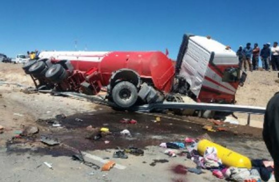 Un camión cisterna de gran tamaño y un minibús tipo surubí protagonizaron este miércoles una fatal colisión en la avenida Panamericana, a la salida de la población orureña de Caracollo, donde nueve personas perdieron la vida, informó la Policía. Aparentemente el conductor del minibús invadió carril y chocó frontalmente contra el camión, muriendo todos los ocupantes.
