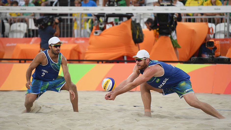 El dúo brasileño de voleivol playa Bruno Oscar Schmidt y Alison Cerutti (Matthias Hangst/Getty Images).