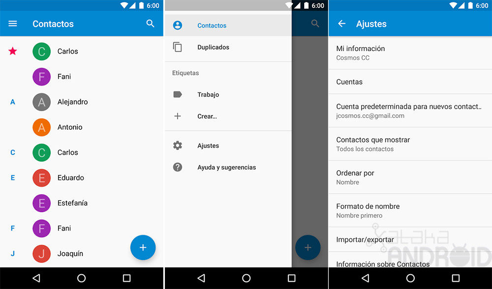 Su nueva interfaz viene acompañada con la nueva barra de navegación lateral que nos descubrirá dos nuevas opciones: buscar contactos duplicados y organizar nuestros contactos con etiquetas. También reorganiza todos sus opciones de configuración dentro del apartado Ajustes.