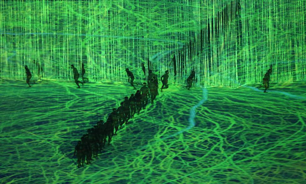 Luego, los voluntarios olímpicos trasladaron al centro del espacio escénico los enormes semilleros metálicos, que en la primera parte de la ceremonia habían simulado los bloques de edificios de los que se formaban las densas ciudades brasileñas. Con ellos, formaron los cinco anillos, y de ellos surgieron, al cabo, unas palmeras frondosas: el símbolo olímpico renuncia a sus tradicionales cinco colores para quedarse solo con el verde, como enésimo guiño al mensaje conservacionista.