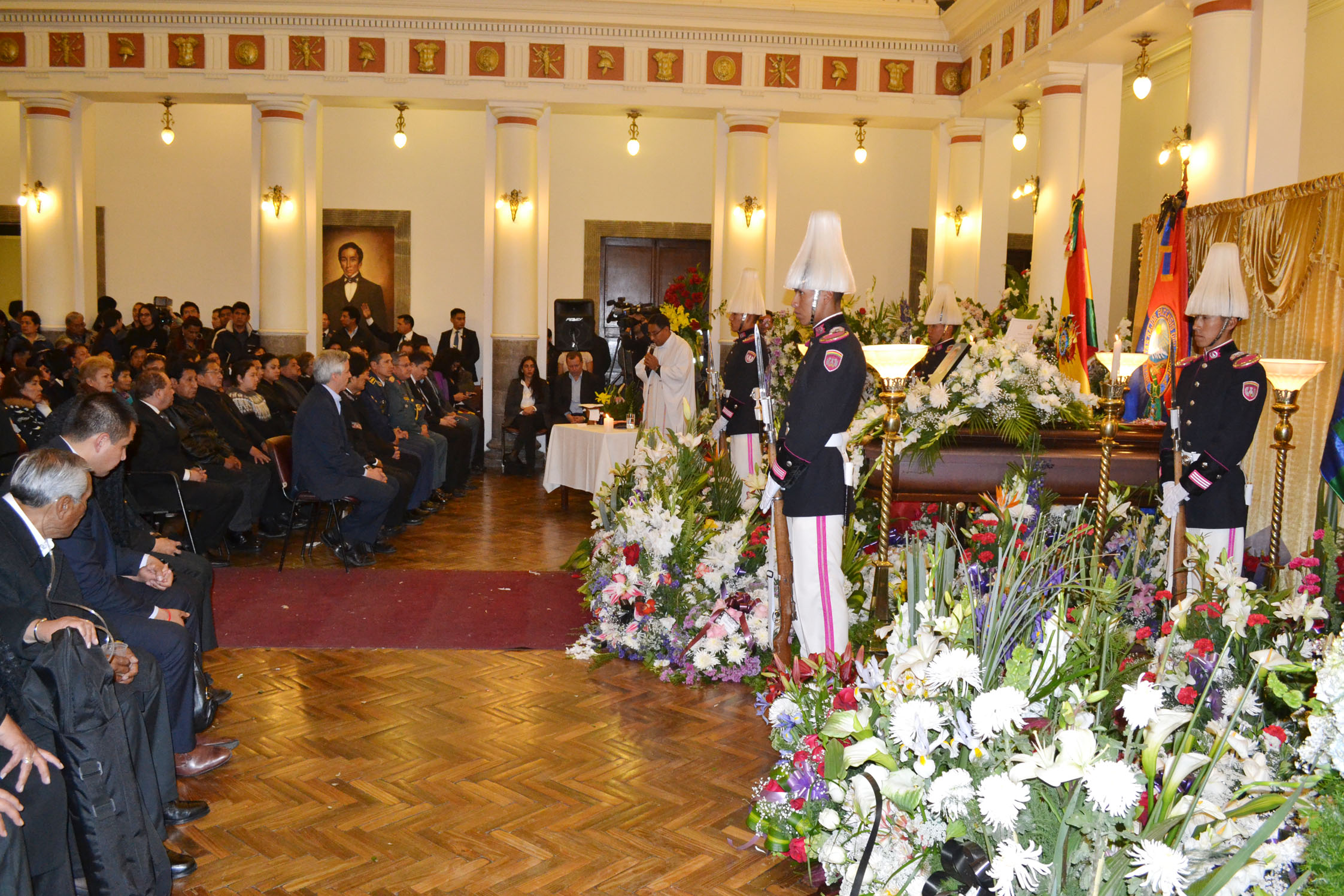 La Paz, 26 de agosto/ eju.tv.- El presidente Evo Morales, el vicepresidente, ministros, autoridades del legislativo, asambleístas del MAS, cúpula militar y policial, amigos y funcionarios de diferentes reparticiones del Estado se congregaron para acompañar a la familia del asesinado Viceministro Illanes, en su velatorio y Misa de Cuerpo Presente efectuada la noche de este viernes en Palacio de Gobierno.El vicepresidente García Linera y el ministro de la Presidencia, Juan Ramón Quintana, recibieron en la tarde el cortejo fúnebre, y la guardia de Palacio fue la encargada de cargar el féretro hasta la capilla instalada en el hall.Representantes de organizaciones sociales afines al gobierno también participaron de la misa, en la que el sacerdote encomendó el cuerpo de Rodolfo Illanes para su descanso definitivo.