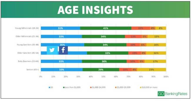 Los mayores de 65 años son los que más dinero tienen en sus cuentas: solo el 33% de los encuestados no ahorra nada, mientras que el 29% tiene 1.000 dólares y el 23% tiene más de 10.000. En la otra cara de la moneda encontramos a los milleannials jóvenes (de 18 a 24 años), entre los que el 41% tiene menos de 1.000 dólares ahorrados.