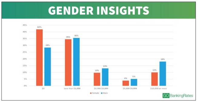 El sondeo de ‘GOBankingRates’ encontró asimismo que los adultos de bajos ingresos tienen menos probabilidades de tener ahorros. Entre los que ganan menos de 25.000-49.999 dólares al año, el 38% no tiene ahorrado nada y el 35% dispone de menos de 1.000 euros. En contraste, solo el 6% de los encuestados disfruta de ahorros superiores a 150.000 dólares, mientras que el 23% tiene menos de 1.000 dólares en el banco y el 40% dispone de 10.000.Las mujeres son más propensas que los hombres a no tener ahorros en el banco. La brecha salarial podría ser el factor determinante que explique la diferencia