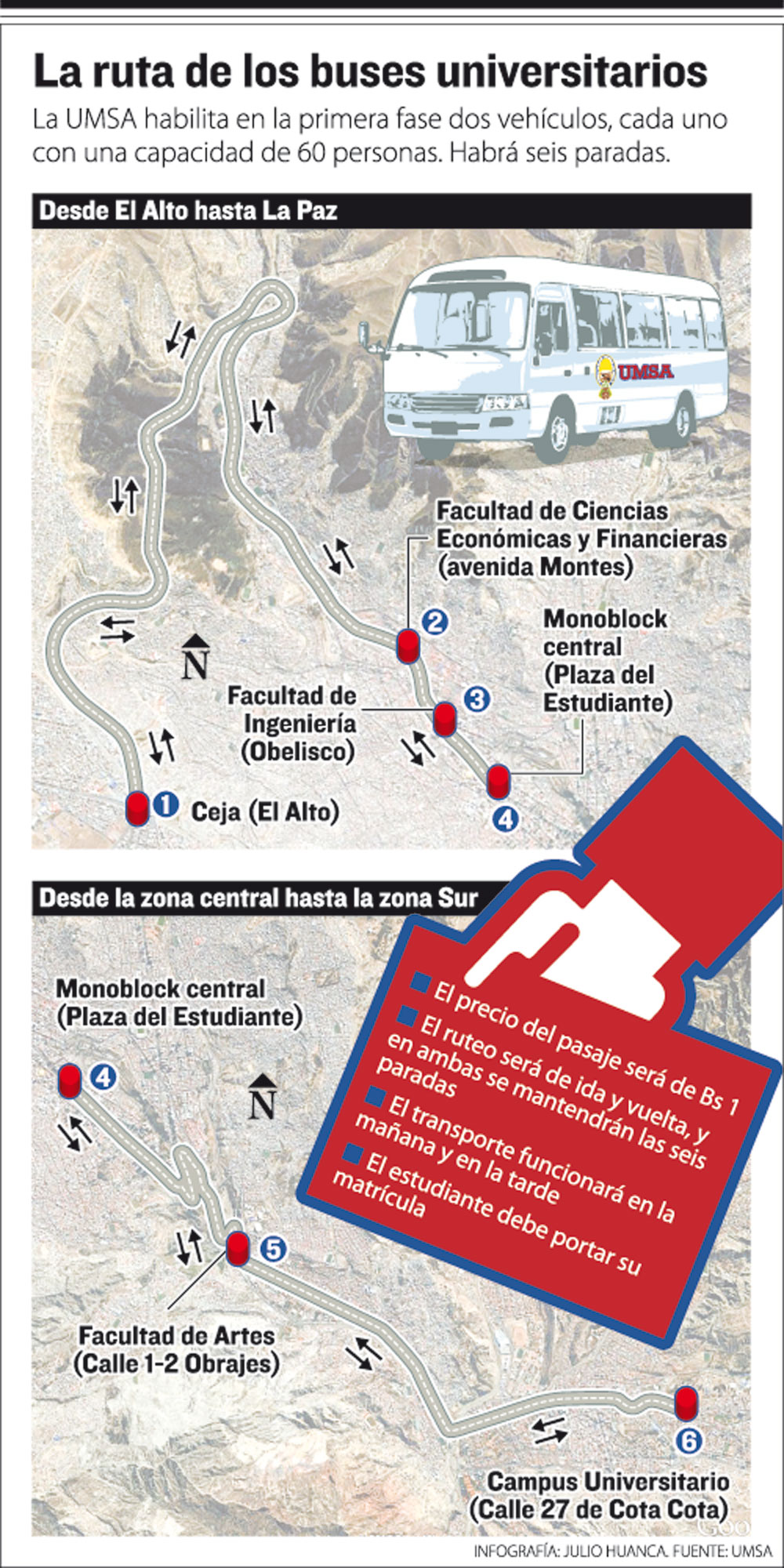 En el ruteo existen al menos seis paradas, desde la Ceja de la ciudad de El Alto hasta el Campus Universitario ubicado en el barrio de Cota Cota en la zona sur de La Paz. El costo del pasaje será de Bs 1.