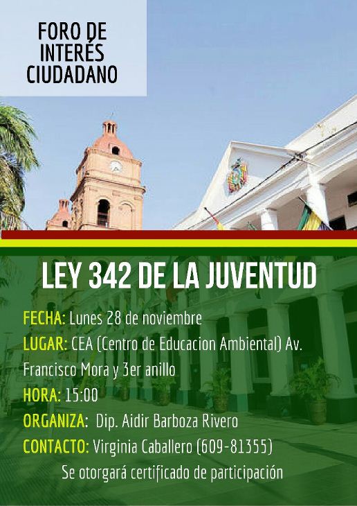 Los diputados de la Circunscripción 45, Luis Felipe Dorado y Aidir Barboza, organizan un Foro de Interés Ciudadano sobre la Ley 342 de la Juventud, donde darán a conocer los alcances de esta nueva normativa.El evento se realizará el lunes 28 de noviembre desde las 15:00 horas en el CEA (Centro de Educación Ambiental), ubicado en la Avenida Francisco Mora y Tercer Anillo.La inscripción es gratuita y se otorgará certificado de participación. Contacto al 609-81355 (Virginia Caballero).