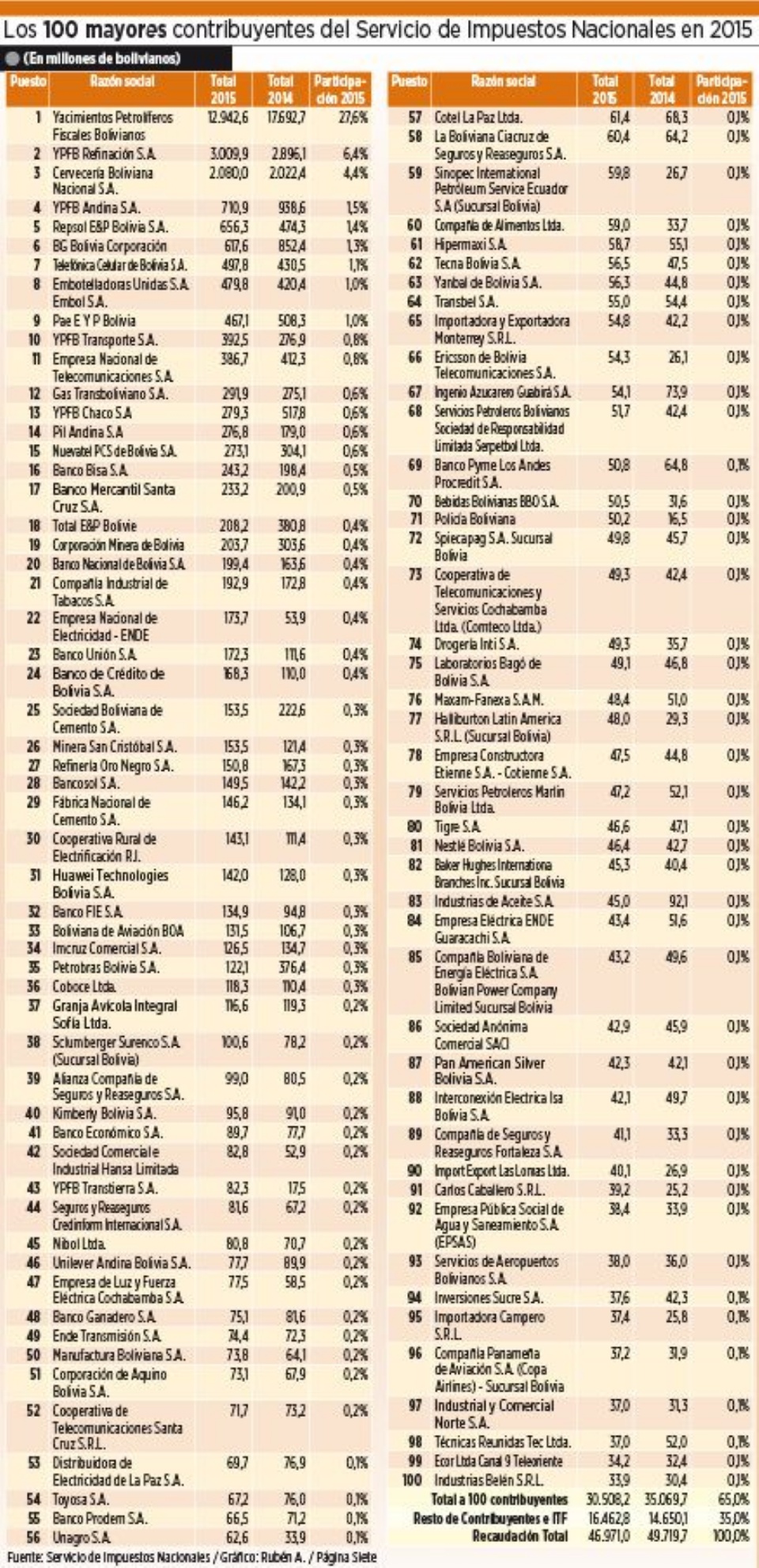 Yacimientos Petrolíferos Fiscales Bolivianos (YPFB) Corporación, YPFB Refinación y la Cervecería Boliviana Nacional fueron los mayores contribuyentes en 2015. Pagaron 18.032,5 millones de bolivianos de impuestos, que equivalen al 38,4% del total de la recaudación de ese año.