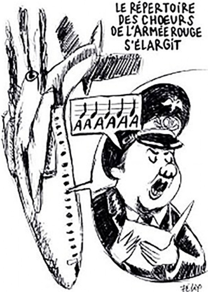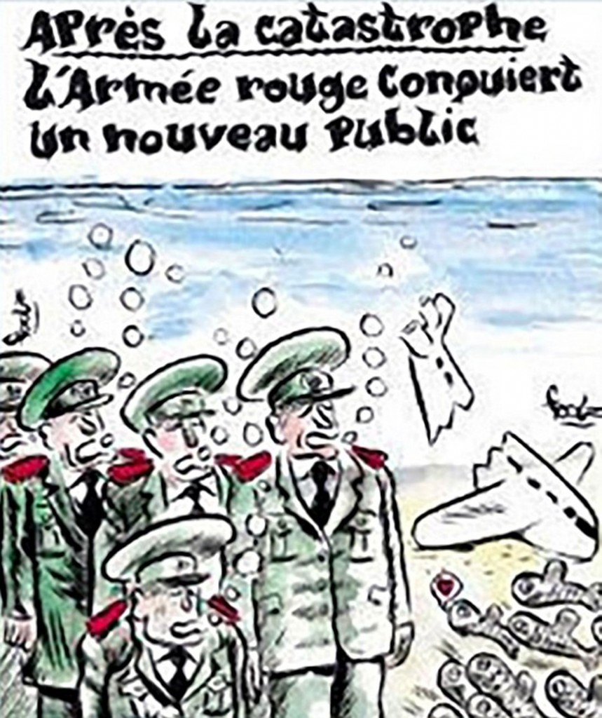 Un Tu-154 de la Fuerza Aérea Rusa se precipitó sobre el Mar Negro en Navidad. Murieron sus 92 ocupantes, entre los que se destacaban 68 miembros del Ensamble Aleksándrov, el célebre coro del Ejército Rojo. Como viene ocurriendo con muchas de las últimas tragedias que conmueven al mundo, Charlie Hebdo la trató de forma satírica en su última edición.
