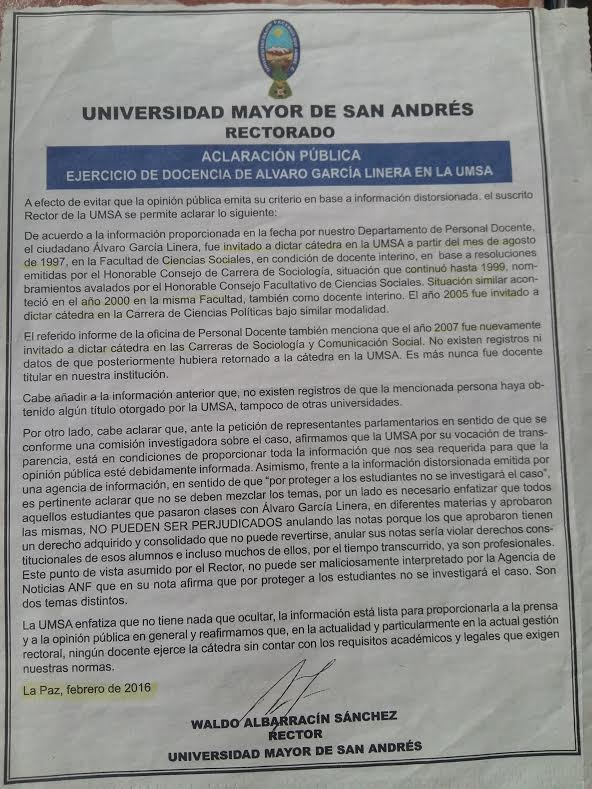 “Al año siguiente, es decir el 2007, a pesar de existir las resoluciones, normas y reglamentos que limita el ejercicio de la docencia a los que no cumplen los requisitos, se vuelve a designar al Sr. García Linera, tal como presenta la publicación observada que dice: “… el año 2007 fue nuevamente invitado a dictar cátedra en las carreras de Sociología y Comunicación Social…”. Esta reiterada irregularidad, que era de conocimiento de las autoridades facultativas y de carrera, además conociendo que no tiene documentos, proceden a su designación y pago de haberes en la gestión 2007”, subrayó Fuentes.