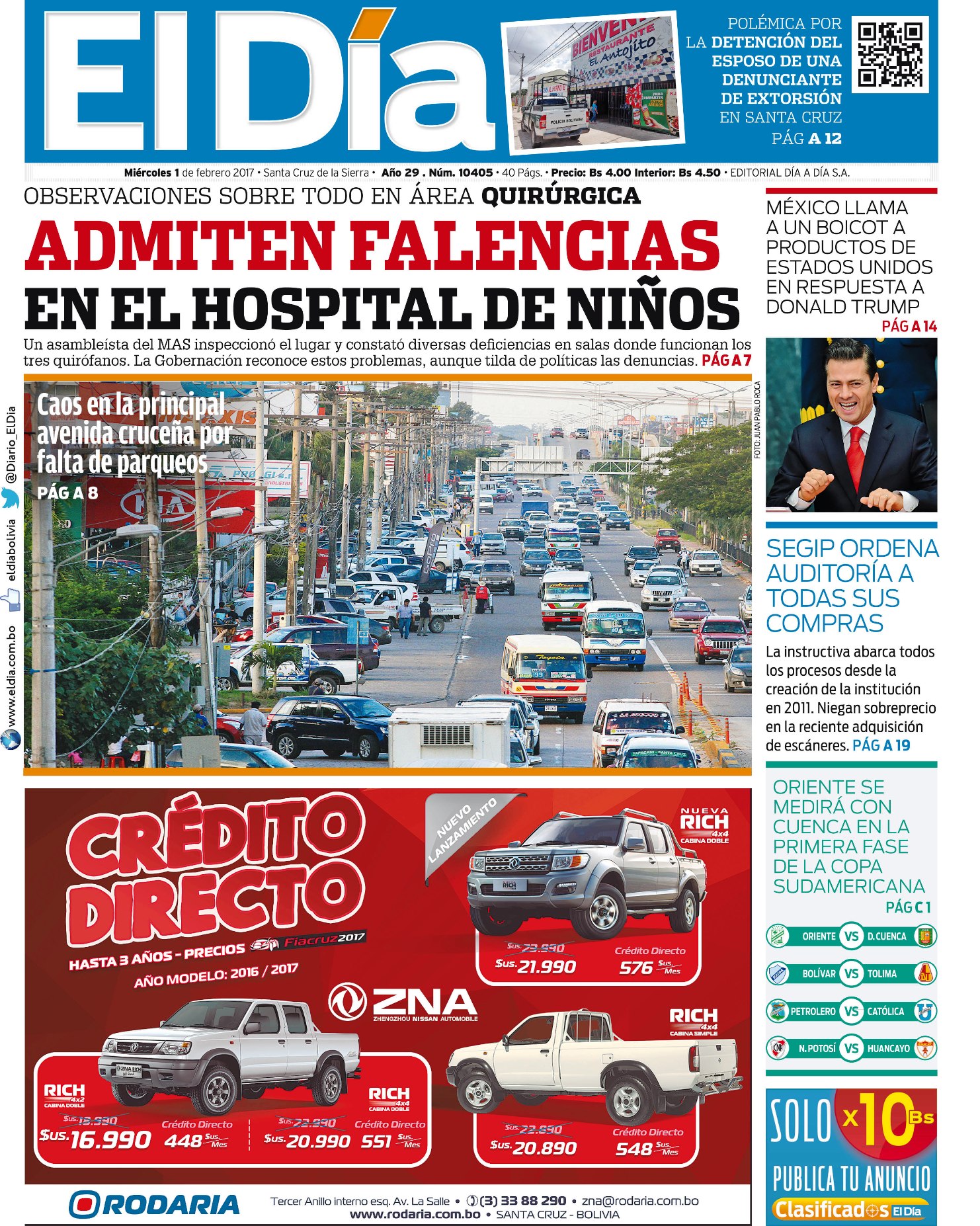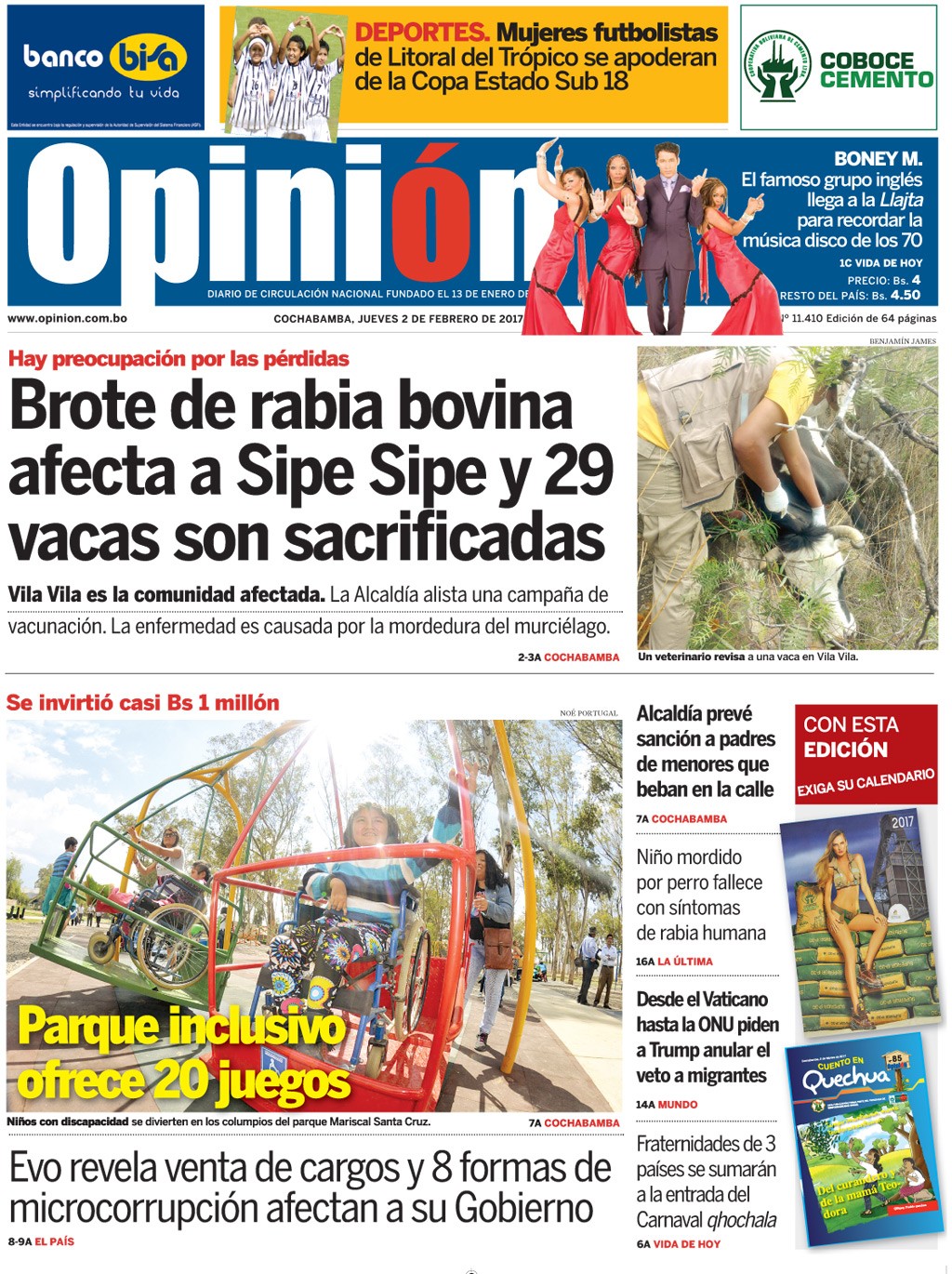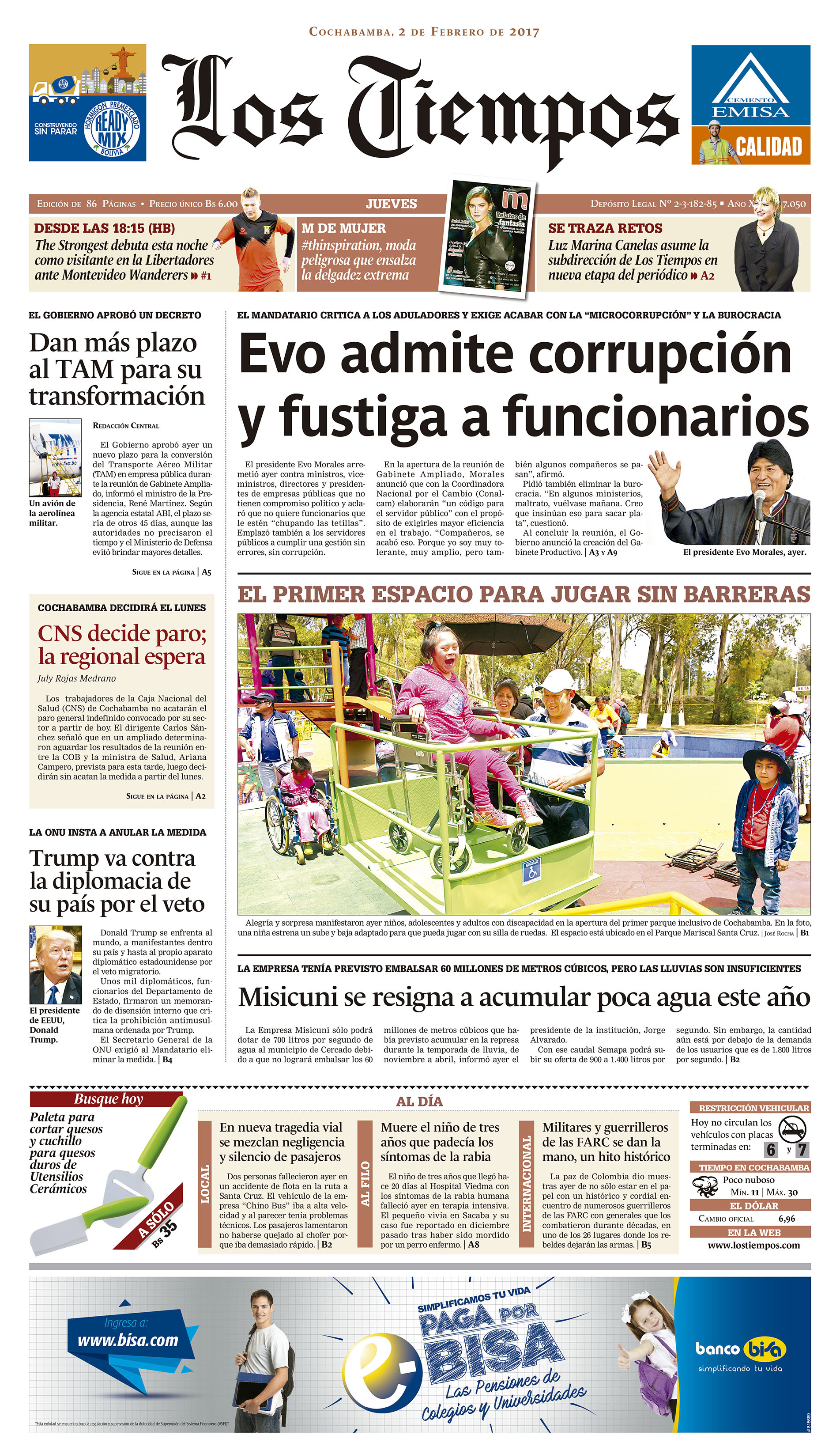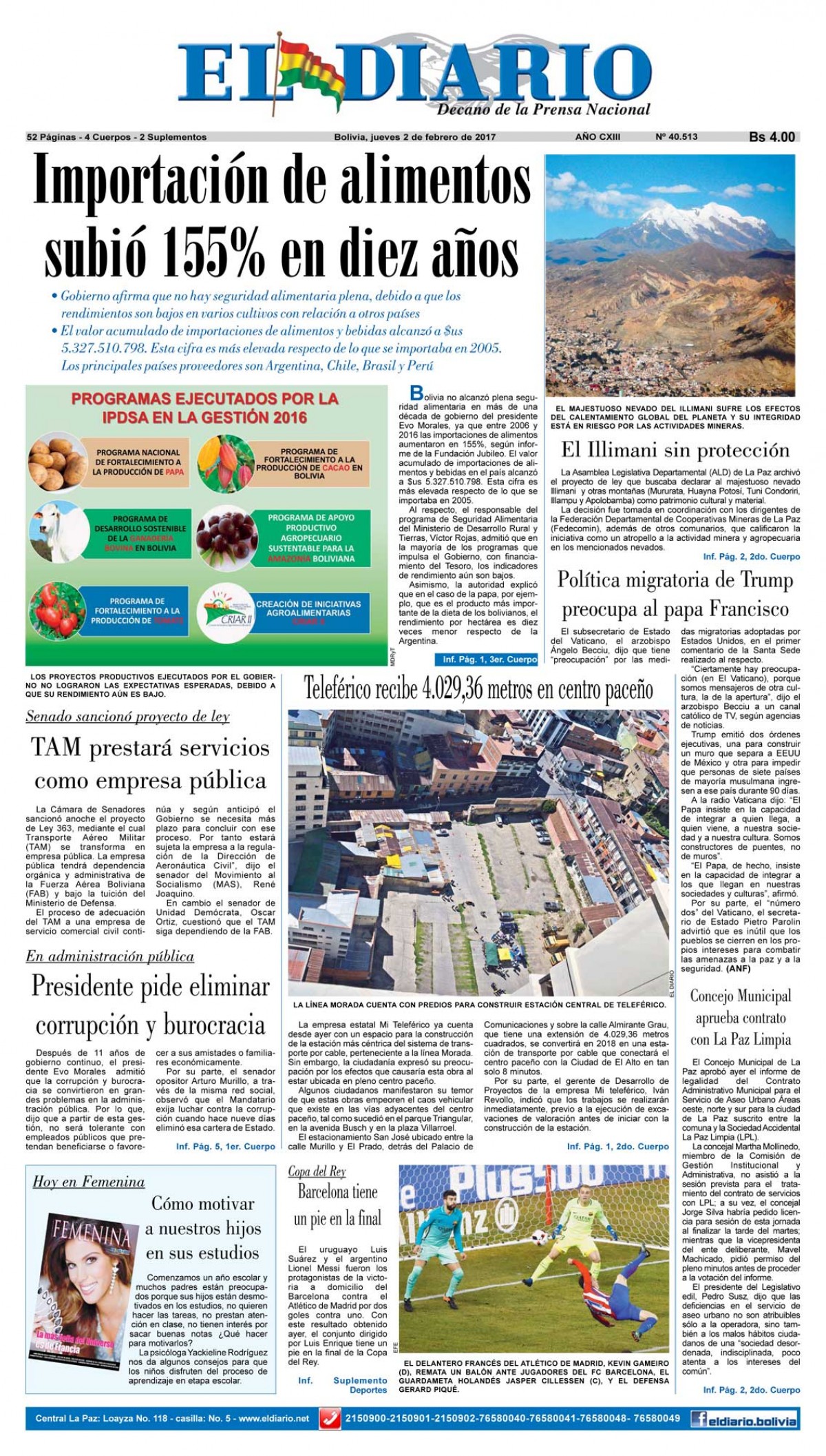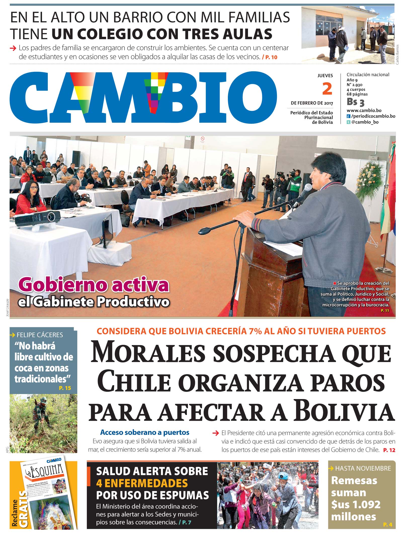 Portadas de periódicos de Bolivia del jueves 2 de febrero de 2017