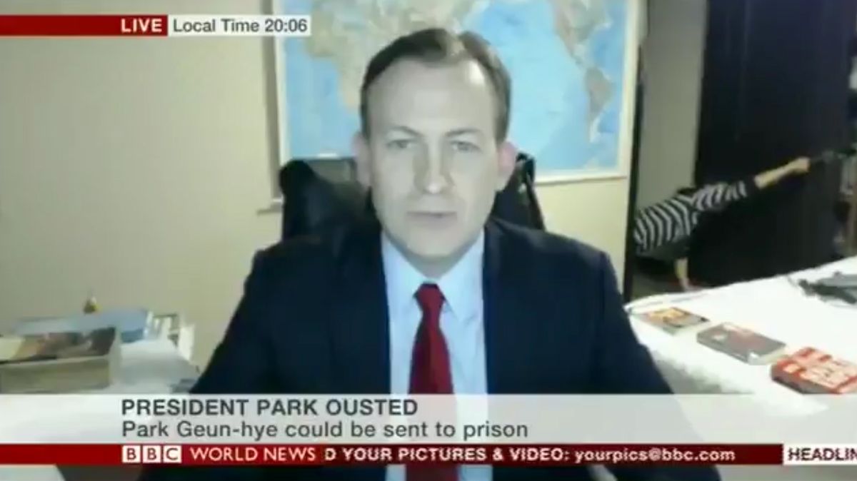 Todo parecía normal. Era el típico informe de un corresponsal desde el exterior. El periodista Robert E. Kelly hacía un análisis de la crisis en Corea del Sur tras la destitución de la presidente Park Geun-hye, involucrada en un escándalo de corrupción.