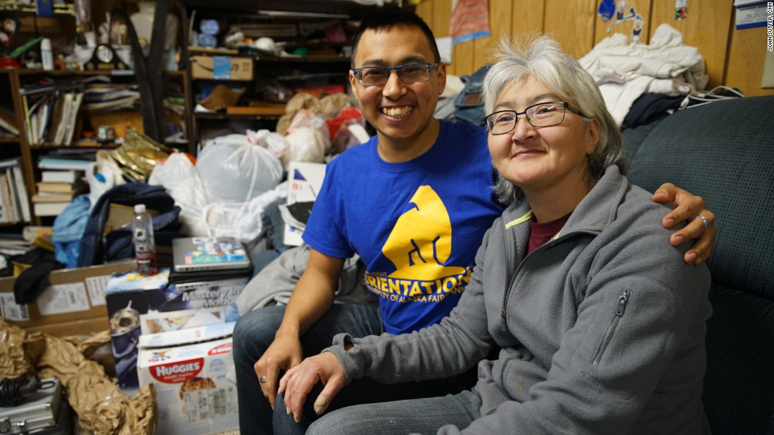 Esau Sinnok, de 19 años, es sobrino de Norman, el hombre que murió por caer en el hielo. Lidera la lucha para que Shishmaref, su pueblo, se traslade pronto. En la foto con su tía y madre adoptiva, Bessi Sinnok.