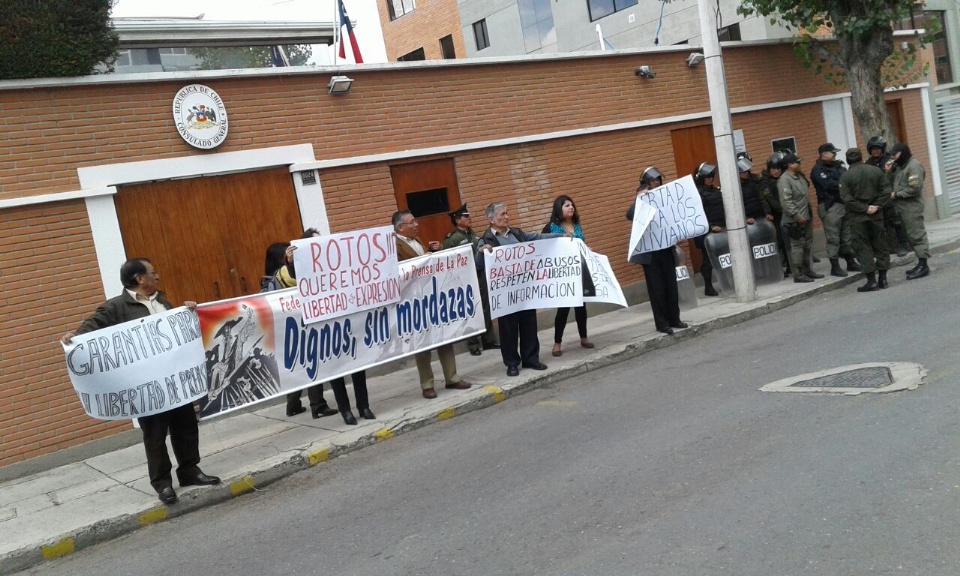 Un puñado de periodistas realizó un plantón al medio día de hoy en el frontis del Consulado de Chile, en la zona de Calacoto de la ciudad de La Paz, como medida de protesta por la retención de dos periodistas de Bolivia Tv la pasada semana en el vecino país, cuando viajaron al vecino país para cubrir la detención de dos militares y siete aduaneros bolivianos.