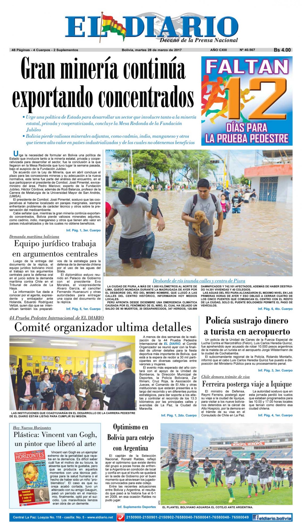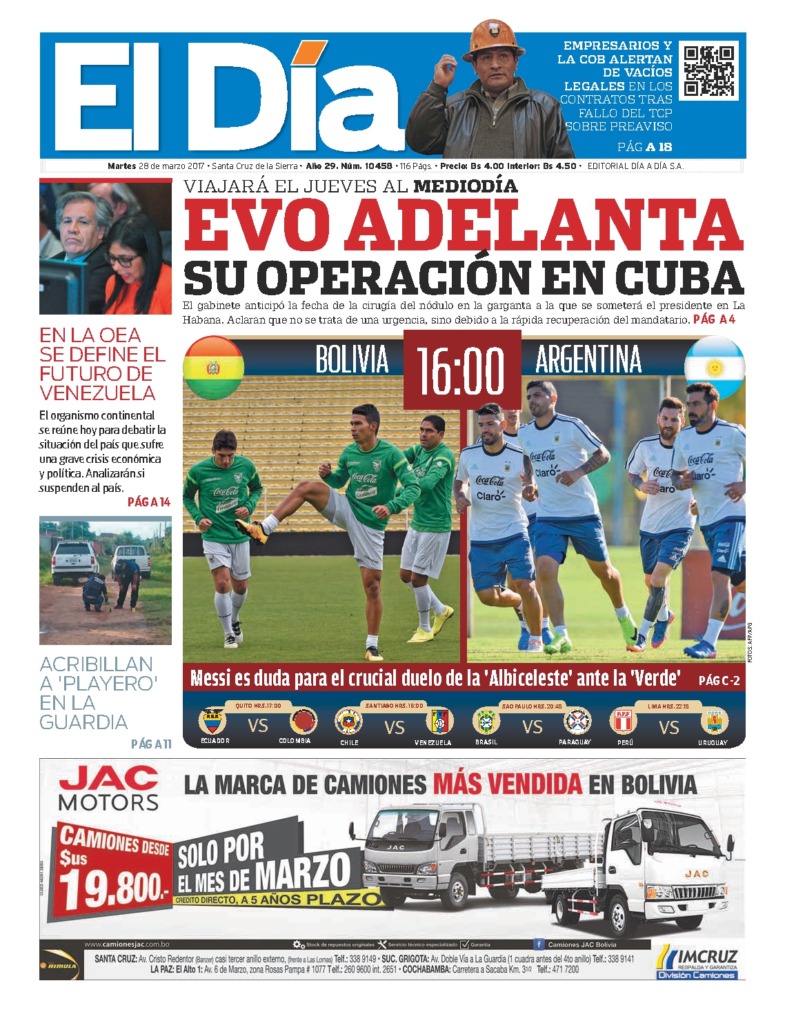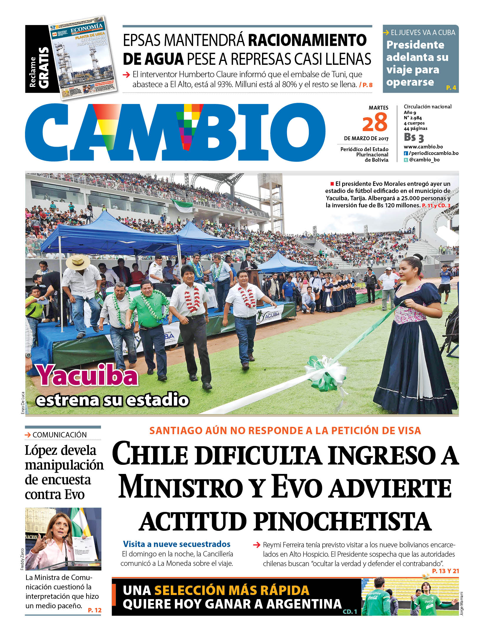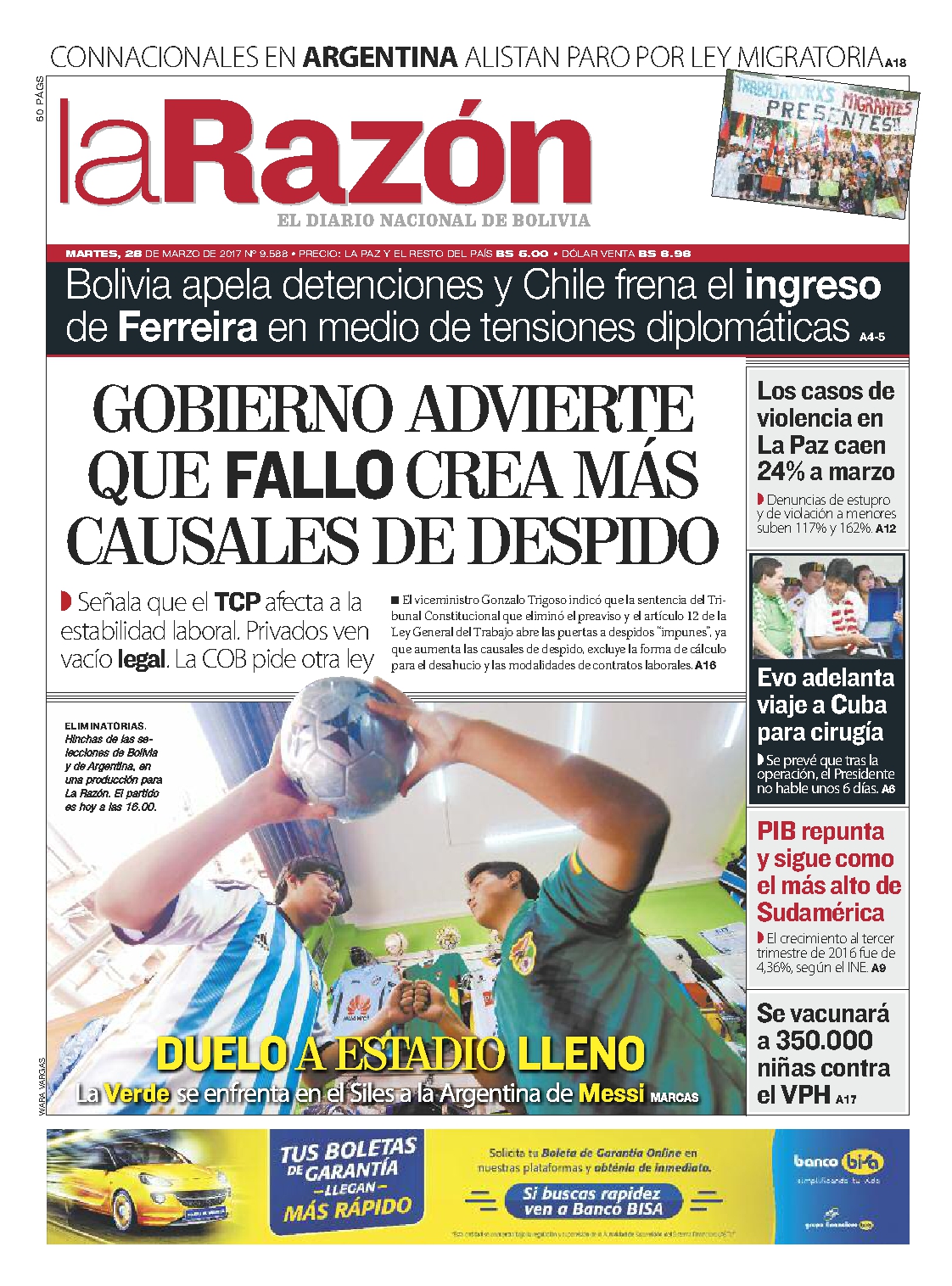 Portadas de periódicos de Bolivia del martes 28 de marzo de 2017