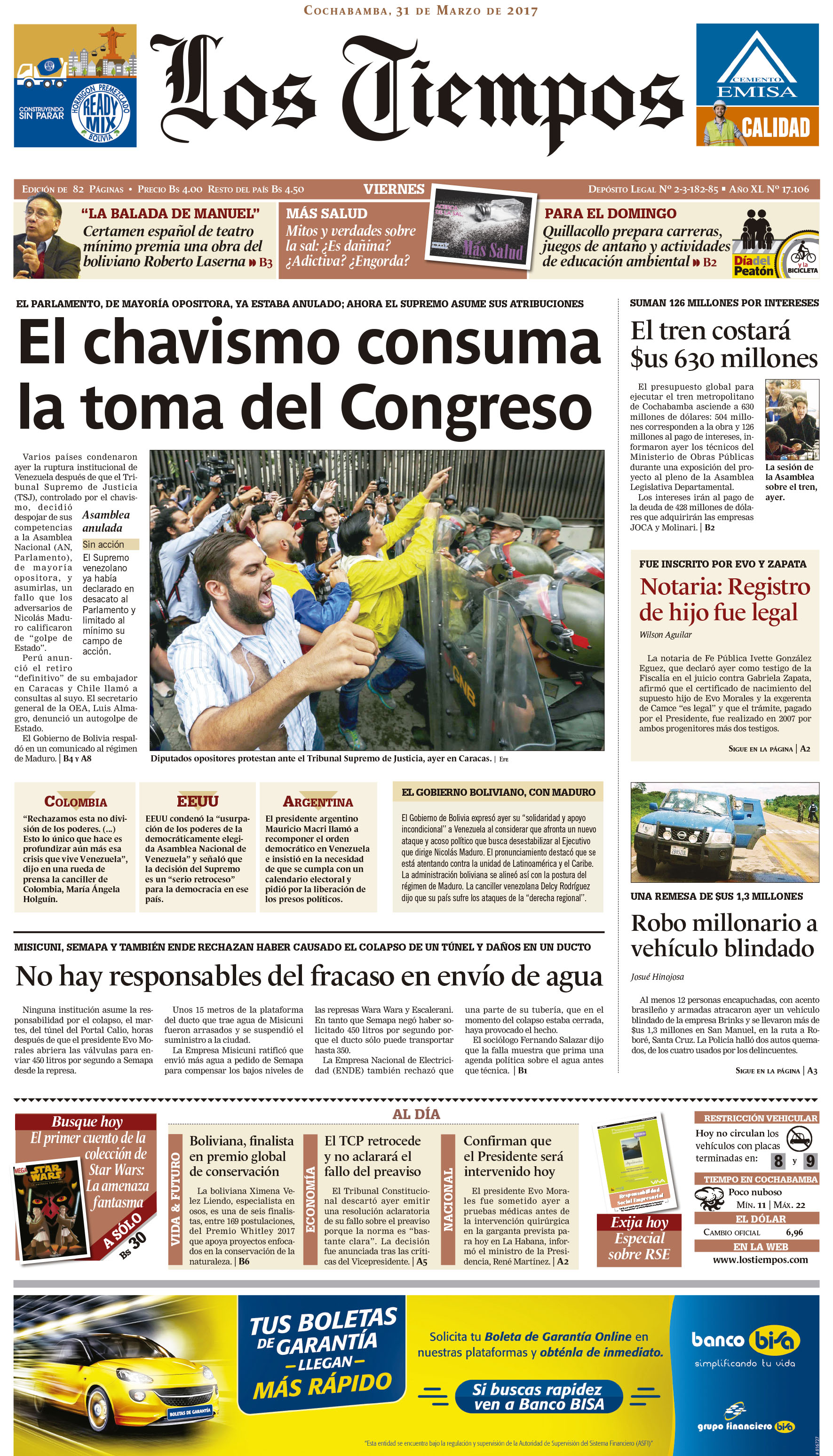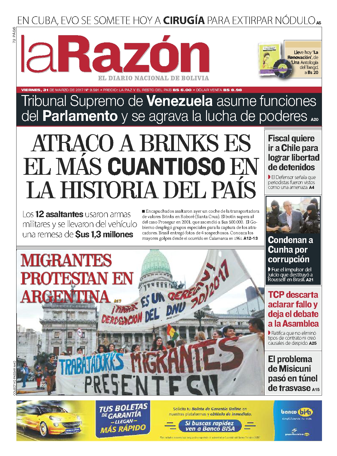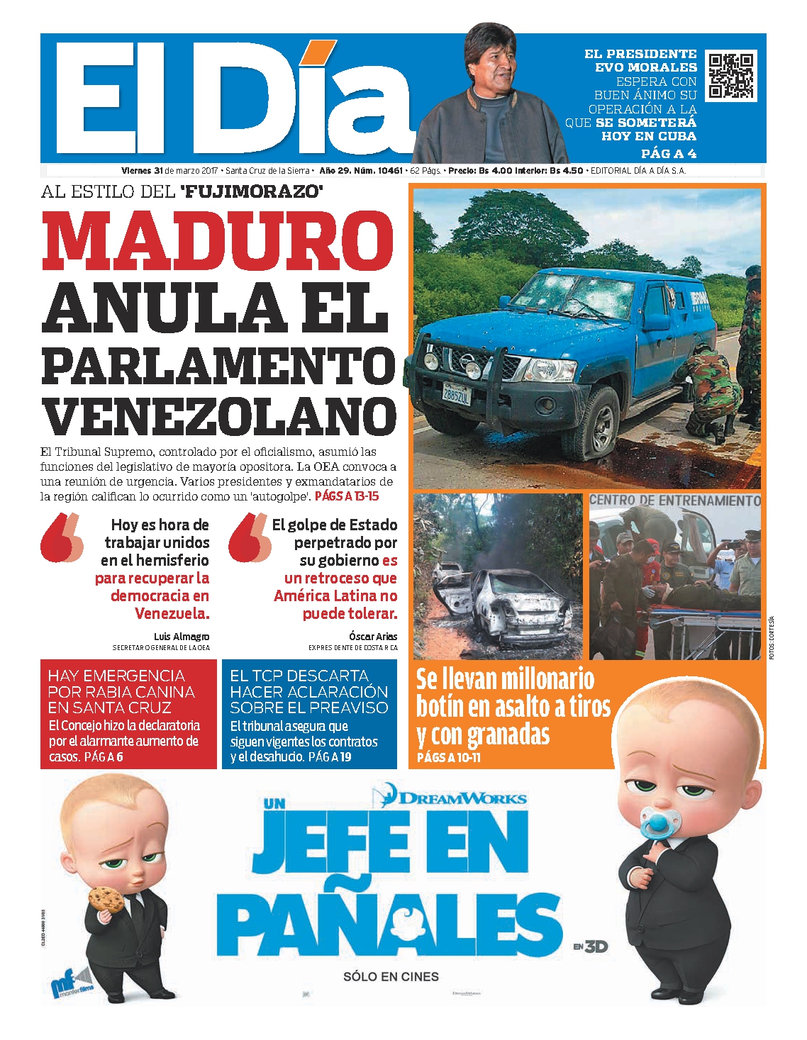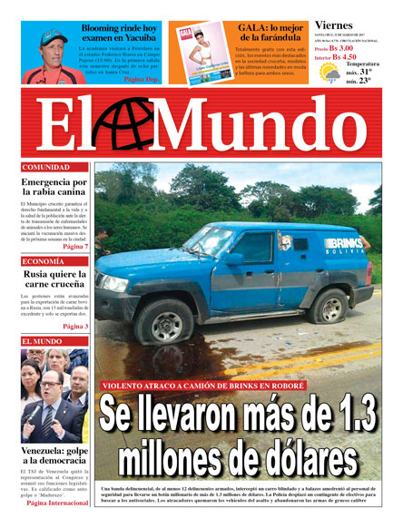 Portadas de periódicos de Bolivia del viernes 31 de marzo de 2017