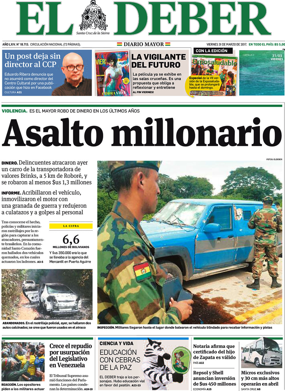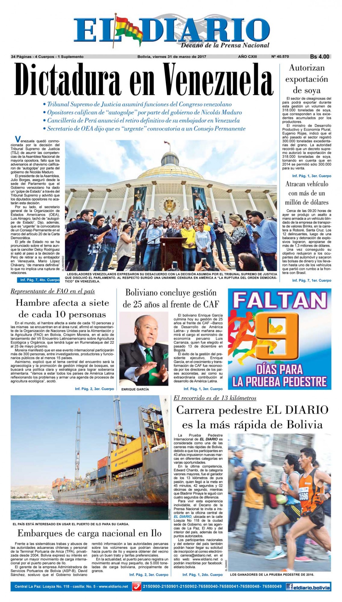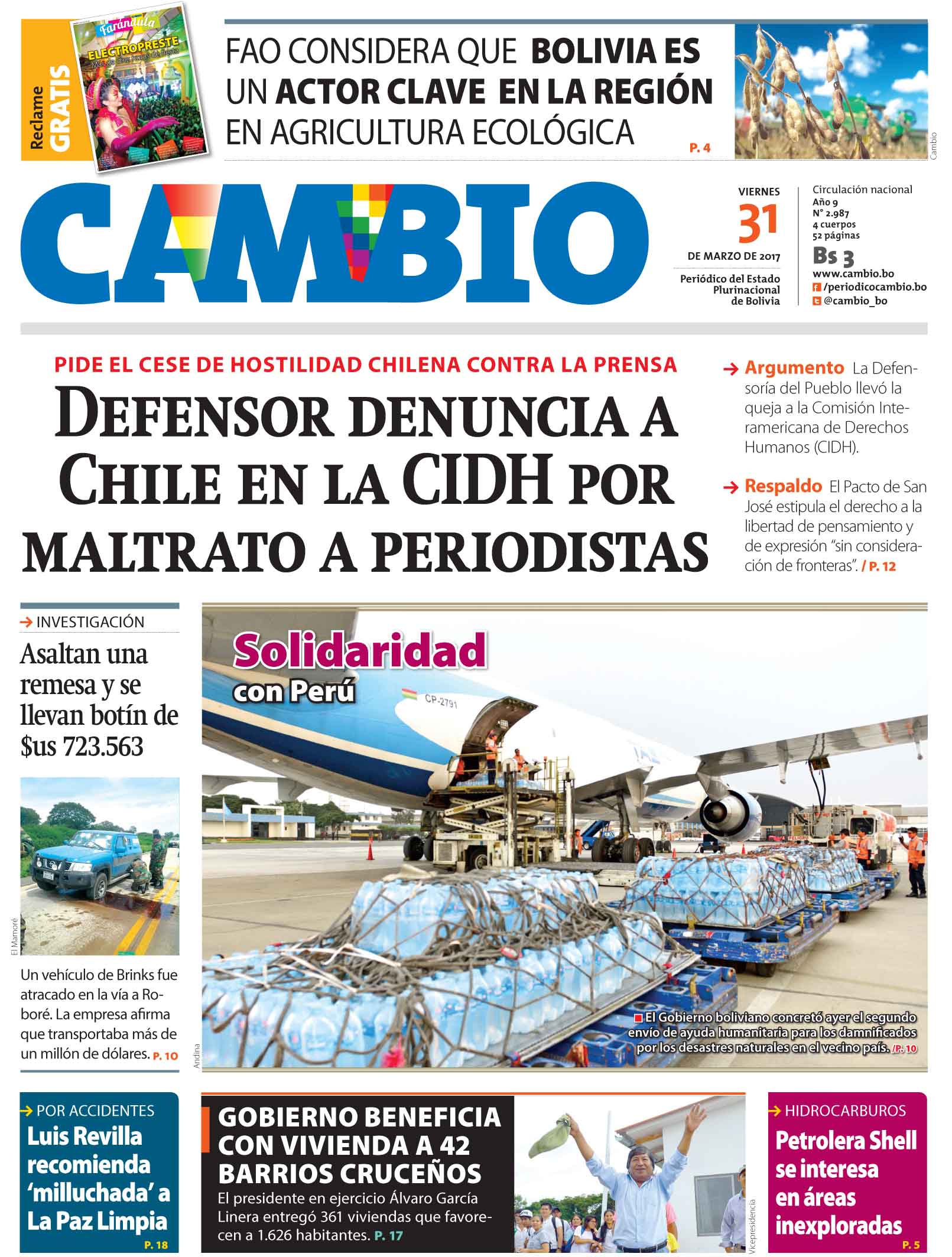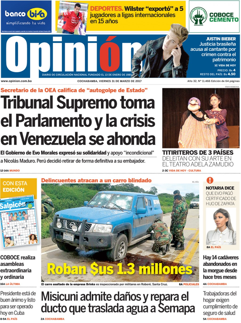 Portadas de periódicos de Bolivia del viernes 31 de marzo de 2017