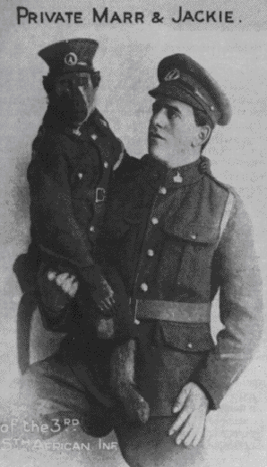Un mono sudafricano fue encontrado por Albert Marr un poco antes de la primera guerra mundial. Al llegar la guerra, Albert se enlistó en el ejército, llevando con él a Jackie, el mono, quien se hizo amigo de todos los soldados. Además de entretenerlos con sus curiosidades, Jackie los alertaba del enemigo y también estuvo en combate. Al terminar su servicio se le concedió una medalla por su valentía. Finalmente Jackie fue dado de baja y vivió en su granja hasta 1921.