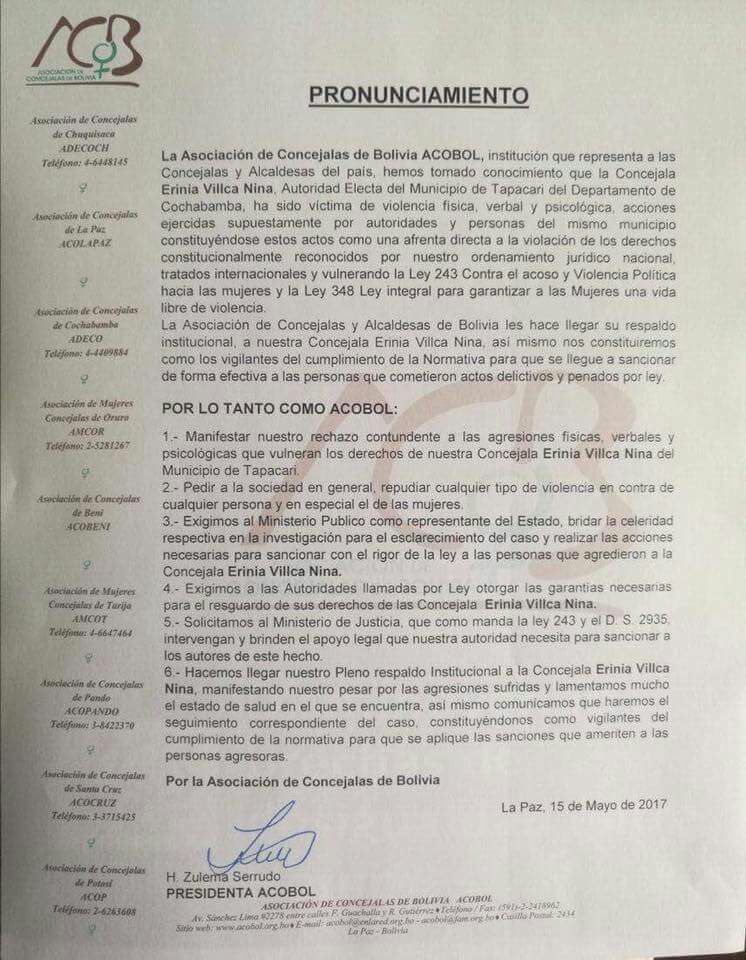 “Ignacio Mendoza se ha abalanzado sobre mí con puñetes y rodillazos en mi cabeza y cuerpo, intentó sacarme mi ropa interior a la fuerza (…) el Alcalde Severino Vargas les dijo que me sigan golpeando y dijo: “De una vez violaremos a estas mujeres putas, perras, desgraciadas…”, relató la víctima,Imagen ilustrativa.La Paz, 16 de mayo (ANF).- La concejala Erinia Villca Nina del Municipio de Tapacarí, Cochabamba, denunció haber sido víctima de una brutal golpiza de parte del presidente del Concejo Municipal, en presencia del propio Alcalde que amenazaba con violarla. Luego fue abandonada en un río junto a otra concejala.“Ignacio Mendoza se ha abalanzado sobre mí con puñetes y rodillazos en mi cabeza y cuerpo, intentó sacarme mi ropa interior a la fuerza, al extremo de romperlo todo, me gritaba que me mataría, le dijo a la Eugenia Romero que me pegue y ella me agarró de los cabellos lanzándome al suelo… el Alcalde Severino Vargas les dijo que me sigan golpeando y dijo: “De una vez violaremos a estas mujeres putas, perras, desgraciadas…”.Ese es un fragmento del testimonio de la concejala Villca Nina que, según su relato, cerca de la medianoche del pasado 5 de mayo fue víctima de acoso y violencia física y psicológica de parte de las máximas autoridades del gobierno y legislativo municipal y de una funcionaria edil.“El acoso, la golpiza y el amedrentamiento duró cerca de tres horas, hasta las 3 de la mañana”, relató a ANF Feliciana Choque, hija de la víctima, “hasta que fueron tiradas en un río y, desde allí, caminaron hasta ocultarse en una casa abandonada”.Por su parte, Toribia Lero, vicecoordinadora de la CAOI (Coordinadora Andina de Naciones Indígenas), informó que “la denuncia fue presentada el 8 de mayo ante la Fuerza Especial de Lucha contra la Violencia (FELCV) de Quillacollo, pero a la fecha la fiscalía no ha abierto la causa”.La denuncia está respaldada por el testimonio de la concejala, Elizabeth Ureña, que también recibió los golpes de Mendoza y fue amedrentada con las amenazas de violación que lanzaba el Alcalde mientras azuzaba a los golpeadores.El hecho no se conoció hasta ahora debido a que, luego de presentar la denuncia, la víctima fue hospitalizada en un centro de salud privado en vista que le negaron la atención médica en la Caja Nacional de Salud, dijo Lero a ANF.La agresión ocurrió cuando una delegación del Municipio de Tapacarí, integrada por las concejalas Villca Nina y Ureña, el Alcalde, el Presidente del Concejo, y la encargada de limpieza del municipio y novia de este último, Eugenia Romero, retornaba de un campeonato de fútbol en una de las comunidades.La animadversión contra las concejalas se habría iniciado porque se negaron a beber con las autoridades municipales. Esperaron por la movilidad que las debía llevar de retorno porque también los choferes se sumaron al convite del Alcalde, y cuando pidieron bajar a medio camino de la ruta hacia Tapacarí para continuar camino a pie hacia sus comunidades, “fueron insultadas, amenazadas y golpeadas por Ignacio Mendoza y su novia, Eugenia Romero”, relató la hija de la víctima.La asambleísta departamental de Cochabamba, Lineth Villarroel, lamentó que a 11 días del hecho y cursando una denuncia en la FELCV “el Ministerio Público no haya tomado acción y los agresores continúen ejerciendo sus funciones impunemente” y anunció que en coordinación con las organizaciones de mujeres vigilarán que se sancione a los responsables. Exigirán que “se activen las medidas de protección para la víctima, porque los agresores la visitaron en el hospital y la amenazaron con destituirla en caso de no retirar su denuncia”.La Asociación de Concejalas de Bolivia (ACOBOL) emitió un pronunciamiento en el que rechaza la agresión física, verbal y psicológica contra la concejala, exige al Ministerio Público celeridad en la investigación para el esclarecimiento del caso, garantías para el resguardo de la seguridad y los derechos de la víctima y solicita la intervención del Ministerio de Justicia para que le brinde apoyo legal.Este hecho se suma a las más de 270 causas por acoso y violencia política hacia mujeres en ejercicio de la función pública, que están en proceso en todo el país, según reportes del Ministerio de Justicia a diciembre 2016.Pese a la vigencia de la Ley 243 Contra el Acoso y la VIolencia Polìtica hacia las mujeres, a la fecha no ha culminado ninguno de los procesos instaurados contra los autores intelectuales y materiales de casos de este tipo de delitos que incluso cobraron la vida de varias mujeres concejalas, especialmente de municipios rurales.Uno de los casos emblemáticos de violencia polìtica contra mujeres electas para cargos municipales es el de Juana Quispe Apaza, concejala del Muncipio de Ancoraimes, que el 13 de marzo de 2012 fue encontrada sin vida a orillas del río Orkojahuira, con signos de estrangulamiento. Este crimen continúa impune.