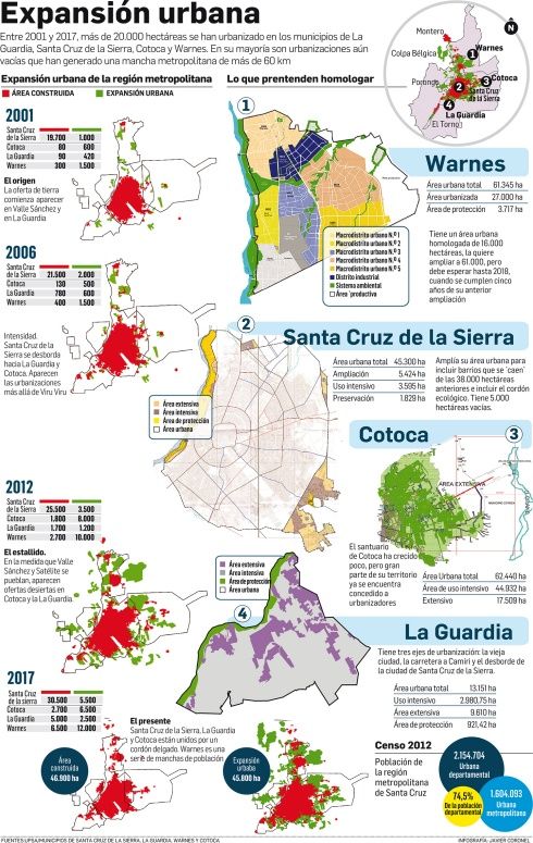 Desde la espalda de La Guardia, el área metropolitana mide 65 kilómetros. Más de la mitad de lo urbanizado está vacío y el resto, con baja densidad. La Guardia tenía un manejo más racional, hasta que entró en crisis política. Hay problemas de límitesPablo OrtizParece un buen negocio. “En este momento las urbanizaciones están vacías, son nuevas, pero a nosotros como municipio nos conviene que nos paguen los impuestos”, dice Wilfredo Áñez, alcalde de Cotoca. Acaba de enviar su nueva delimitación de área urbana a La Paz, para que el Viceministerio de Autonomías le autorice una superficie de 62.440 hectáreas, casi un 50% de lo que tendrá Santa Cruz de la Sierra una vez consiga que le aprueben su nueva ampliación y se vaya hasta las 45.300 hectáreas. La diferencia es que mientras la ciudad capital tiene una densidad de 34 habitantes por hectárea, Cotoca dispone de dos hectáreas loteadas por cada habitante.Parece un buen negocio en Warnes, que en 2013 aprobó un área urbana que la dejó con 16.000 hectáreas de urbanizaciones, lo cual le daba una densidad de 4,8 habitantes por hectárea, pero ahora, mediante ley municipal, ha consolidado un radio urbano de 61.345 hectáreas, que le baja su densidad hasta 1,35 habitantes. Eso, según cuenta Rodrigo Zamorano, director de Catastro de Warnes, le genera recaudación por impuestos de Bs 6 millones por mes, pero también una cuenta por cobrar de más de Bs 1.000 millones de tributos en mora.La Guardia, en cambio, no lo considera un buen negocio. Su alcalde, Jorge Morales, se declara contrario a las urbanizaciones. Así lo asegura Ulises Rocabado, secretario de Planificación de dicho municipio, que explica que han definido un área urbana intensiva de solo 2.980 hectáreas. “No es negocio —dice Rocabado— porque cuando se juntan 10 casitas ya forman una junta vecinal y comienzan a exigir obras que sus impuestos no pueden cubrir”.Sin embargo, su área de ampliación de mancha urbana no coincide con el reporte de un estudio del Instituto Ciudad de la UPSA. Según el análisis de Claudia Canedo, directora de este observatorio, La Guardia ya cuenta con 3.350 hectáreas de urbanizaciones a medio habitar y otras 2.000 vacías. Esto le da una densidad de 5,9 habitantes por hectárea.El único municipio que conforma el área metropolitana que no se muestra afanado por ampliar su mancha urbana es Santa Cruz de la Sierra. Luego de que la intención de pasar de 38.000 hectáreas hasta las 68.000 cosechara críticas, Sandra Velarde, secretaria de Planificación, asegura que el municipio de la capital no quiere ni un centímetro más de tierra del que lo obliga la ley a adjuntar. Así, ha enviado un proyecto de homologación de 7.300 hectáreas, de las cuales 1.829 son de conservación (cordón ecológico del Piraí) y 5.424 son de urbanizaciones ya existentes.
