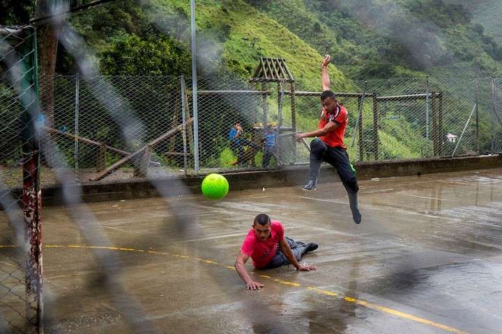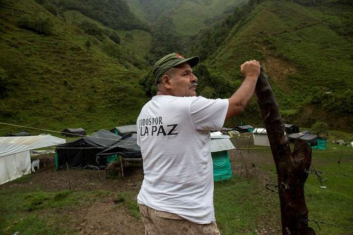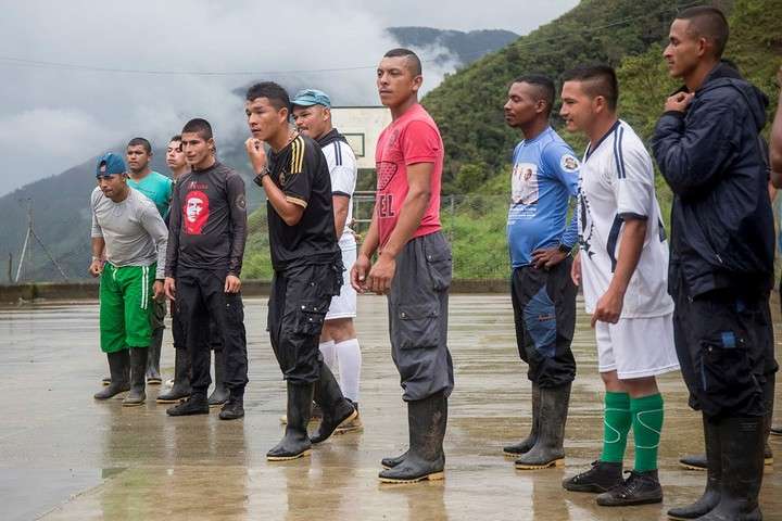 En la espuma jabonosa de una nube, 52 guerrilleros de las Fuerzas Armadas Revolucionarias de Colombia (FARC) se turnan para perseguir una pelota fluorescente que no quiere entrar. Juegan en lo alto de la montaña, al costado del camino de una trocha que es mano y contramano al borde de un precipicio. La canchita queda justo entre el campamento donde limpiaron por última vez sus fusiles y las edificaciones en construcción donde vivirán como civiles, sin uniformes, ni amenazas, ni exigencias extorsivas a los pobladores, cuando se asiente el proceso de paz en Colombia, un país sumergido en la violencia desde hace más de medio siglo. Ellos están, geográficamente, en el purgatorio de la paz.