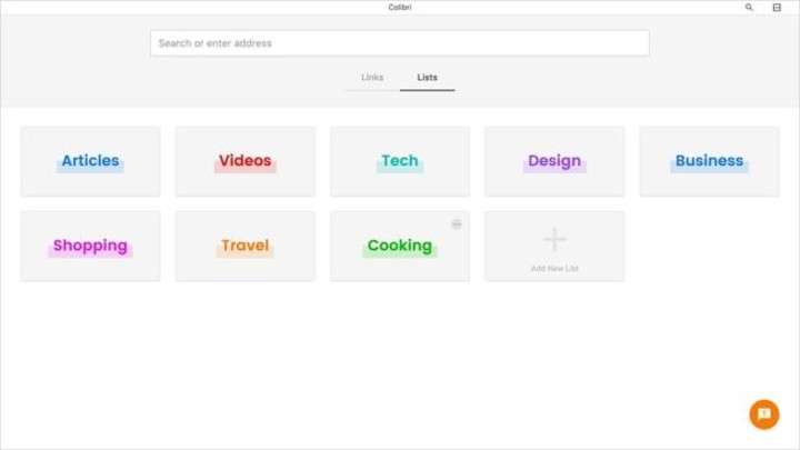Para reemplazar el sistema de pestañas, Colibrí tiene una función para guardar enlaces parecida a los marcadores de otros navegadores web. Estos enlaces se guardan en el apartado oculto «Lists«, y se pueden organizar en categorías. Eso sí, para usar esta función de listas deberás estar registrado con una cuenta de usuario.