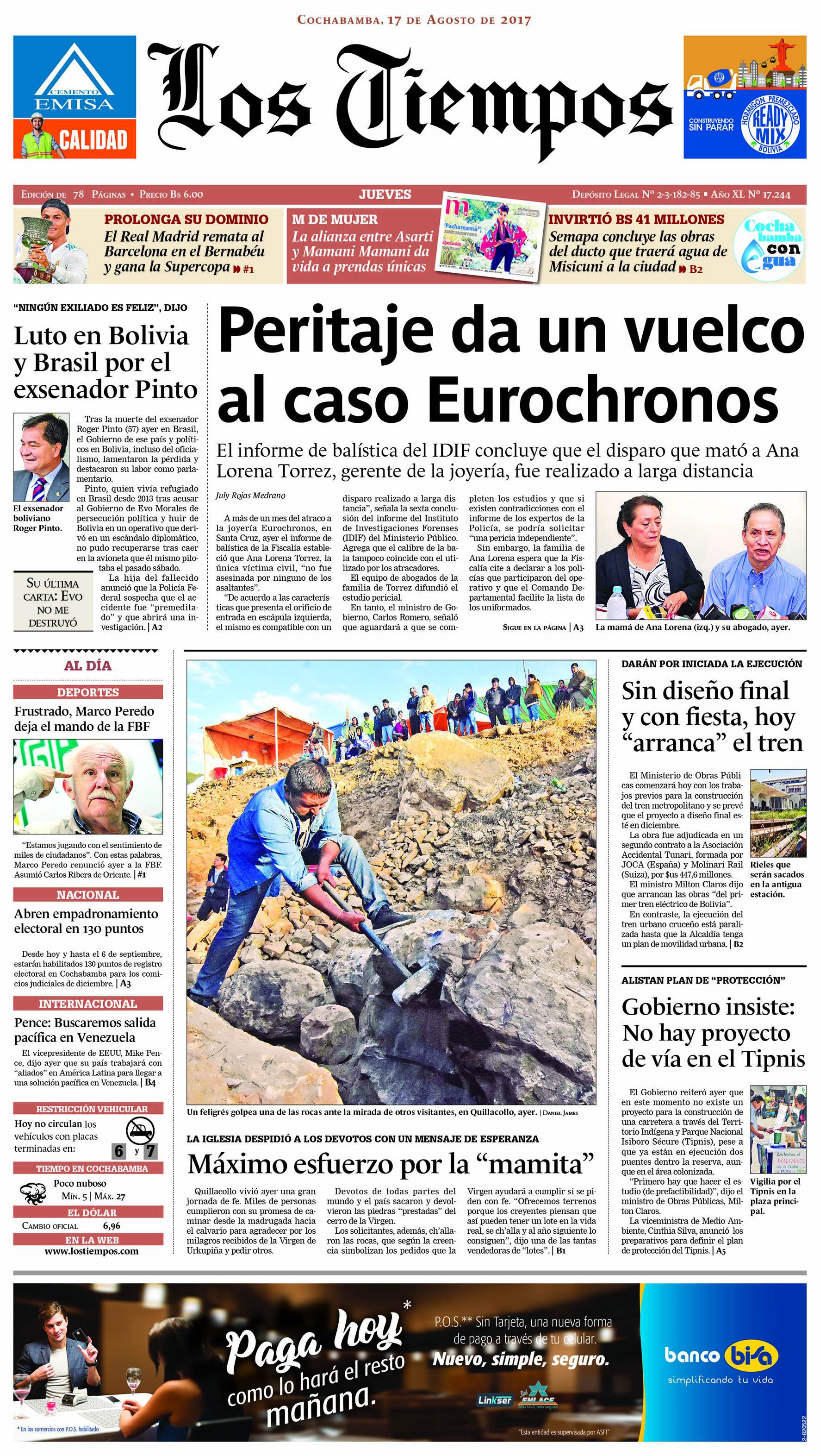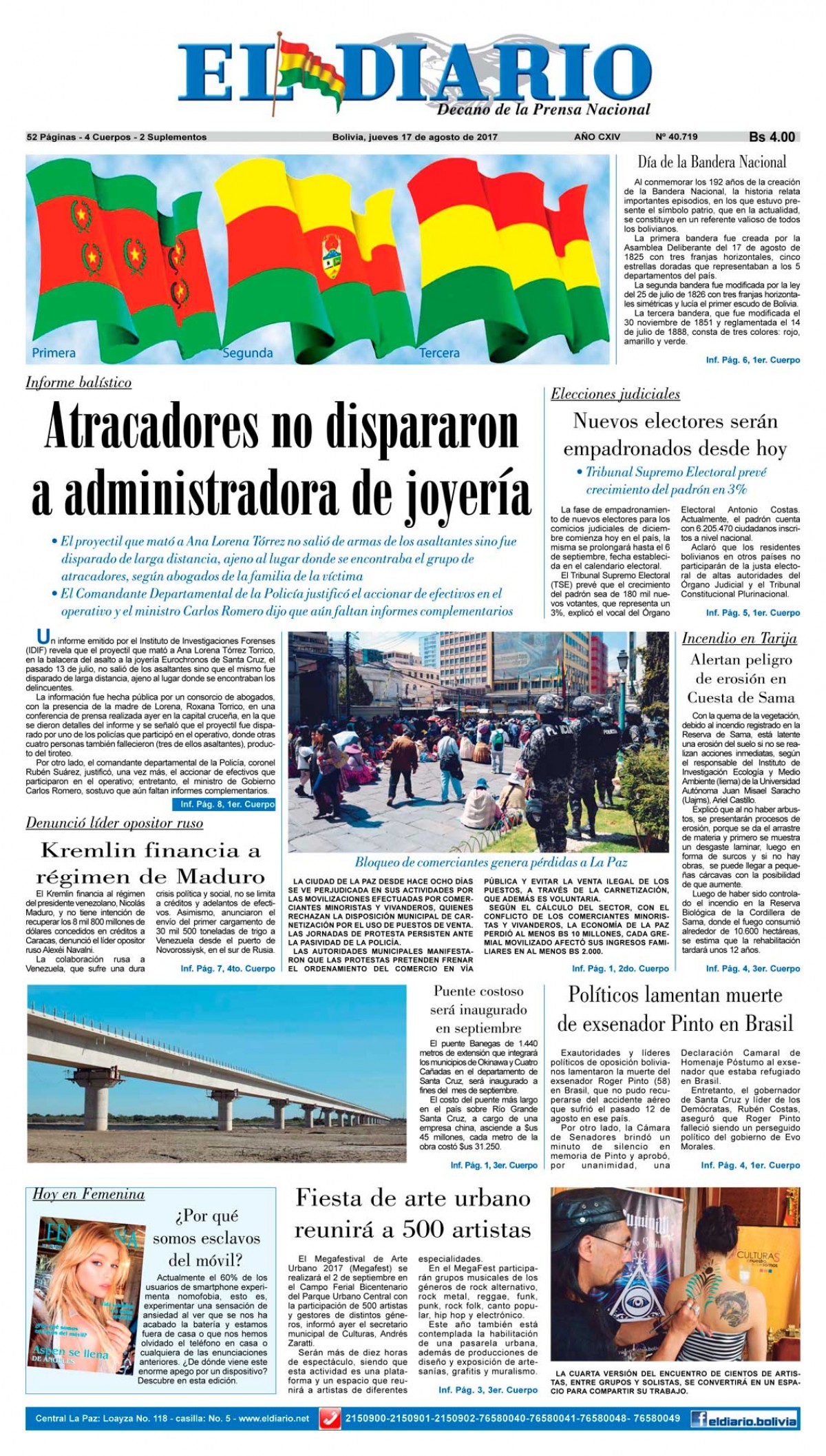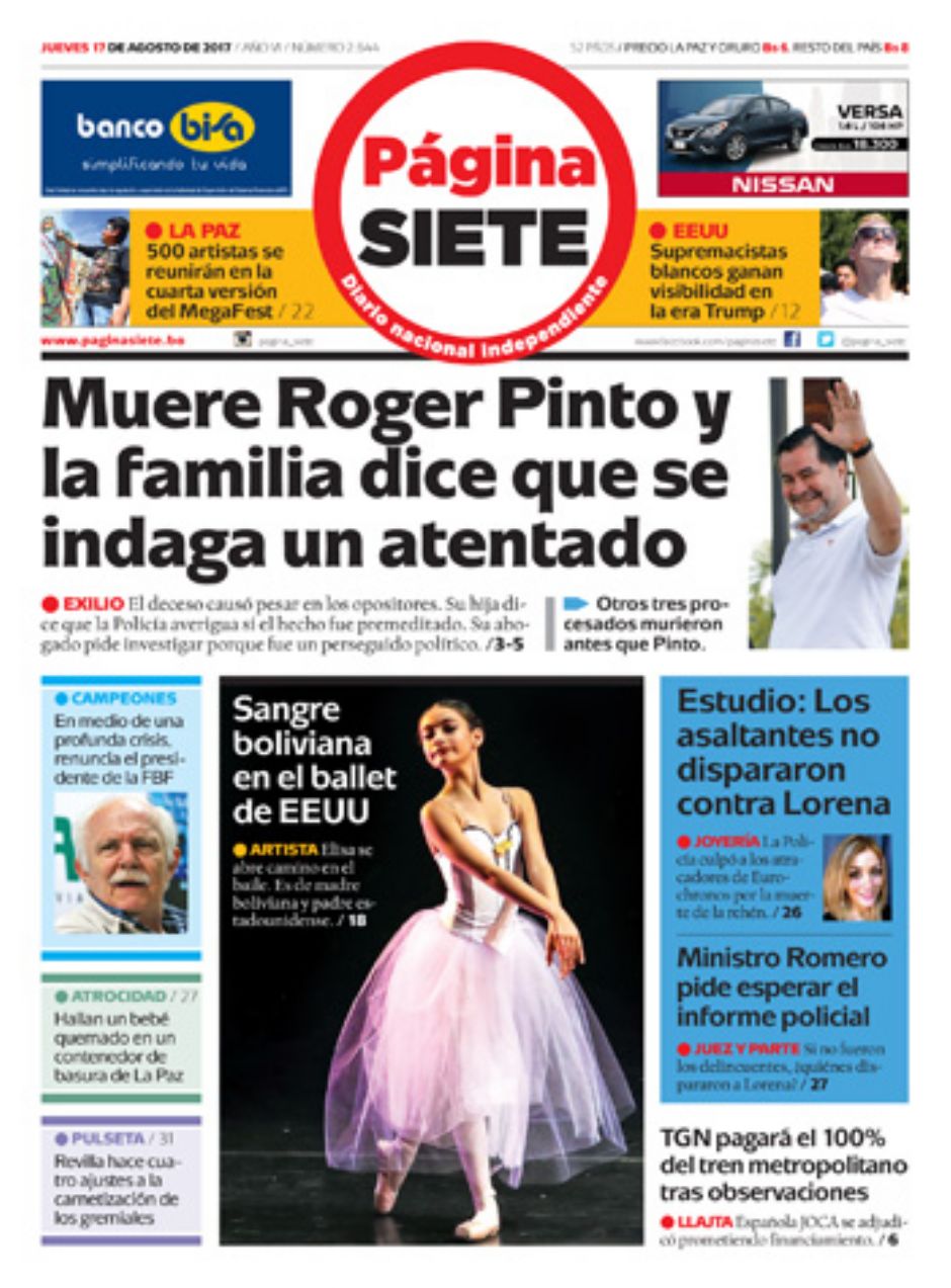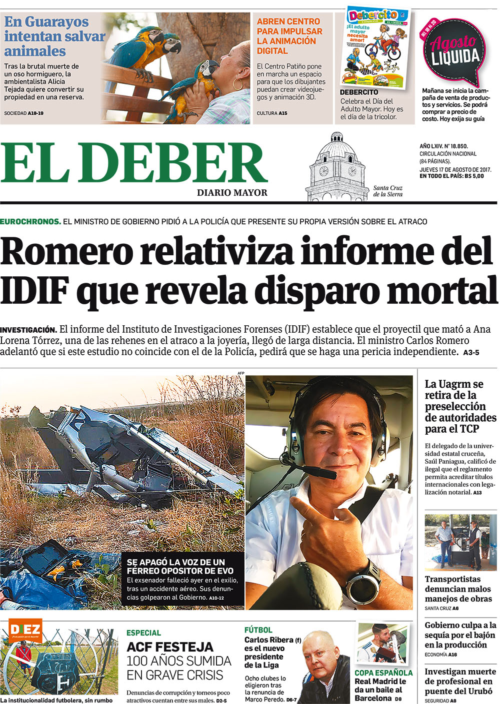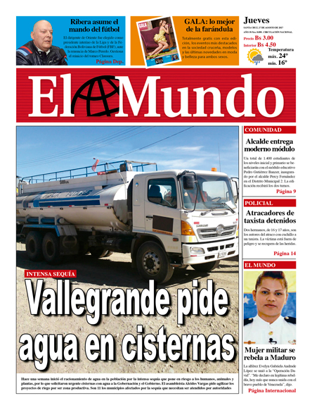 Portadas de periódicos de Bolivia del jueves 17 de agosto de 2017