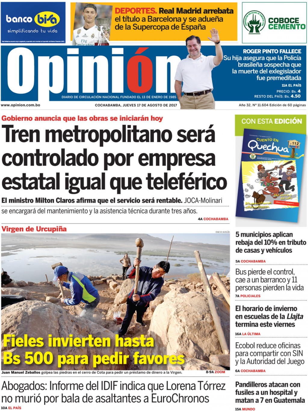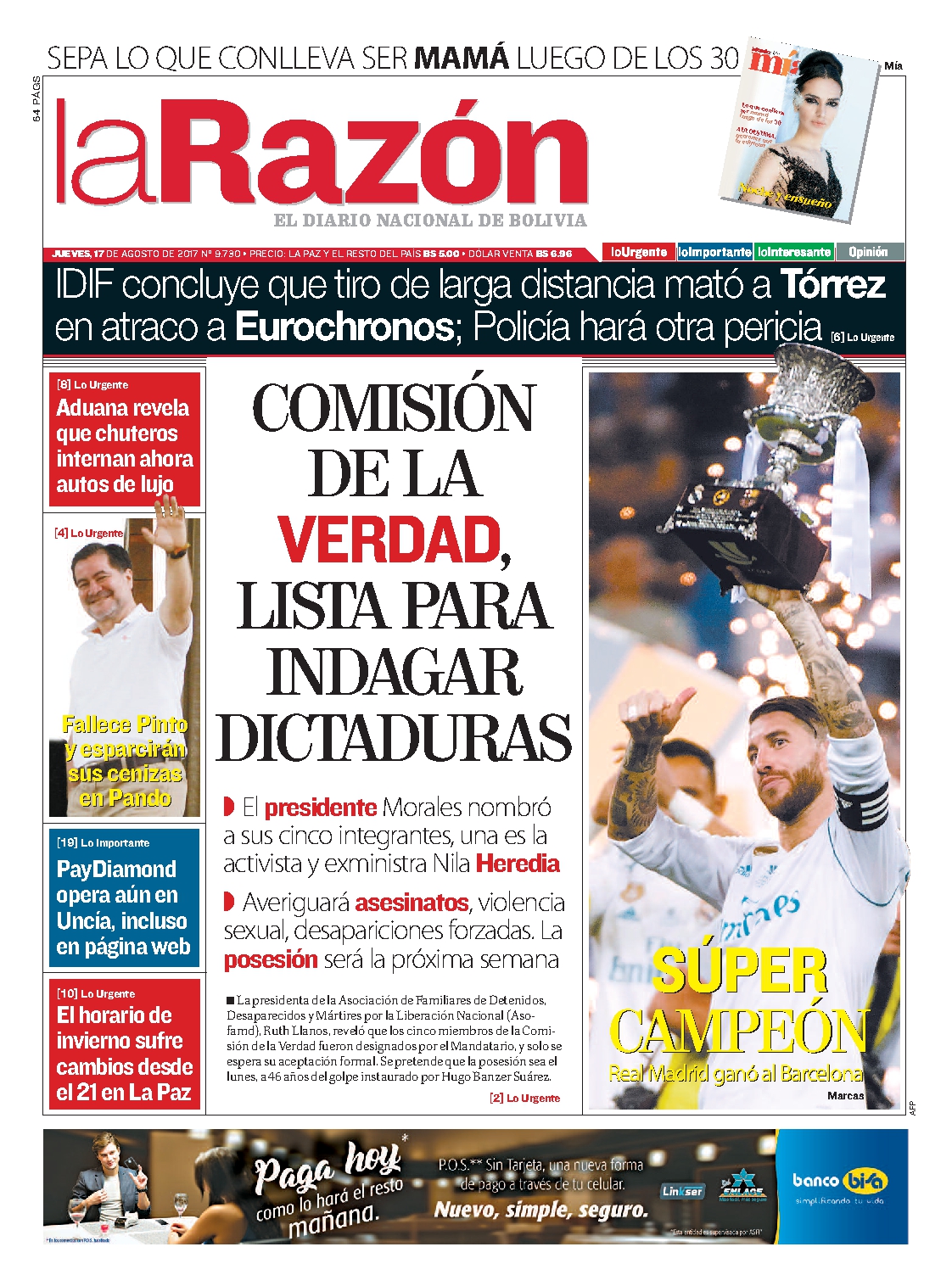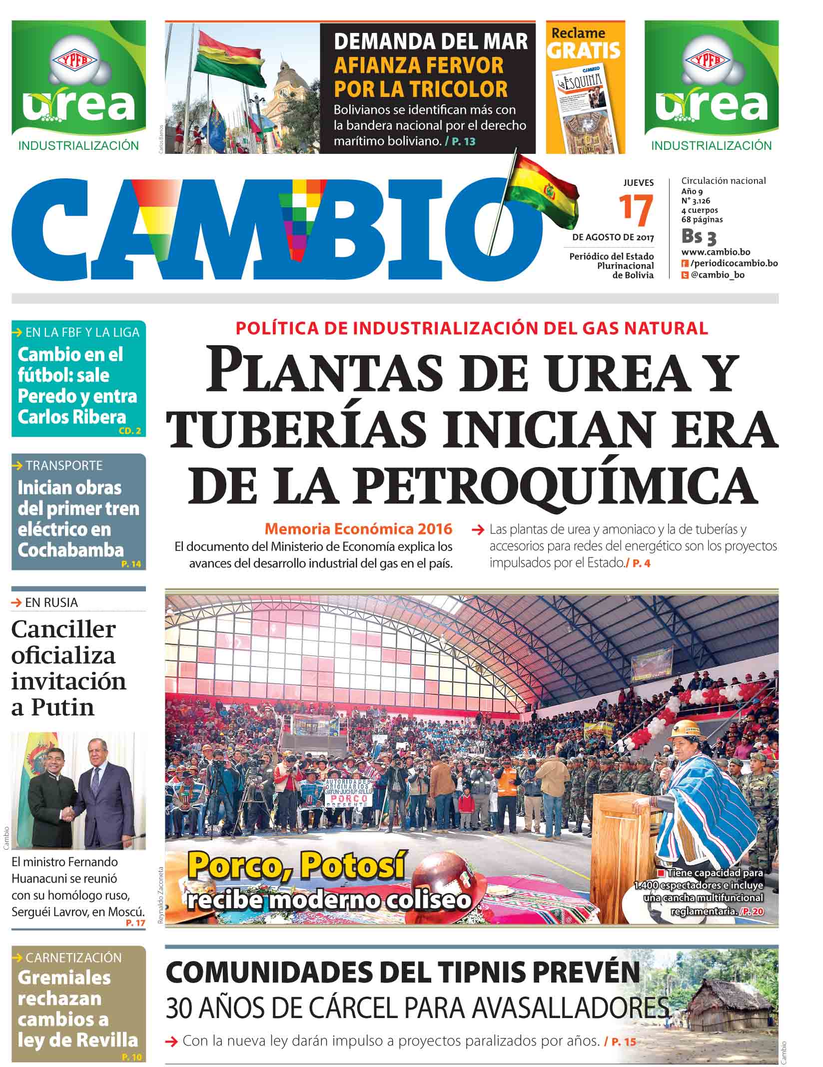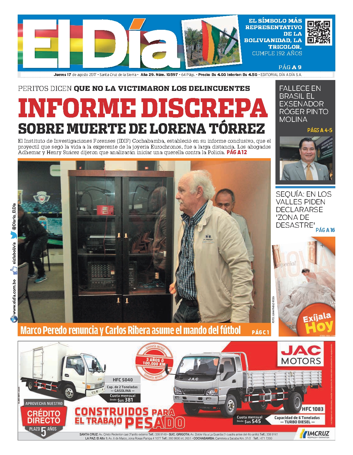 Portadas de periódicos de Bolivia del jueves 17 de agosto de 2017
