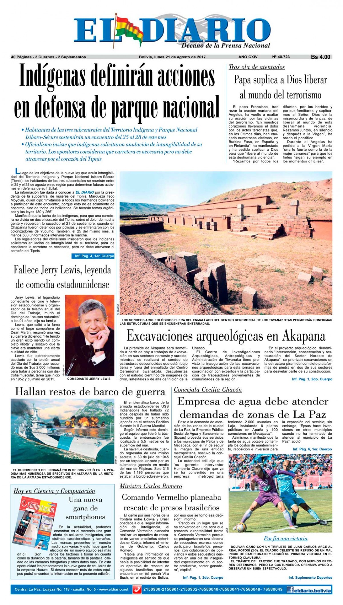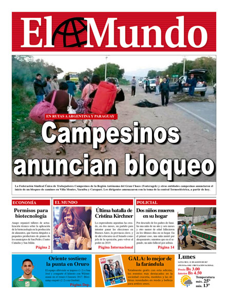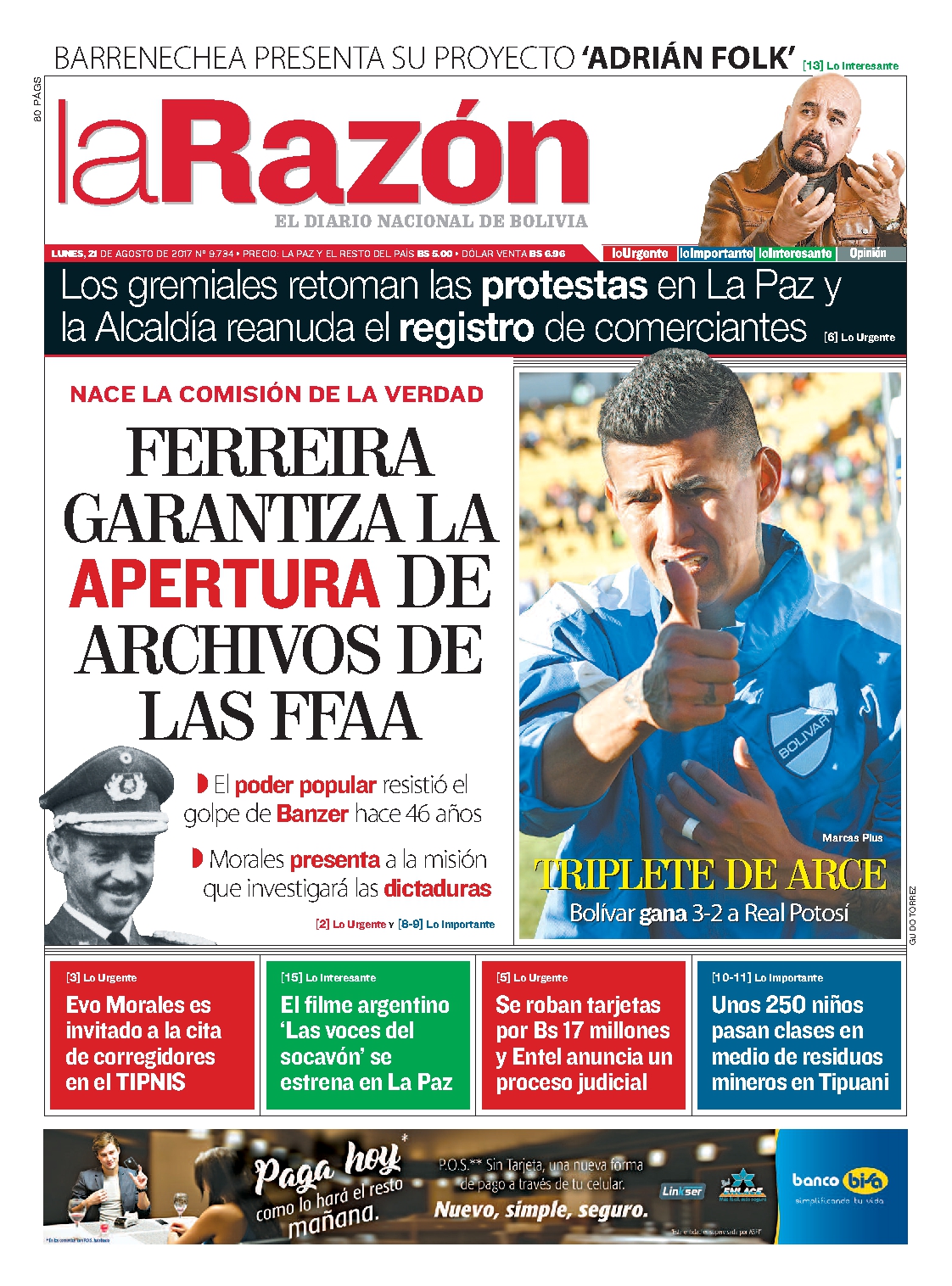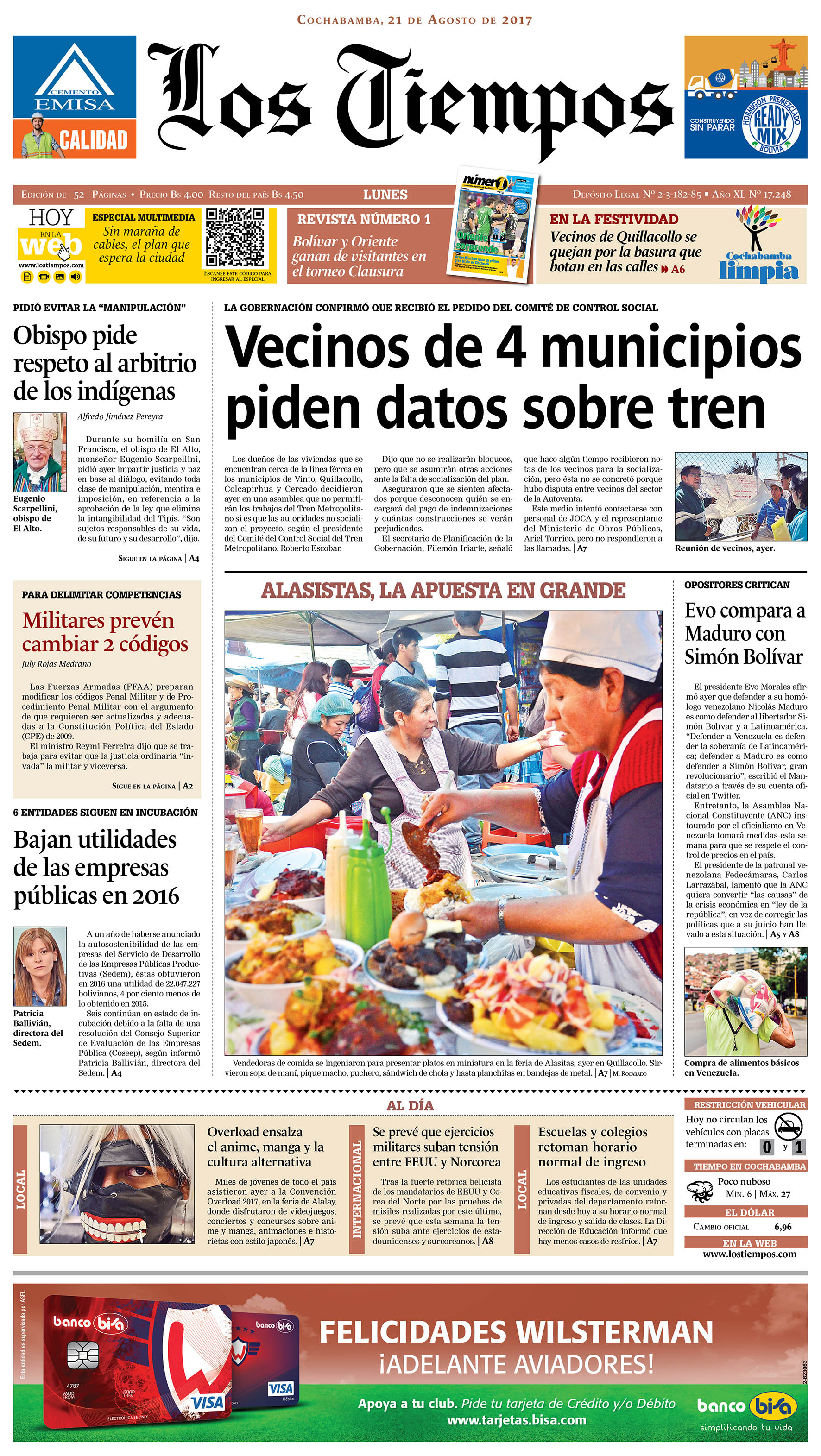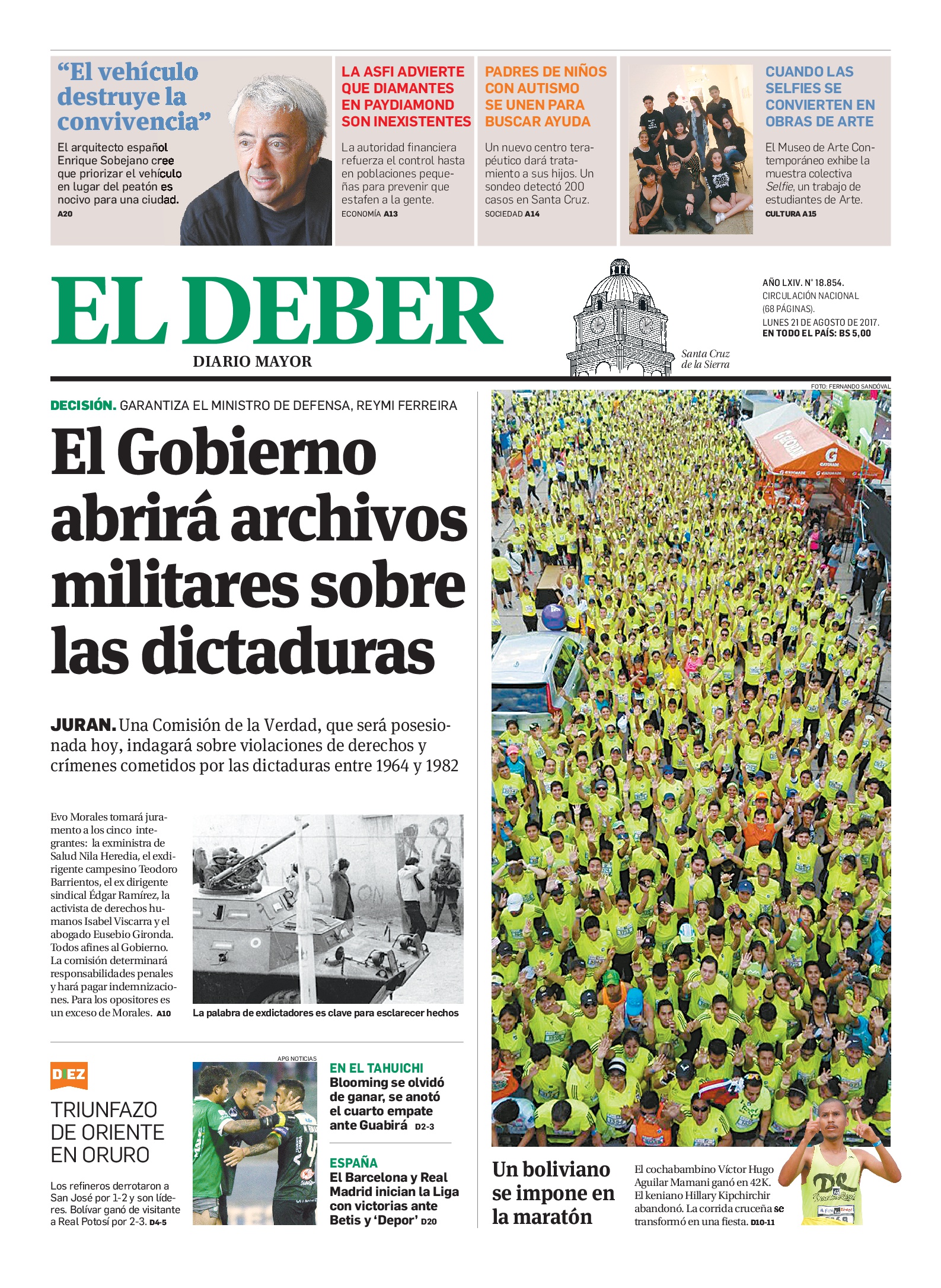 Portadas de periódicos de Bolivia del lunes 21 de agosto de 2017Categorías MonitoreoEtiquetas , Portadas de periódicos 21/08/2017 El Deber – Los Tiempos – El Día – La Razón – Cambio – El Diario – Página Siete – Opinión