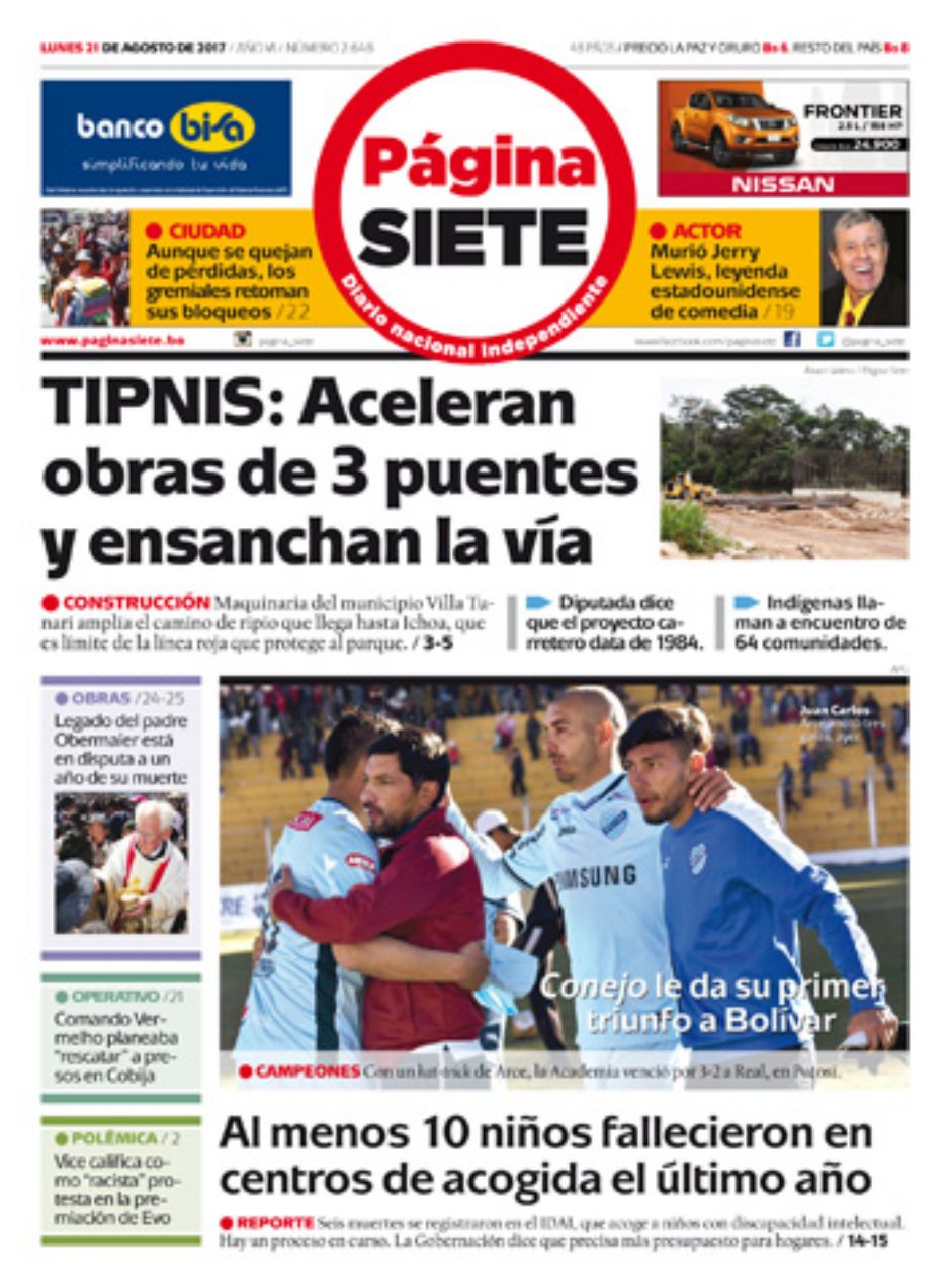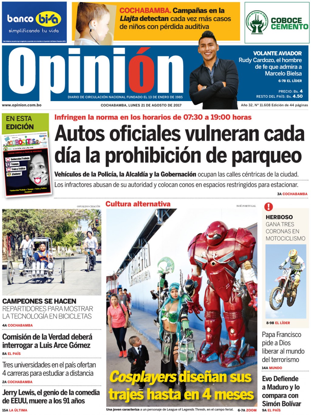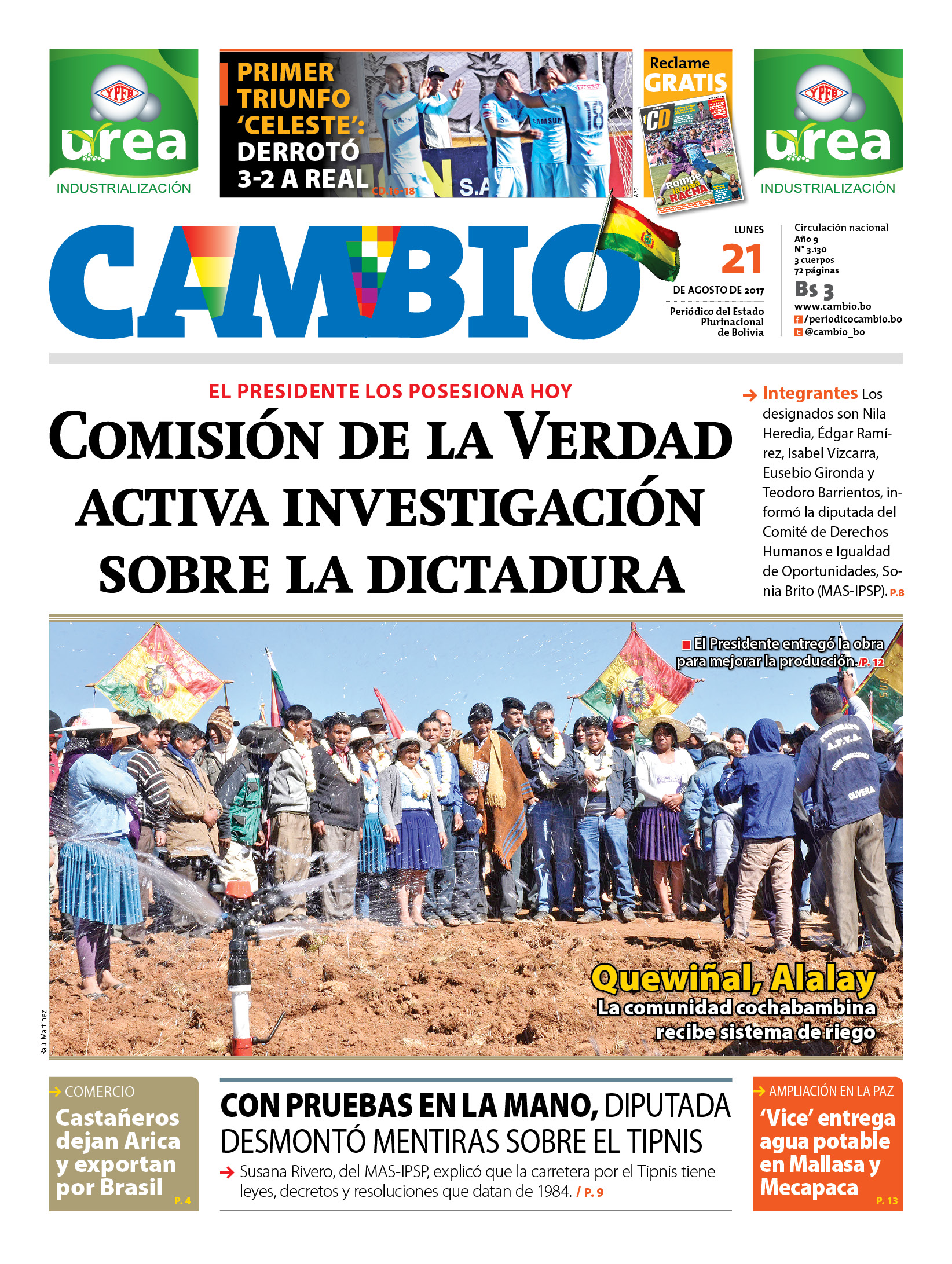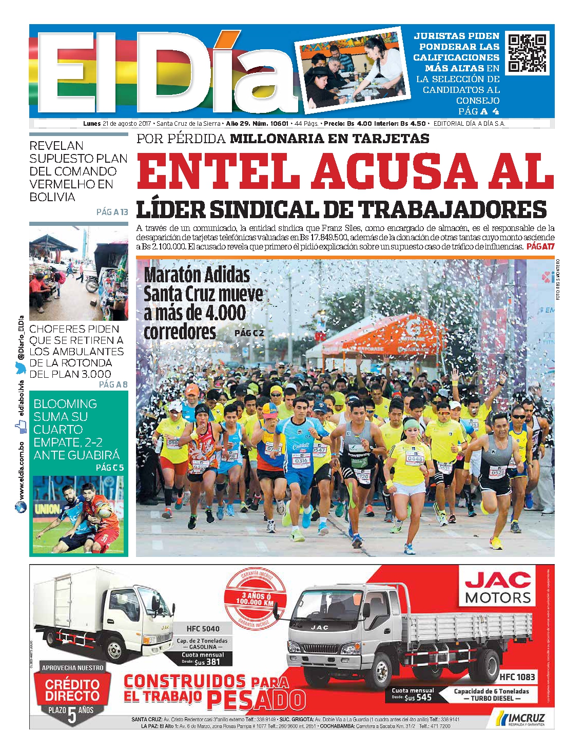 Portadas de periódicos de Bolivia del lunes 21 de agosto de 2017Categorías MonitoreoEtiquetas , Portadas de periódicos 21/08/2017 El Deber – Los Tiempos – El Día – La Razón – Cambio – El Diario – Página Siete – Opinión