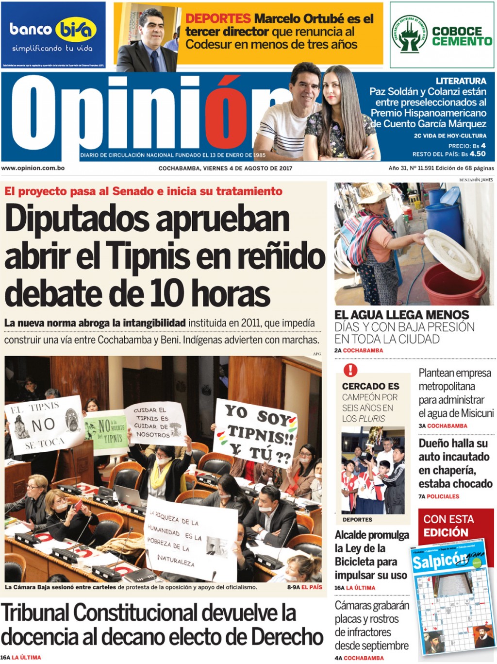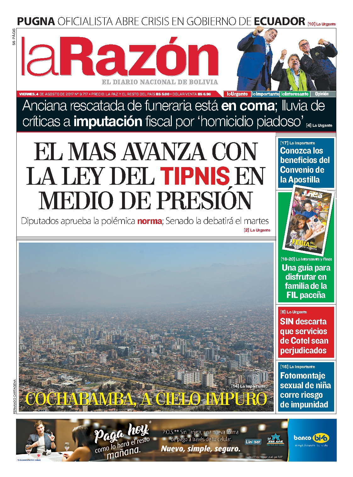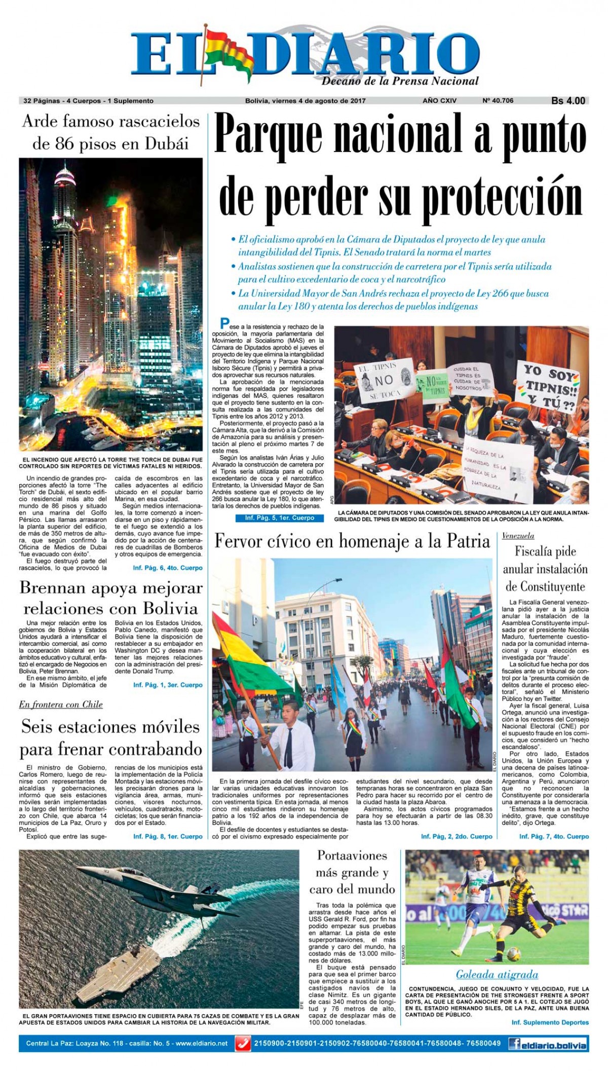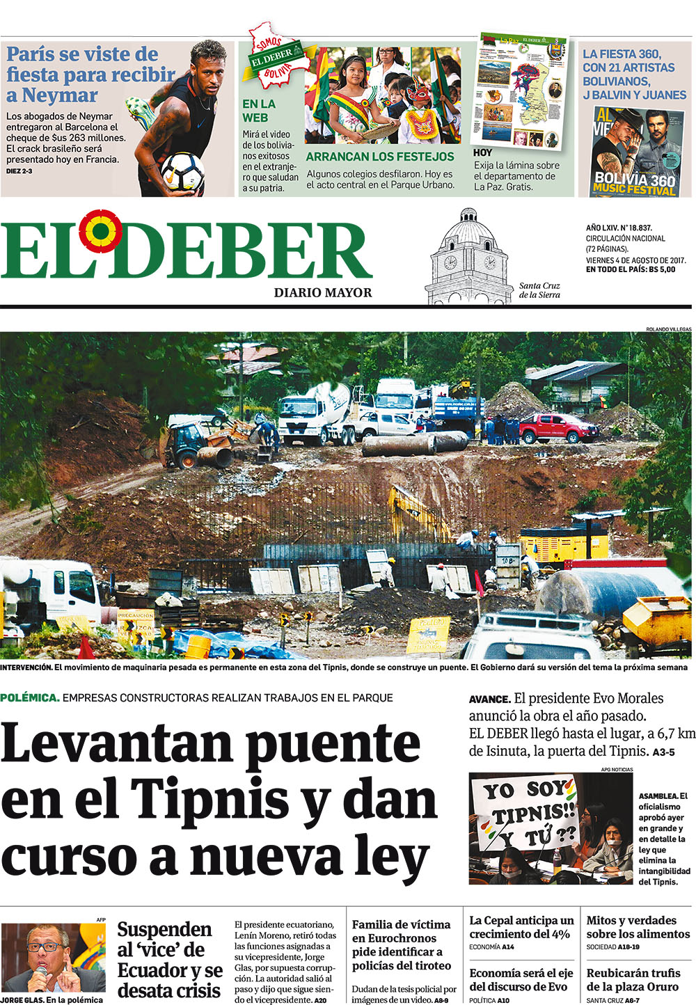 Portadas de periódicos de Bolivia del viernes 4 de agosto de 2017