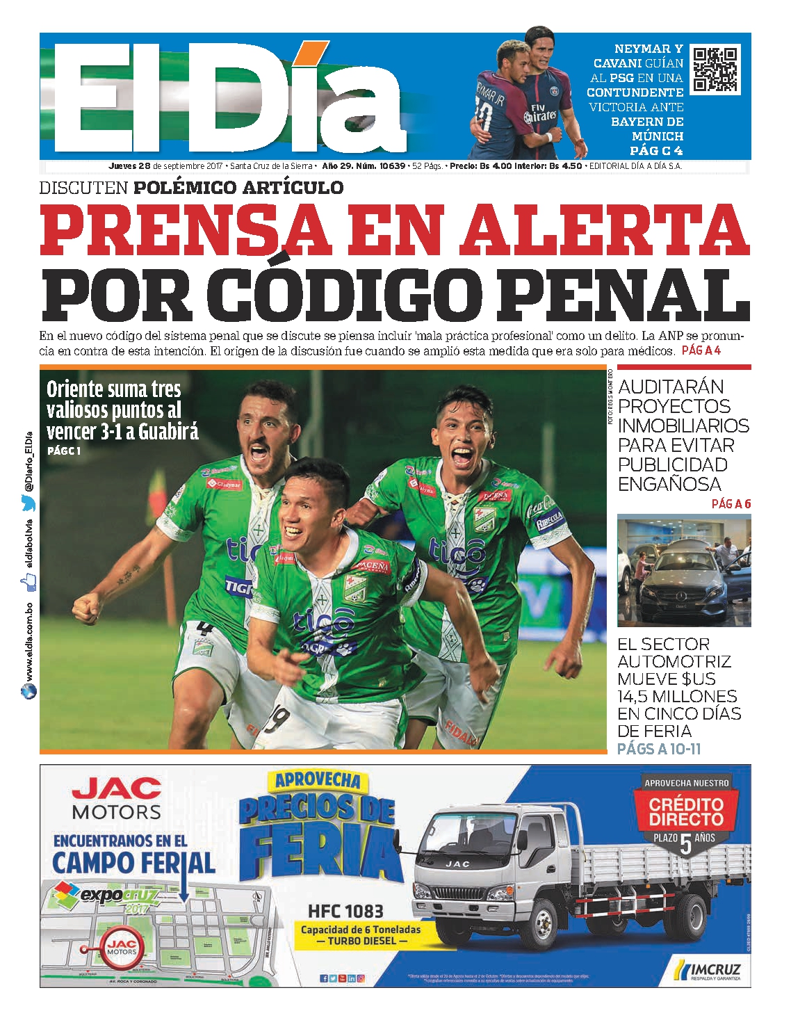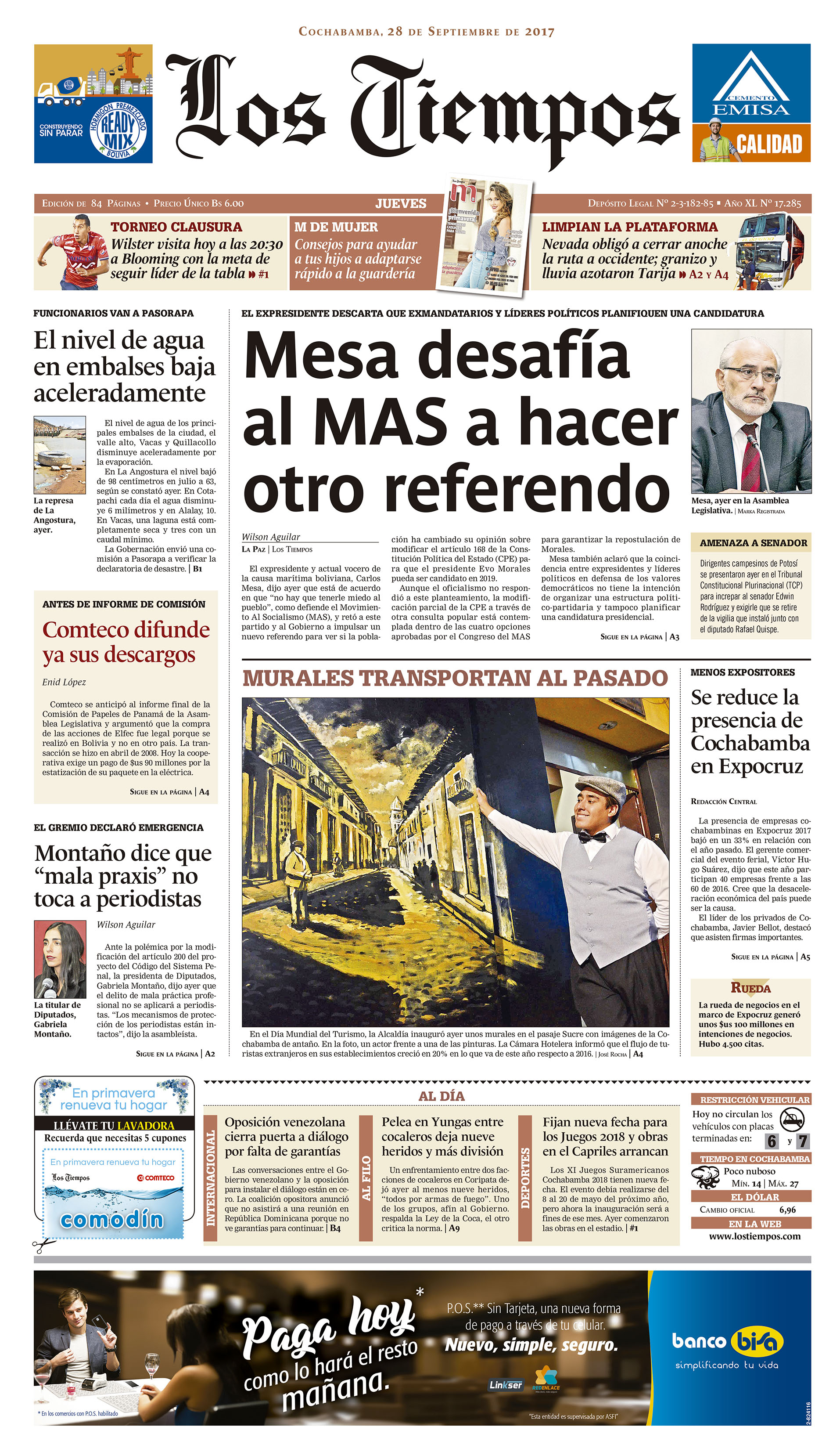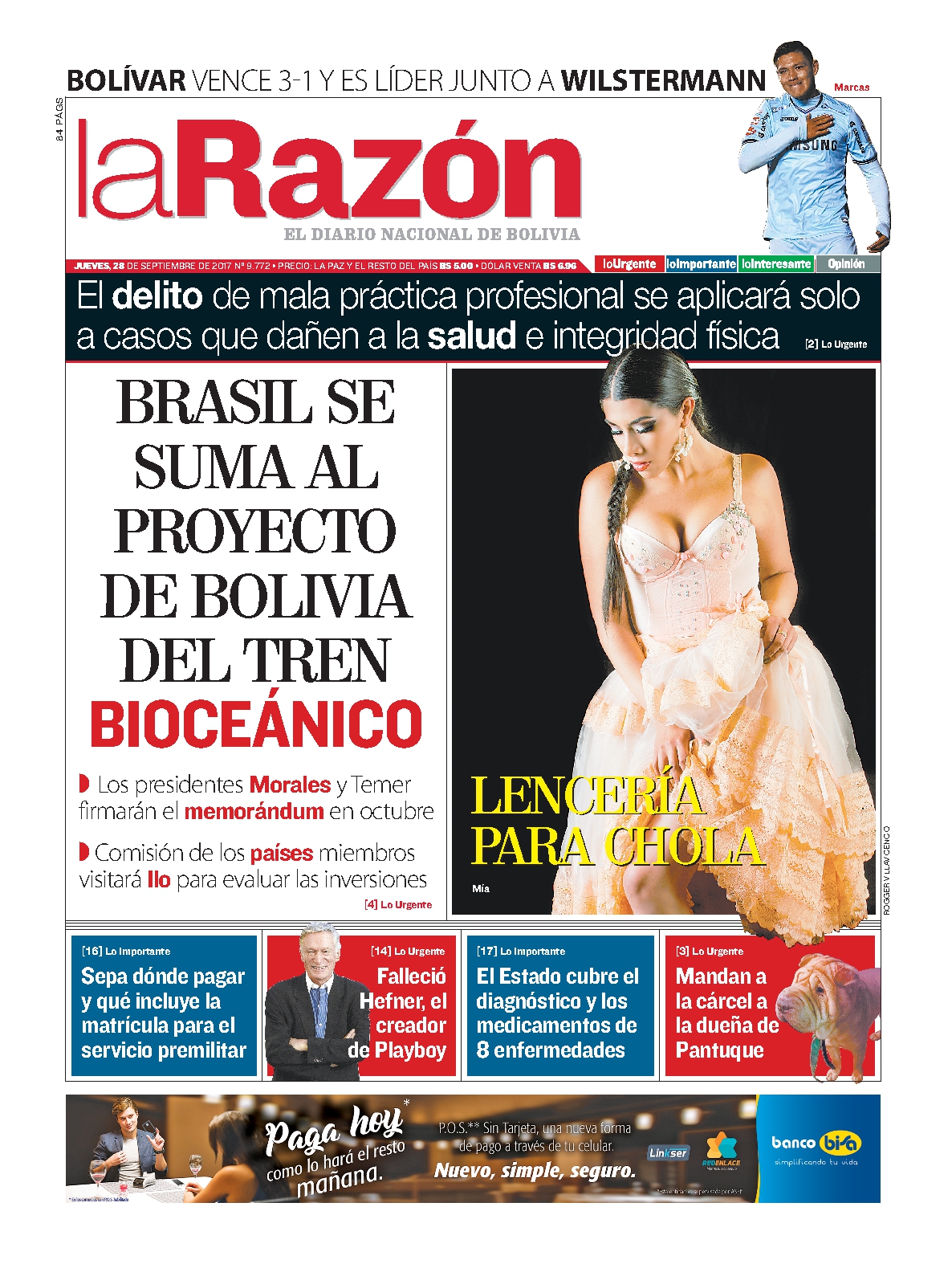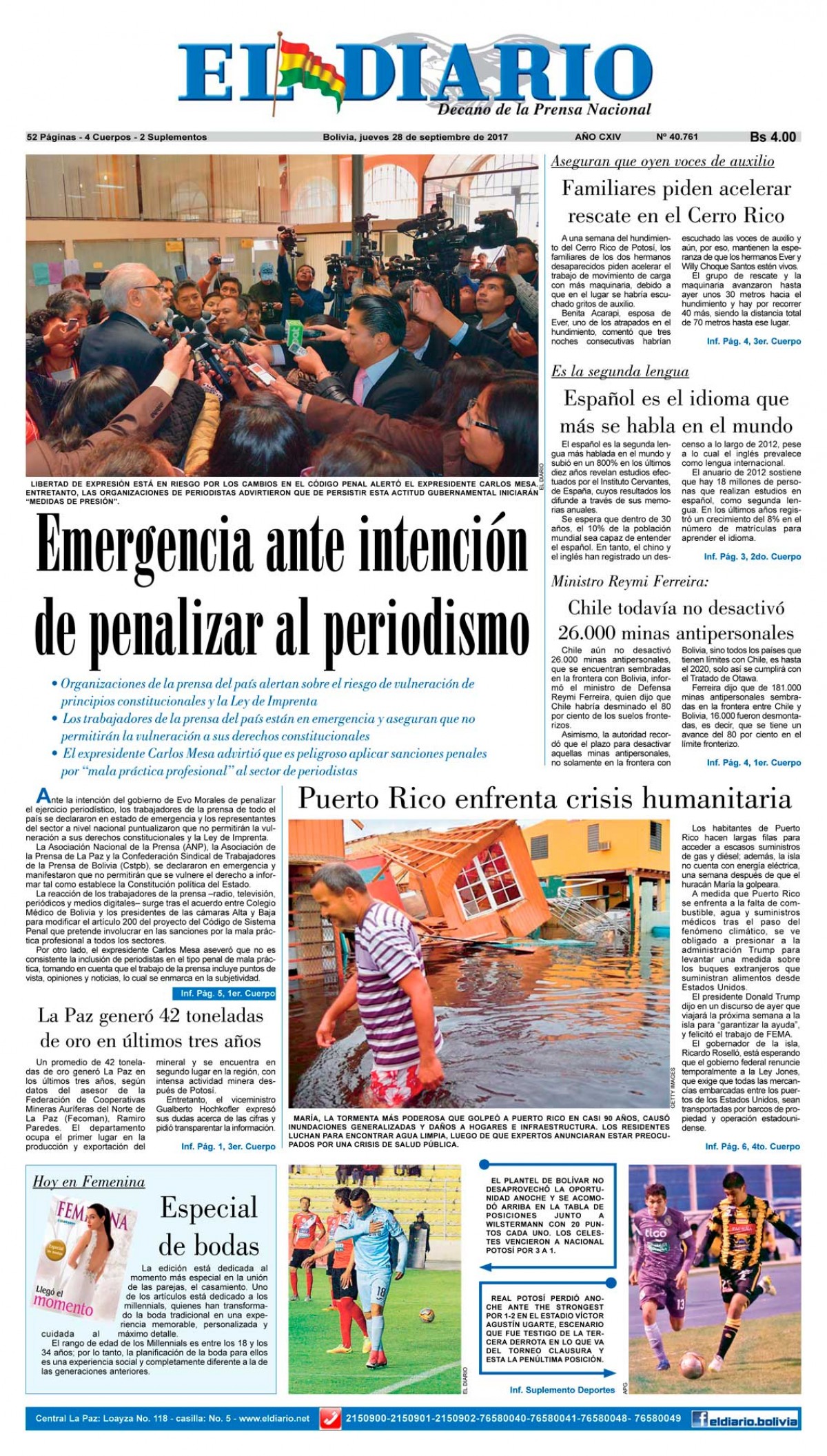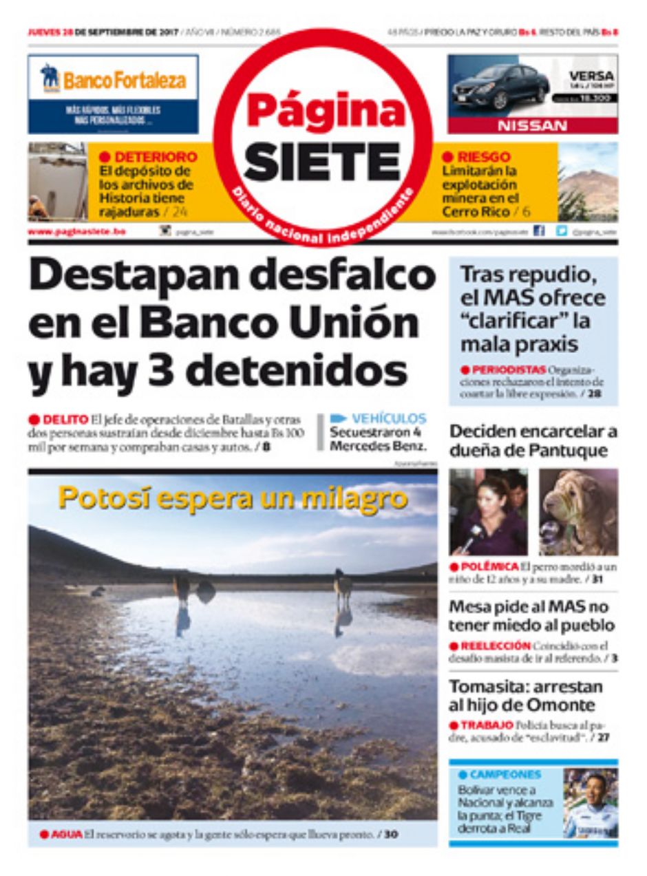 Portadas de periódicos de Bolivia del jueves 28 de septiembre de 2017