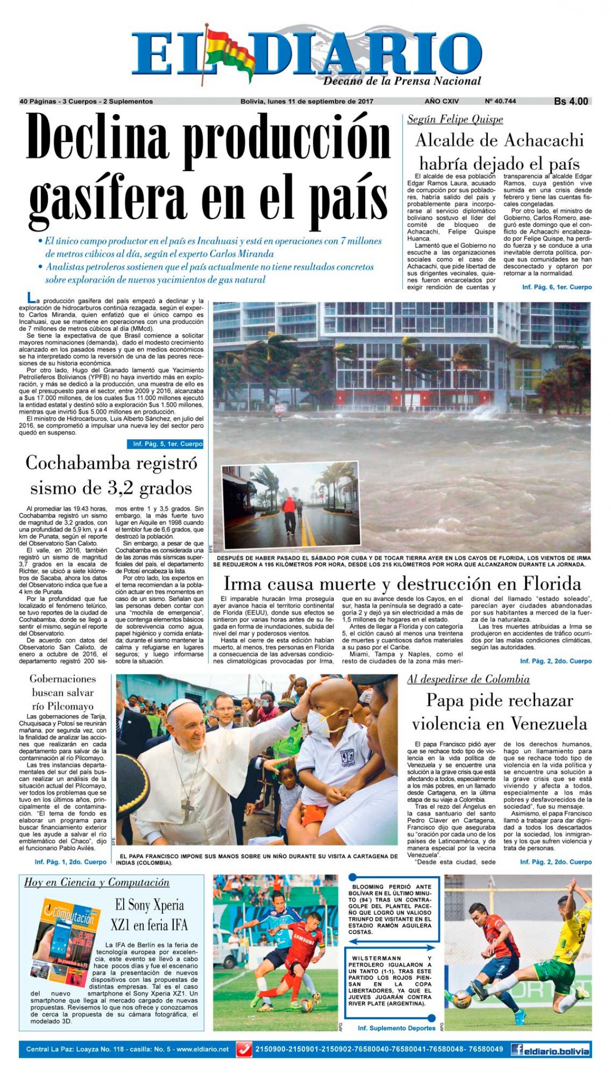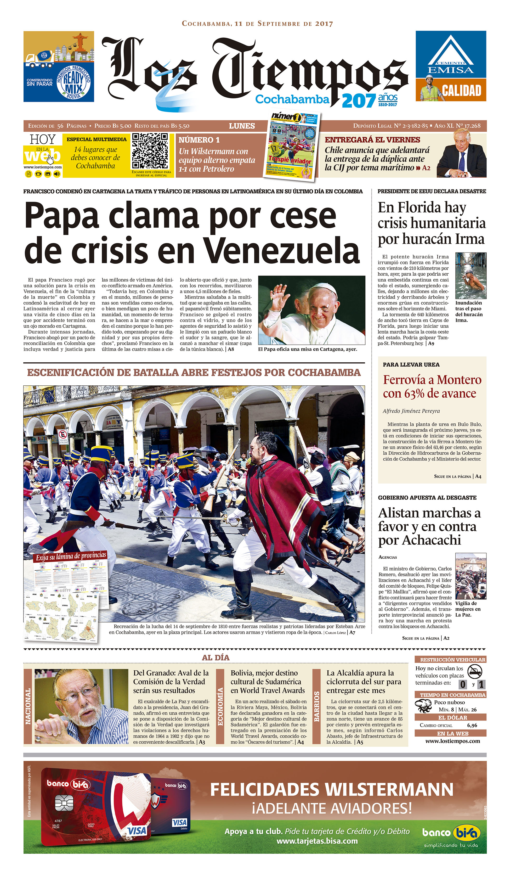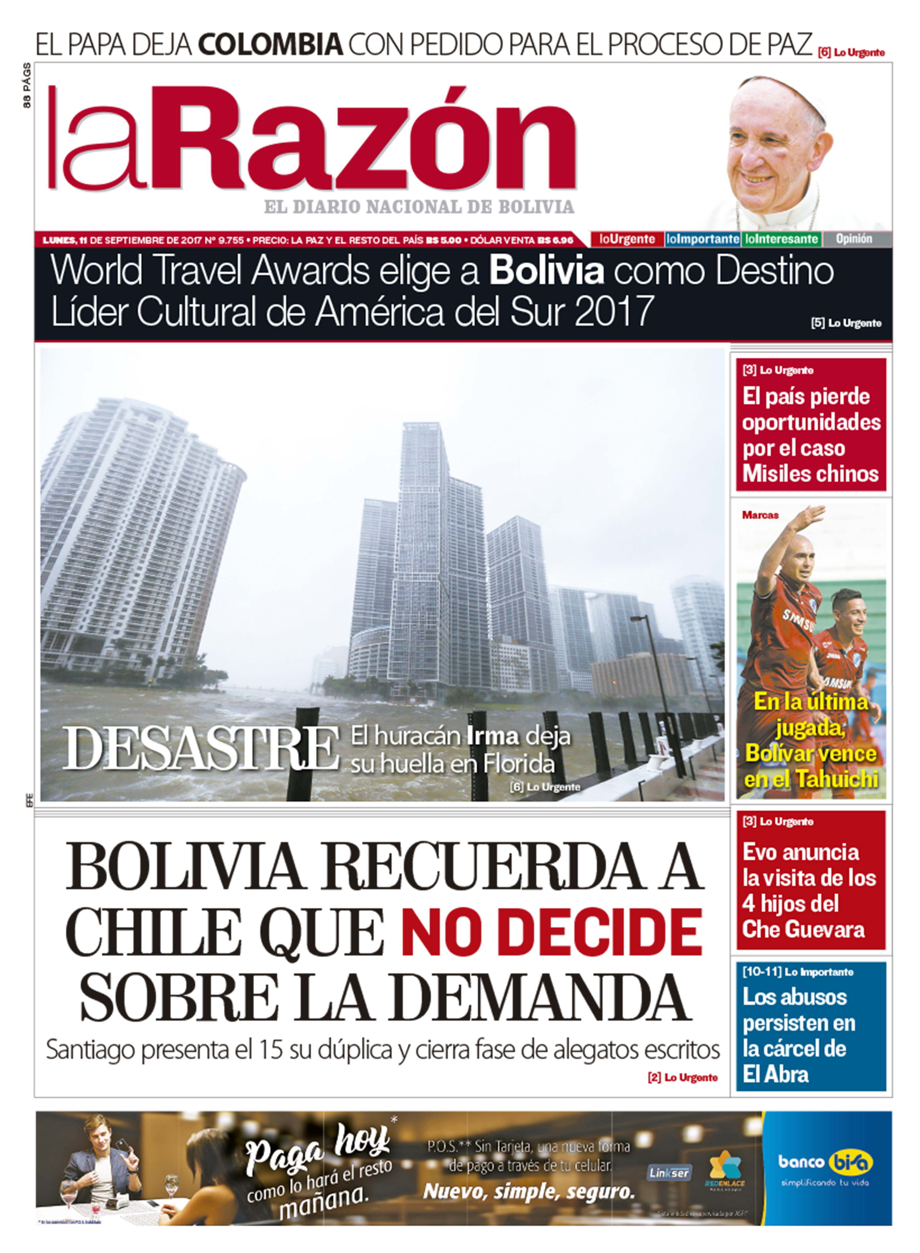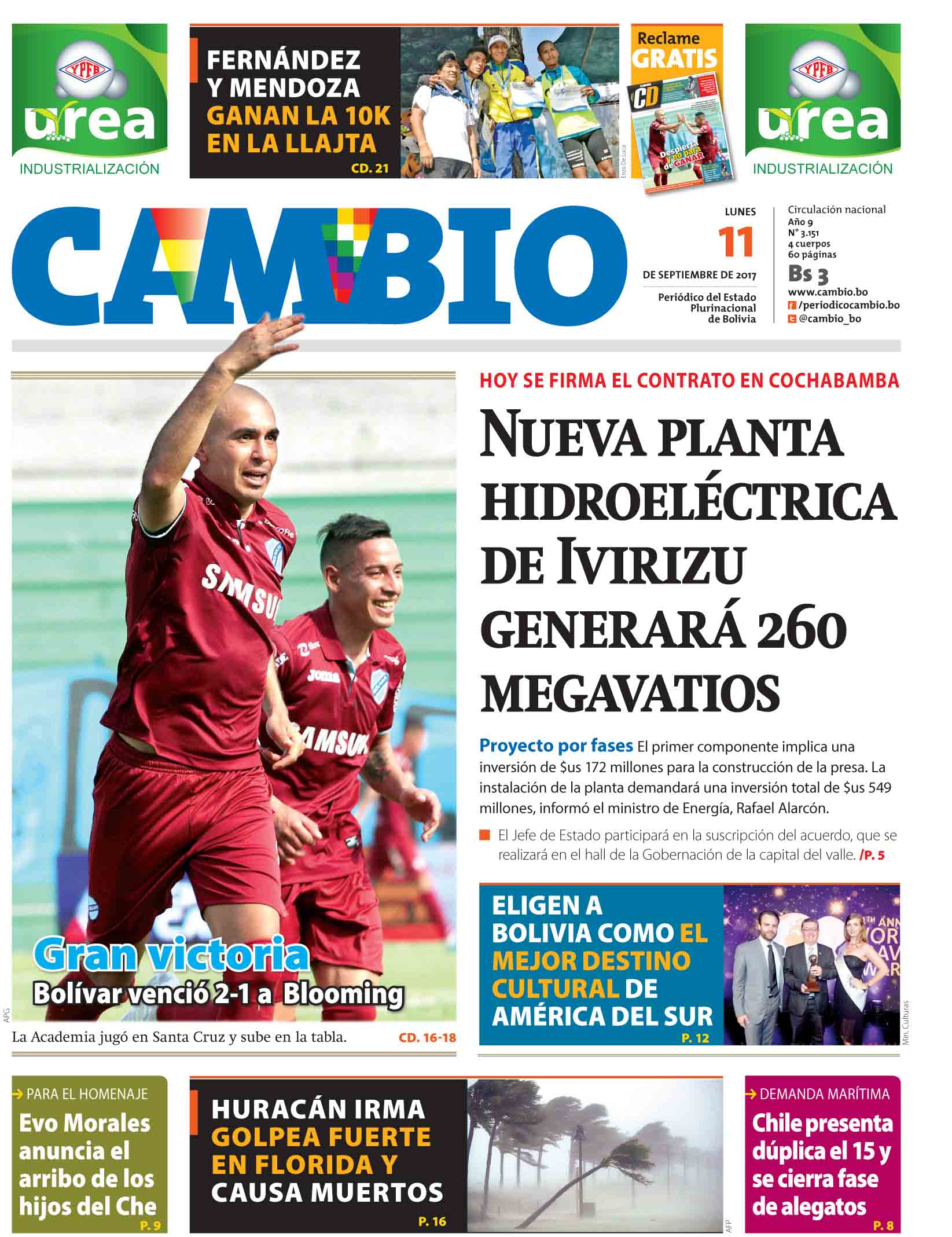 Portadas de periódicos de Bolivia del lunes 11 de septiembre de 2017Categorías MonitoreoEtiquetas , Portadas de periódicos 11/09/2017 El Deber – Los Tiempos – El Día – La Razón – Cambio – El Diario – Página Siete – Opinión