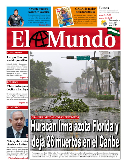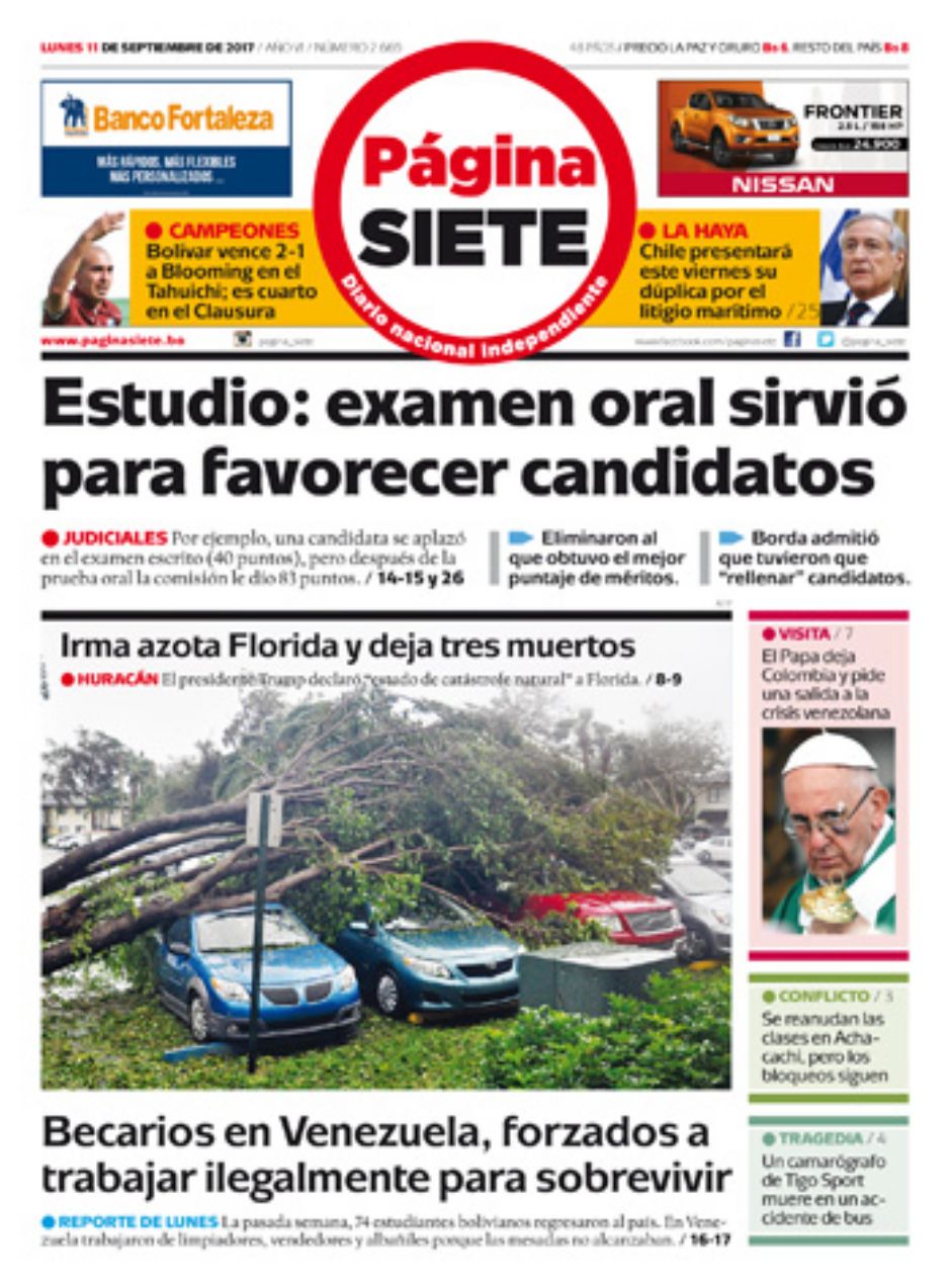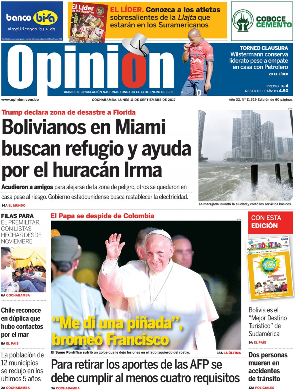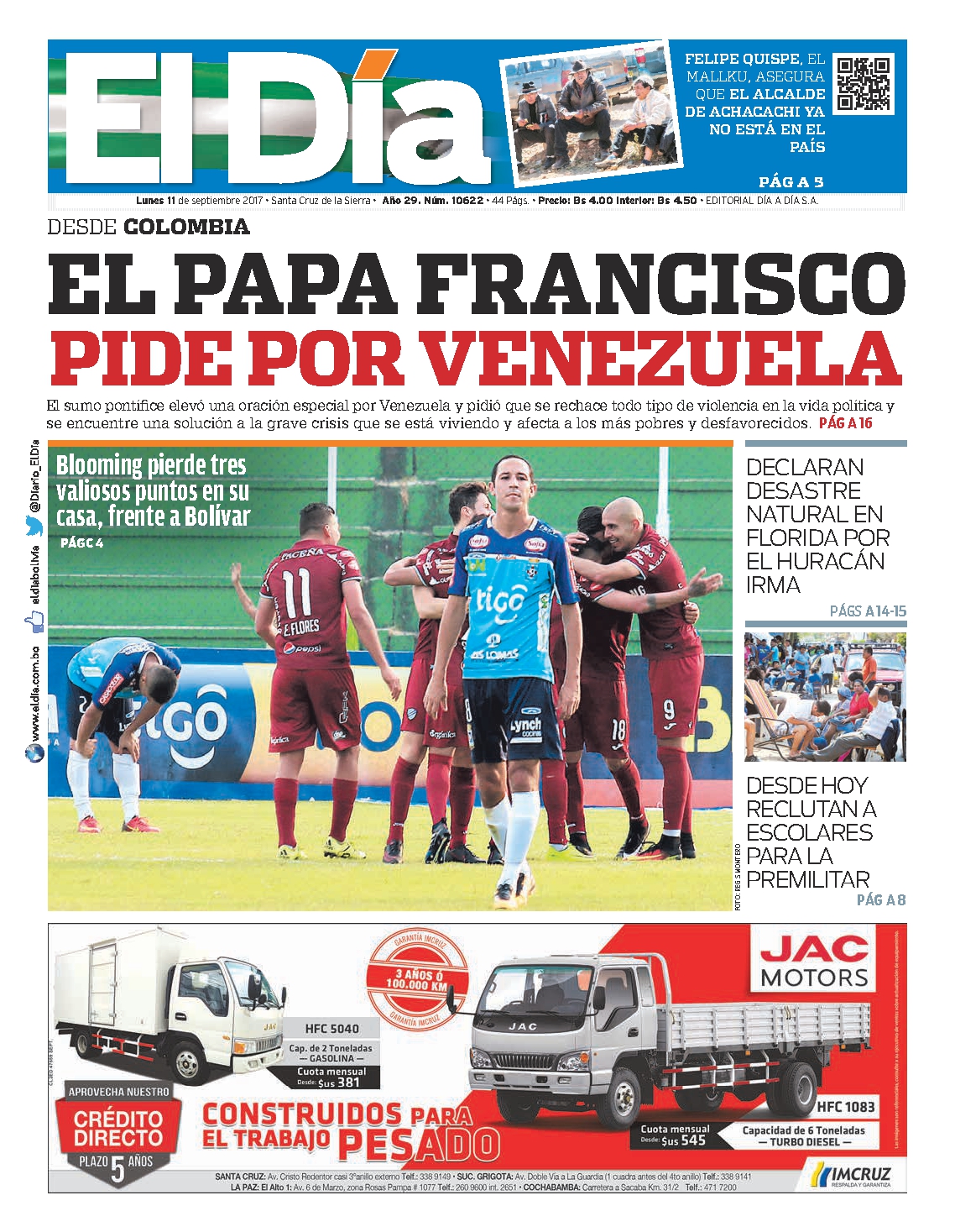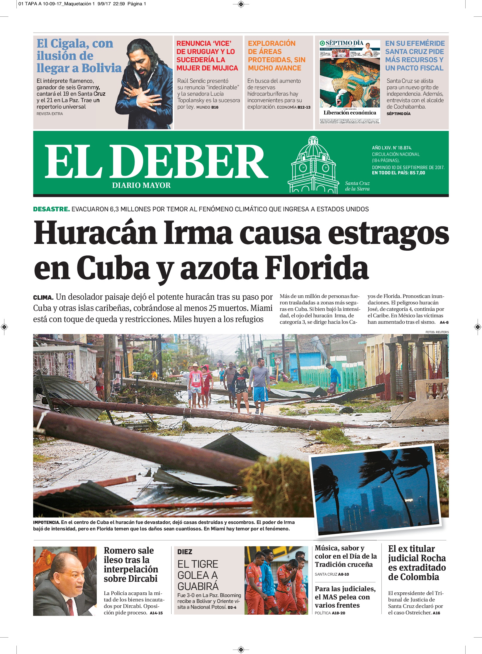 Portadas de periódicos de Bolivia del lunes 11 de septiembre de 2017Categorías MonitoreoEtiquetas , Portadas de periódicos 11/09/2017 El Deber – Los Tiempos – El Día – La Razón – Cambio – El Diario – Página Siete – Opinión