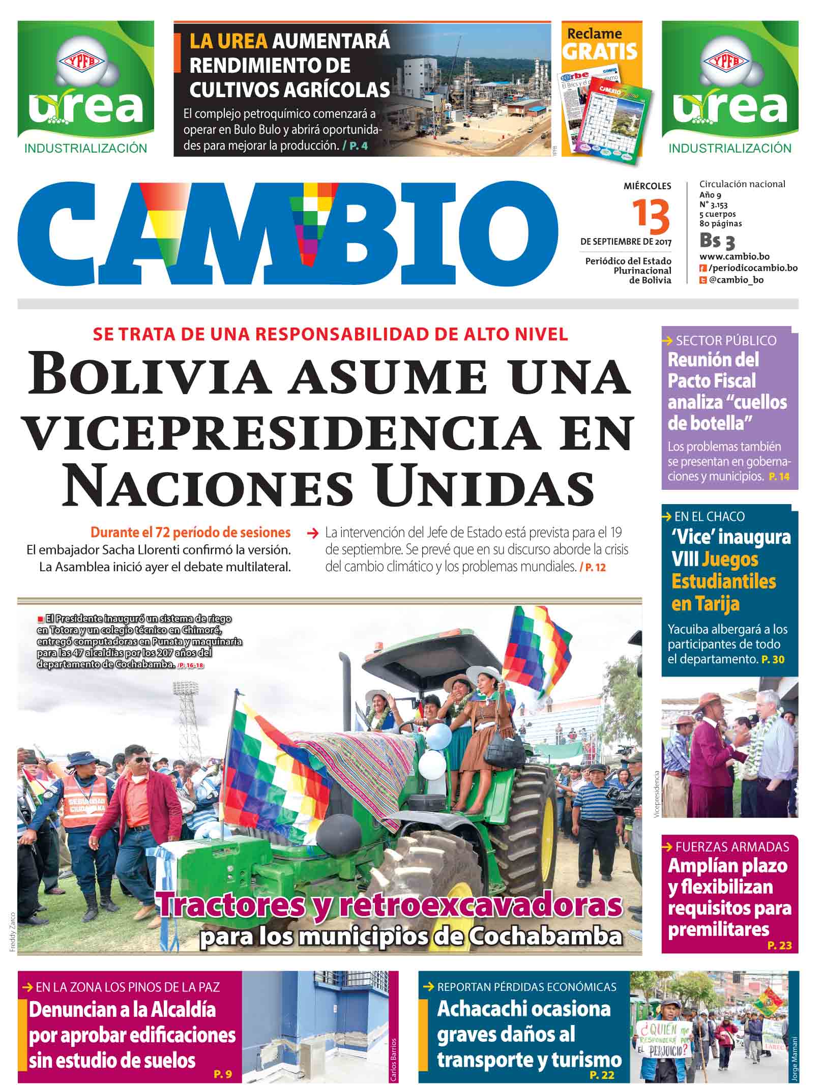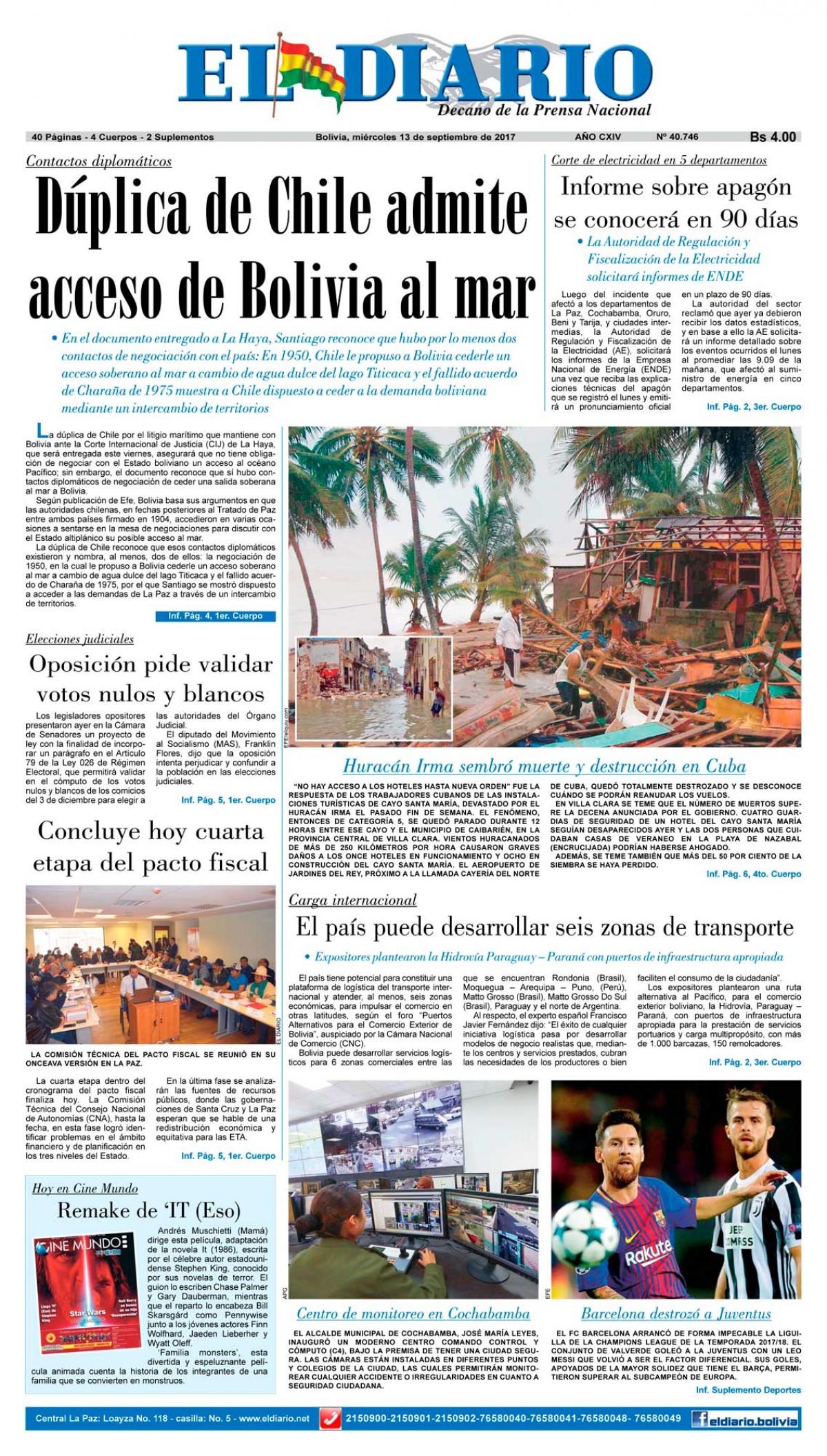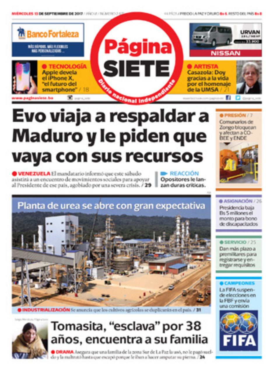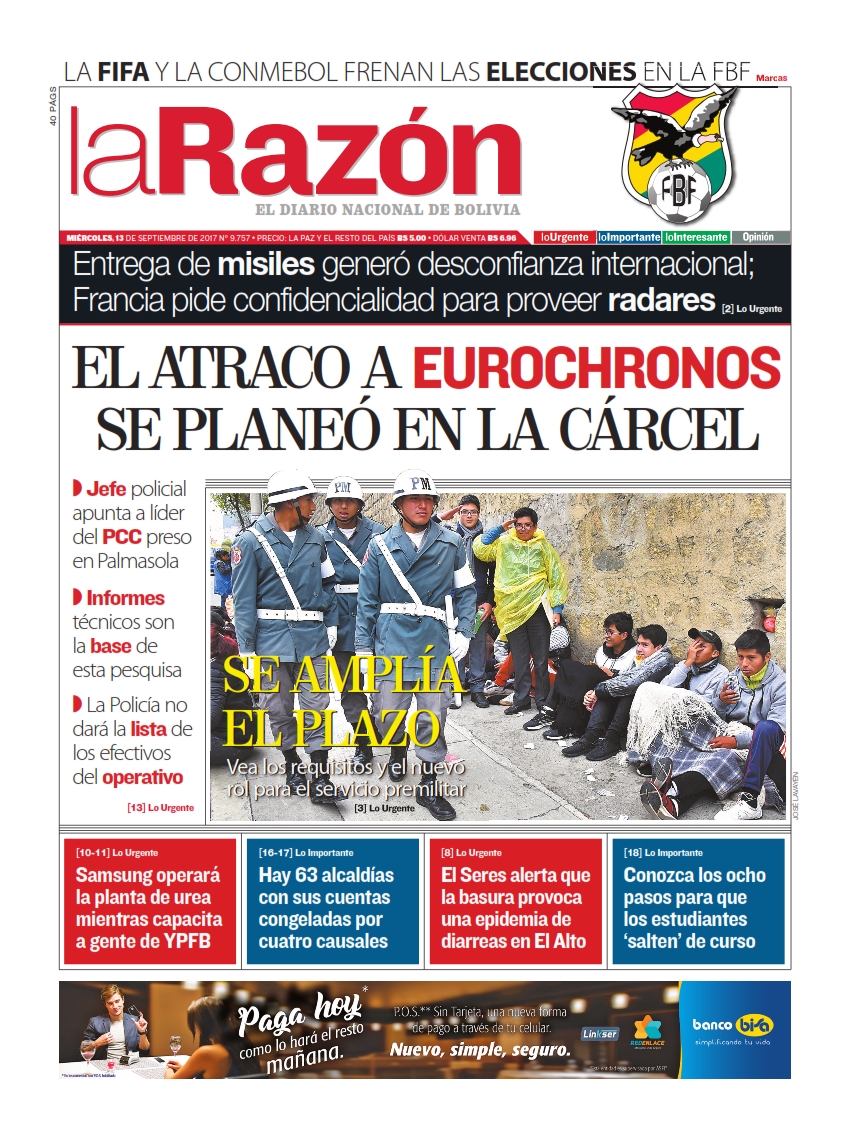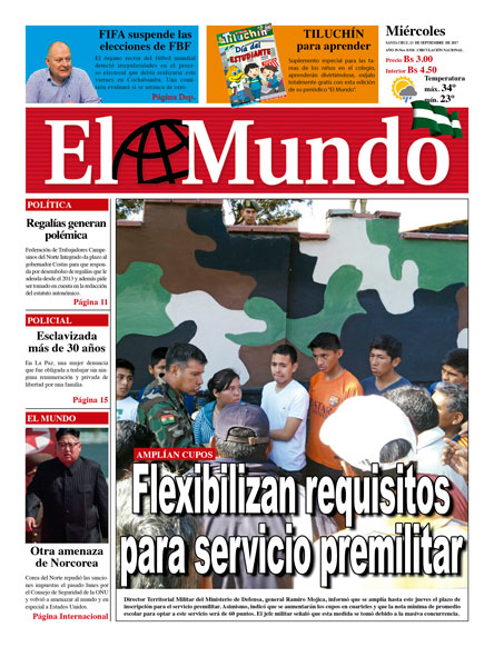 Portadas de periódicos de Bolivia del miércoles 13 de septiembre de 2017