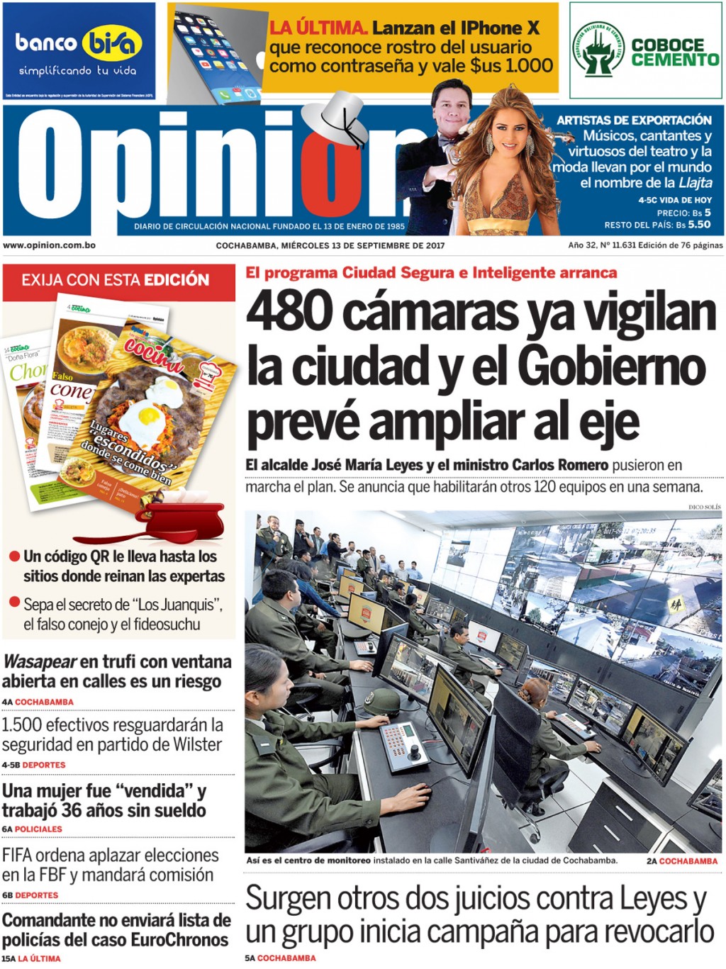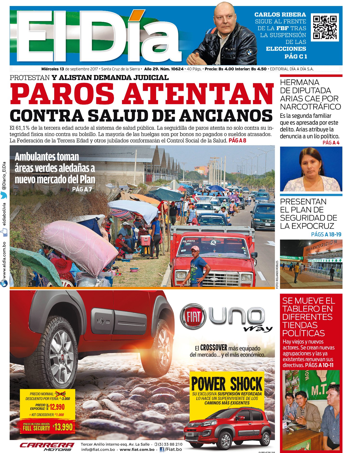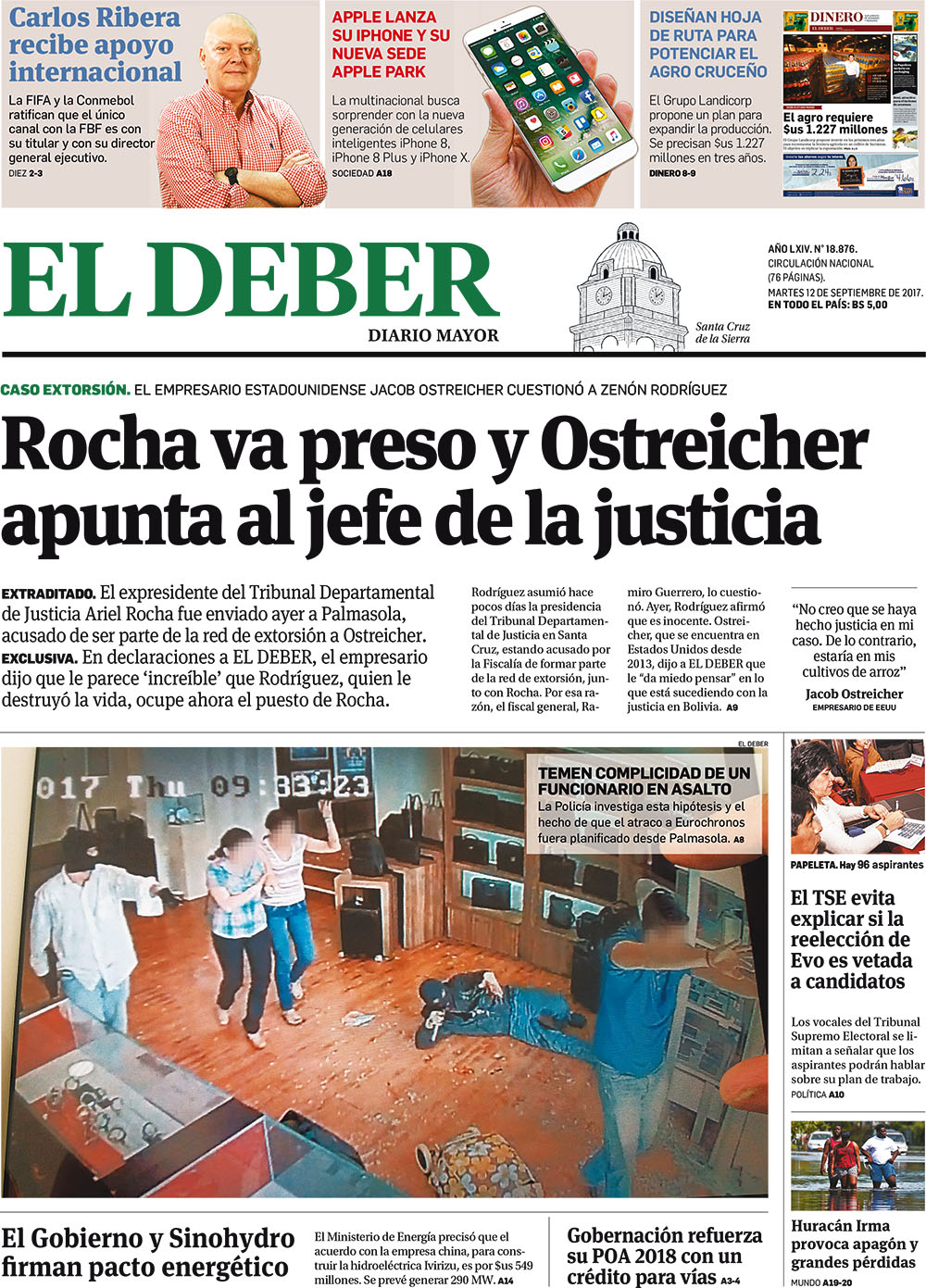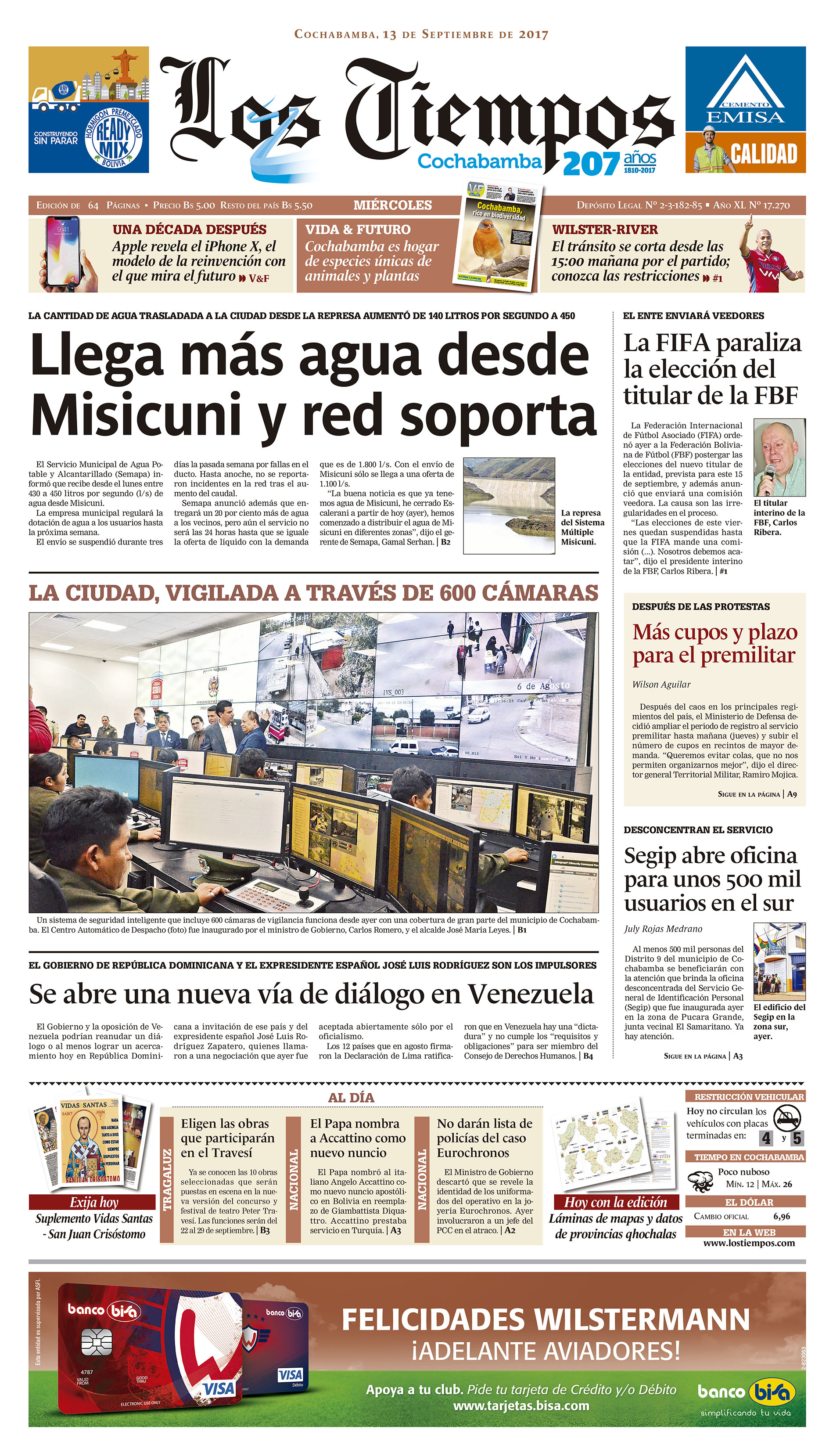 Portadas de periódicos de Bolivia del miércoles 13 de septiembre de 2017