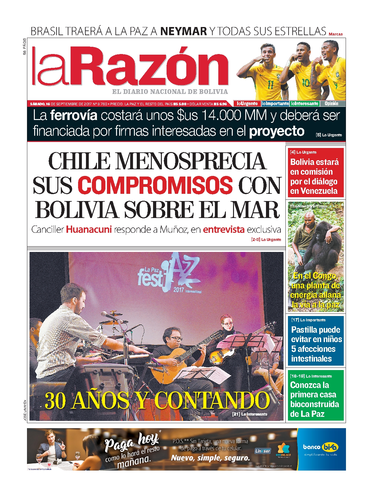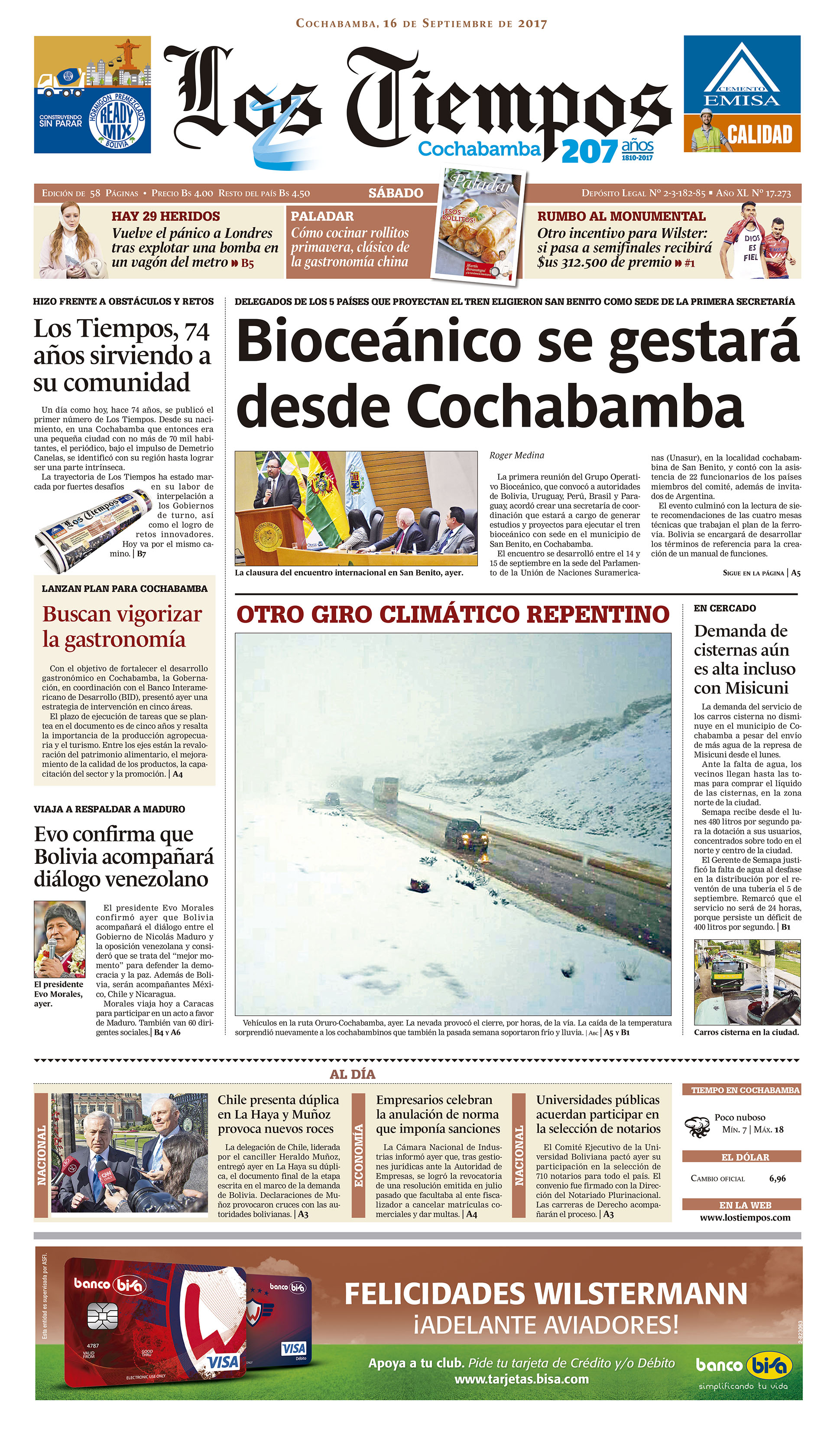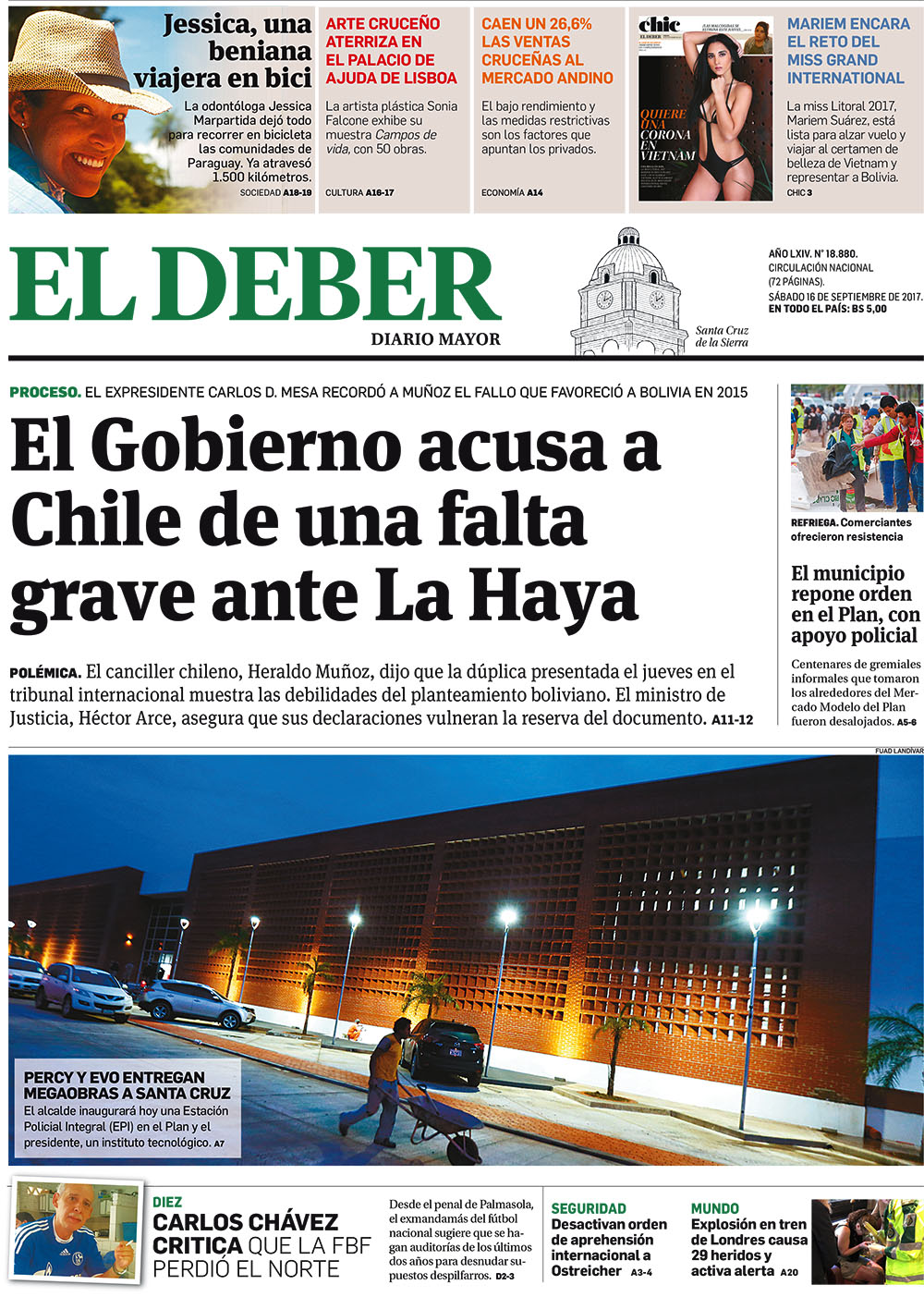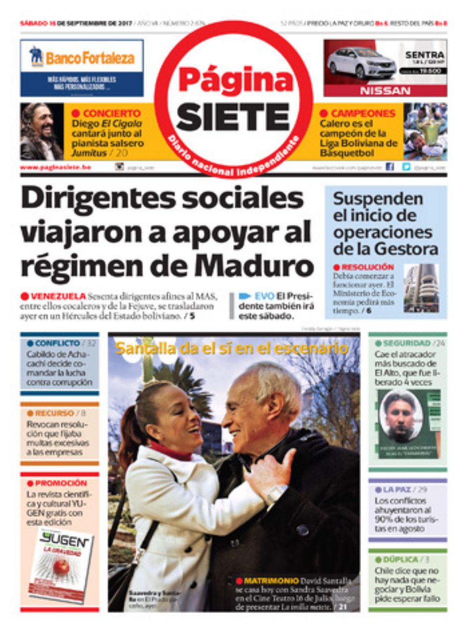 Portadas de periódicos de Bolivia del sábado 16 de septiembre de 2017Categorías MonitoreoEtiquetas , Portadas de periódicos 16/09/2017 El Deber – Los Tiempos – El Día – La Razón – Cambio – El Diario – Página Siete – Opinión