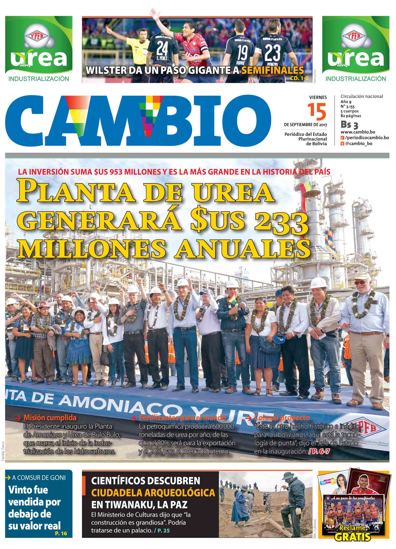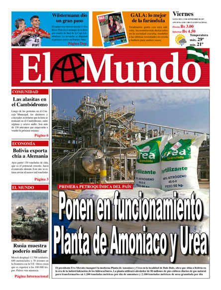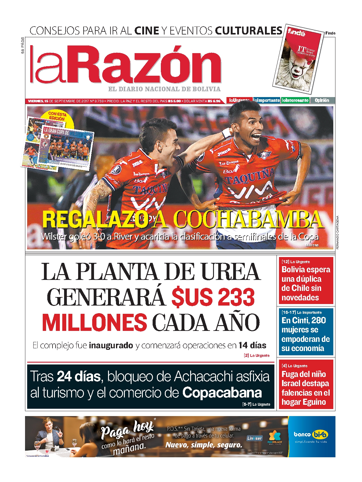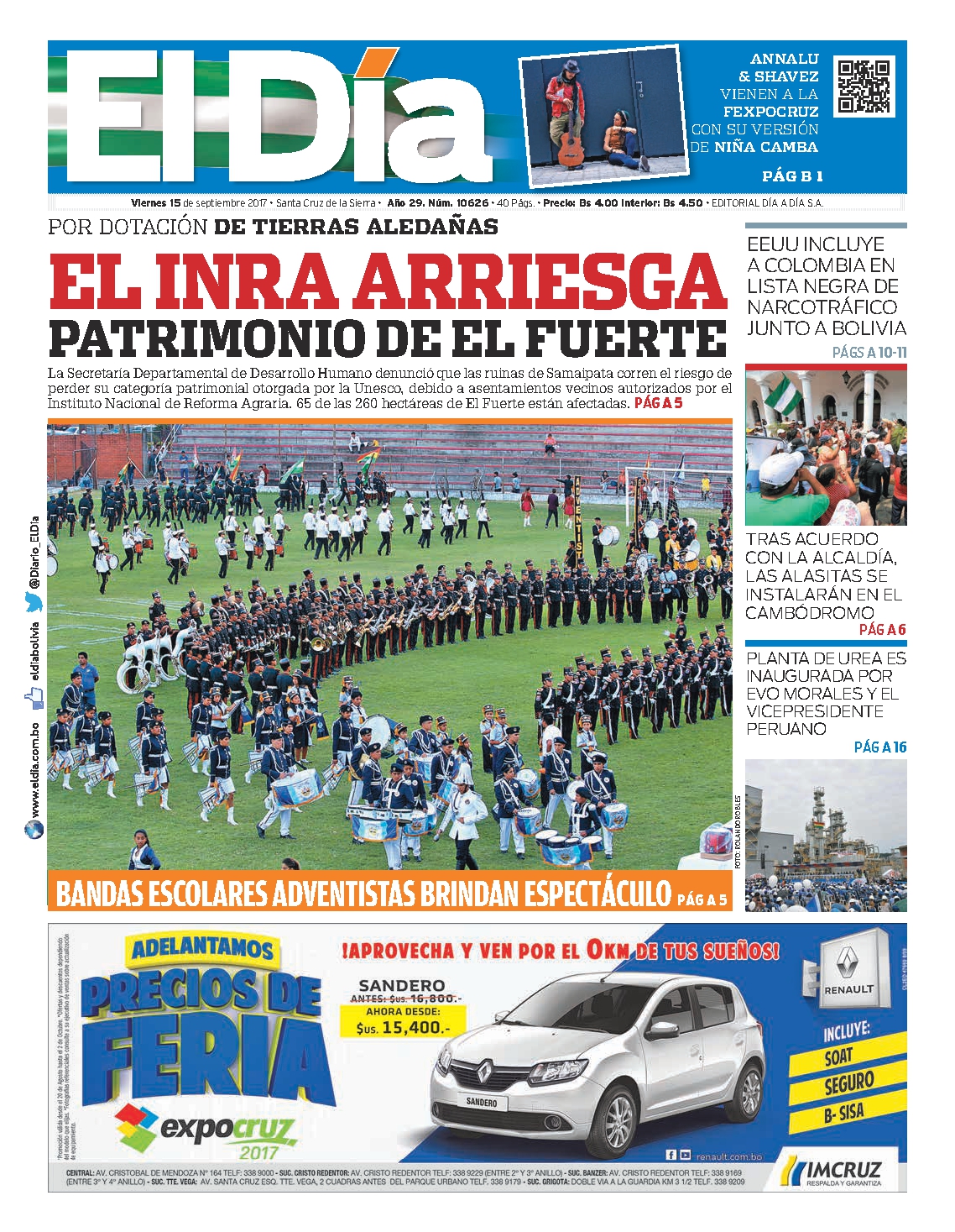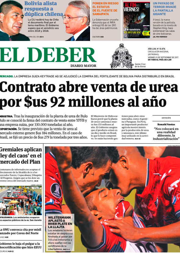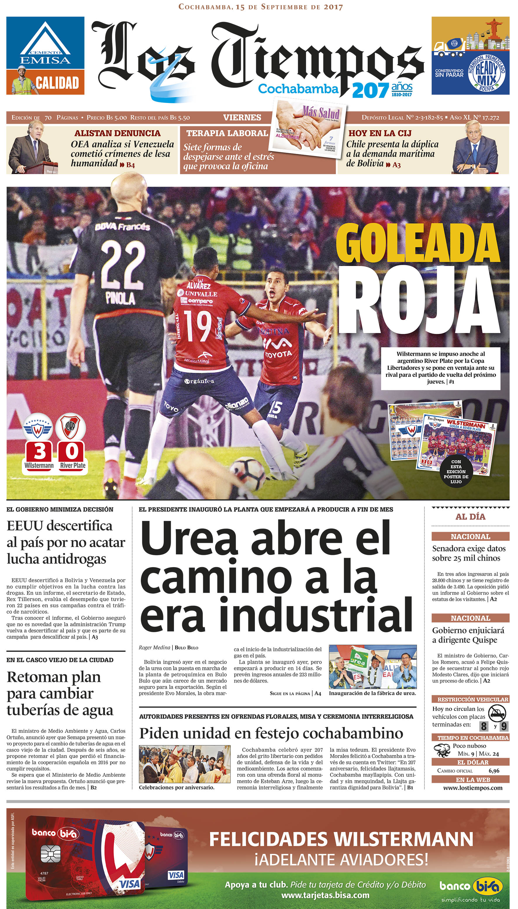 Portadas de periódicos de Bolivia del viernes 15 de septiembre de 2017Categorías MonitoreoEtiquetas , Portadas de periódicos 15/09/2017 El Deber – Los Tiempos – El Día – La Razón – Cambio – El Diario – Página Siete – Opinión