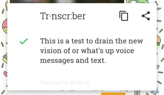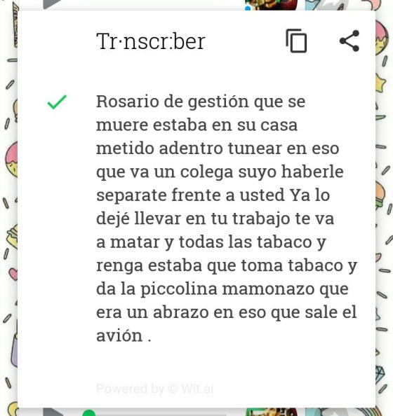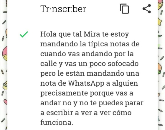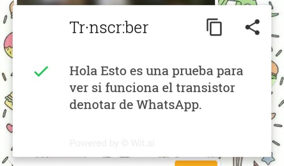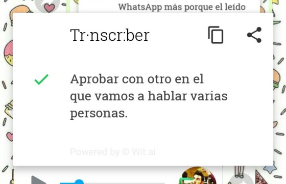 Cuando se selecciona Transcriber, aparece una ventana de la aplicación con la transcripción del mensaje seleccionado. Tarda un poco, según la duración del mensaje.No siempre acierta ni evita el doble check azulLa aplicación no acierta siempre con la transcripción de los mensajes. Confunde palabras fonéticamente similares, y en ocasiones no capta correctamente la terminación de algunas («notas» por «notar», por ejemplo). Sin embargo, por contexto, suele entenderse sin problemas. Y por si te lo estás preguntando: no, no evita que salga el doble check azul. Aunque no escuches el mensaje, a la persona que te lo ha enviado le aparecerá como «leído» en cuanto lo abras con Transcriber.La aplicación también da problemas en audios en los que hablan varias personas simultáneamente. En esos casos, el mensaje suele transcribirse incompleto. Tampoco permite tacos: censura los insultos y palabras malsonantes que contengan los audios. Solo aparece la primera letra de la palabra y asteriscos (en las pruebas, los sustituía por «j****» o «m******»).Prueba 1: mensaje sencillo y dicción pausadaLo que dice el mensaje: «Holaaa esto es una prueba para ver si funciona el transcriptor de notas de WhatsApp».Lo que entiende Transcriber:
