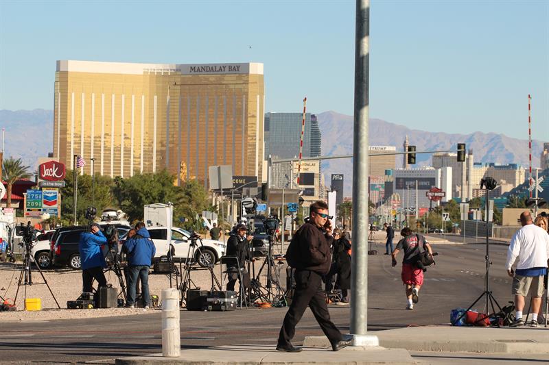 - Periodistas se aglomeran en las cercanías de Las Vegas Strip, zona de hoteles, casinos y resorts más grandes del mundo. Foto: EFE