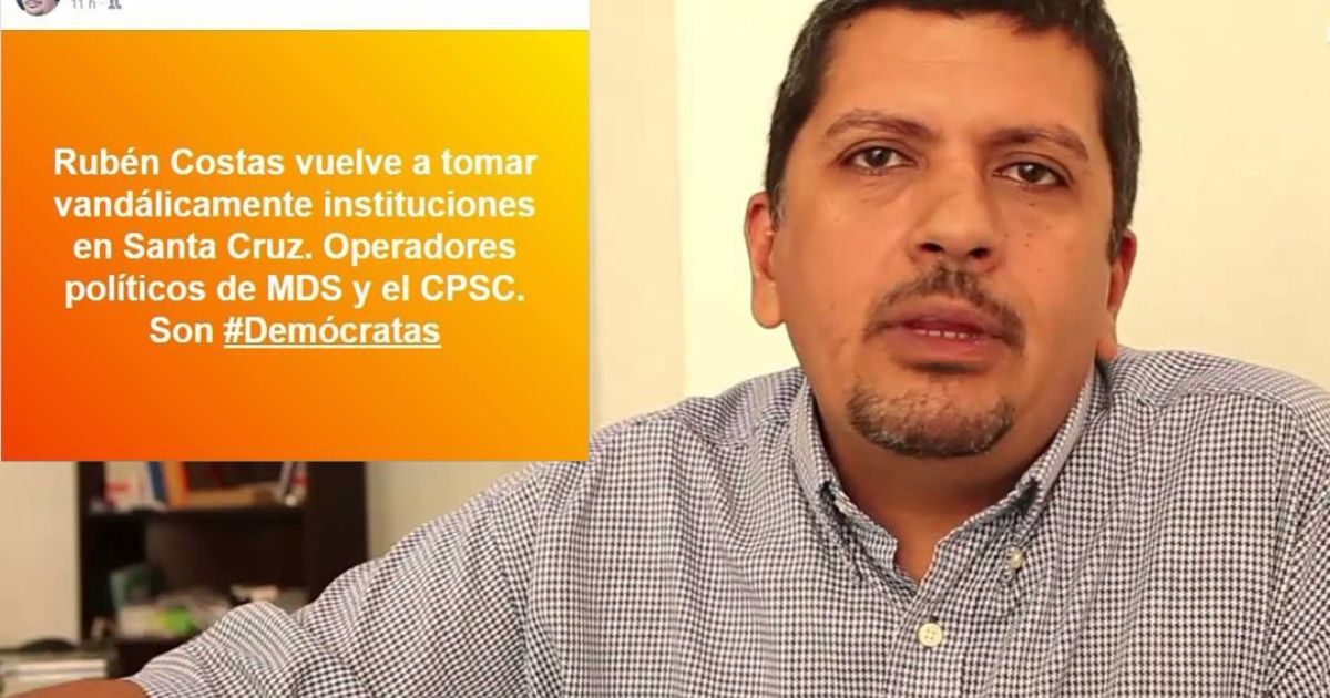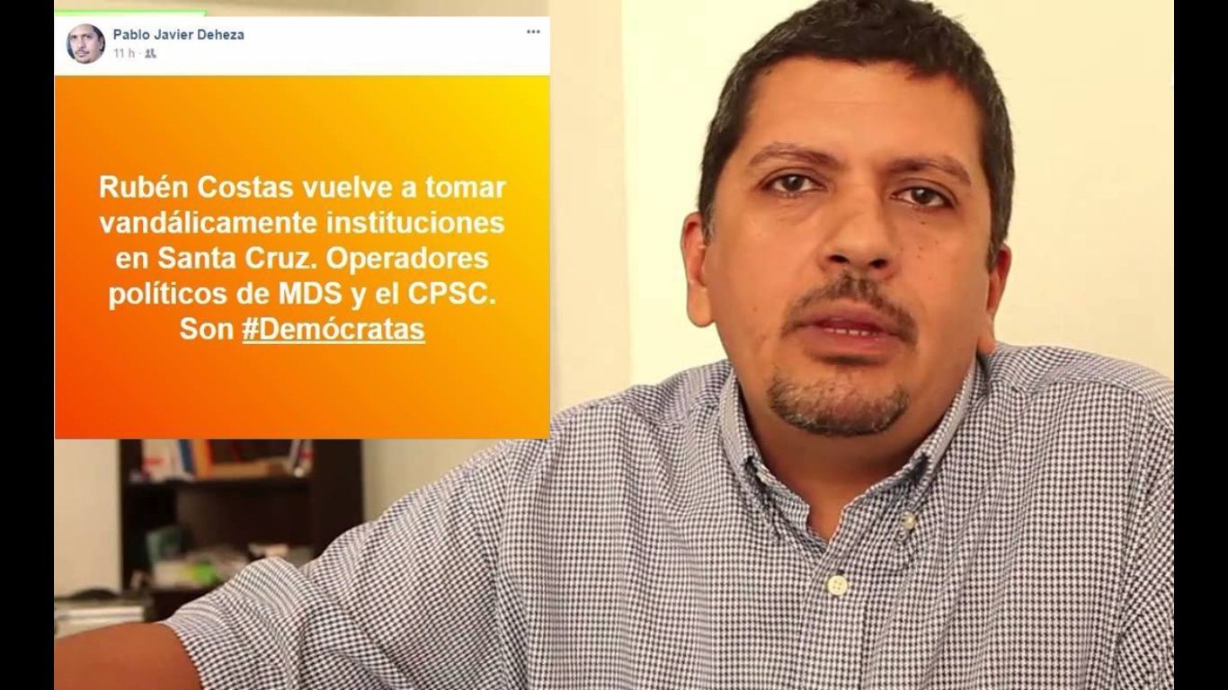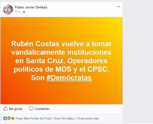 Rubén Costas vuelve a tomar vandálicamente instituciones en Santa Cruz. Operadores políticos de MDS y CPSC. Son #Demócratas”. Con esas palabras, el coordinador departamental de Autonomías de Santa Cruz, Pablo Javier Deheza, dependiente del Ministerio de la Presidencia, acusó en redes sociales al gobernador cruceño y a su estructura política, algo que para la Gobernación representa un “exabrupto irresponsable de un acusador infame”.