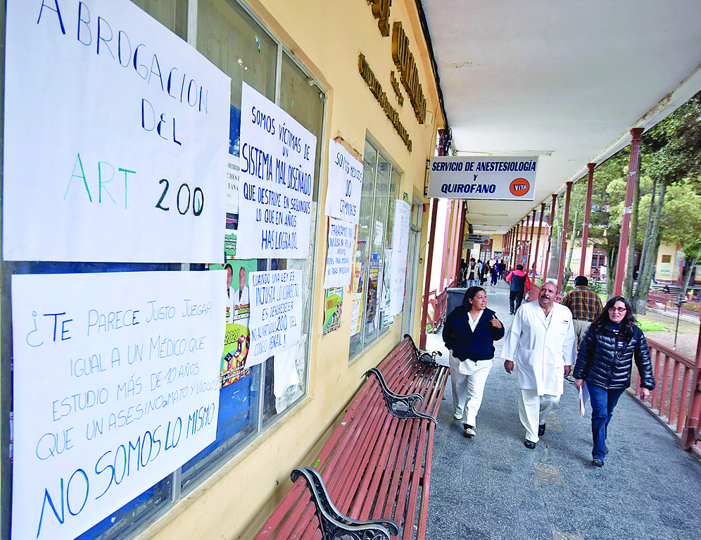 En el Hospital de Clínicas no hay consulta externa.A doña Lorena debían operarla hoy, pues hace dos meses le diagnosticaron apendicitis. Ayer ella llegó al Hospital Obrero para internarse, pero le dijeron que debido al paro médico, no la podían internar, por lo que reprogramaron su cirugía para el 16 de febrero.“No puede ser que me digan eso. Estoy mal, pero para ellos debo llegar doblándome en dos para que crean que es emergencia y me operen. Qué pasa si antes de ese tiempo se me complica”, reclamó la mujer de 39 años, e imploró que la atiendan.Vanos fueron sus intentos por convencer al personal de salud del nosocomio para que la operen. “Ni modo, debo ir a casa, quizá a morir”, dijo al salir frustrada del hospital.Otra de las pacientes del nosocomio, doña Severina, contó desesperada que desde hace nueve días está internada en el hospital. “Me dijeron que me operarían de la vesícula, pero hasta la fecha no me intervienen. El doctor me dijo que no me puede operar porque hay paro, mientras tanto, qué hago aquí adentro”, lamentó.Hace siete días, el Consejo Nacional de Salud (Conasa) ingresó a un paro general indefinido en el sistema de salud pública y del seguro a corto plazo de todo el país en rechazo a los artículos 200 y 205 del proyecto de ley del Código del Sistema Penal porque “criminaliza el acto médico” y en rechazo al Decreto Supremo 3385, que aclara la creación de la Autoridad de Fiscalización y Control del Sistema de Salud (Asinsa). Doña Gabriela contó que ella se internó el lunes en el hospital Obrero por problemas biliares y su médico le dijo que no se sabe cuándo le operarán debido al paro. “Yo soy docente, debo presentar notas de mis estudiantes, le pedí al doctor que me dé alta y tampoco quiere”, relató.El martes, la ministra de Salud, Ariana Campero, explicó que debido al paro cada día se suspenden hasta 3.000 atenciones médicas, por lo que solicitó levantar la protesta.El presidente del Colegio Médico de La Paz, Luis Larrea, anunció que no levantarán su medida hasta que haya acuerdo.Mientras tanto don Xavier protestó en la puerta del Materno Infantil porque su esposa no fue atendida por el ginecólogo. “Mi esposa está en los últimos meses de embarazo y me dicen que no hay atención. Ella debe hacerse sus controles”, reclamó.En el nosocomio sólo existe atención en la unidad de Emergencias. En tanto, en el Hospital Juan XXIII dependiente de la CNS en Munaypata, la atención en ginecología es normal.“Vengo desde la zona del Kenko de El Alto. A mí me programaron mi cita para hoy y veo que es normal”, dijo una de las pacientes que era la número 12 en la fila de espera.Sin embargo, en el sistema público es diferente. Ahí el personal camina apurado sin dar explicaciones a los pacientes.“Doctor, ¿va haber atención o no? Me dijeron que espere”, consultó un anciano a un galeno. El médico le respondió secamente: “Lea el letrero, señor”.Con la impotencia y casi a punto de llorar, don Manuel contó que su dolor en los pies es muy fuerte.“Es el reumatismo, quería que me den medicamentos más fuertes porque ya no aguanto”, relató el hombre, pero al escuchar esa respuesta, prefirió irse a casa.Similar situación y desesperación de pacientes se observó en el Hospital de la Mujer, Gastroenterológico y en el Tórax, donde según los galenos, las salas de emergencia colapsan. El conflicto médicoProtesta Hace ocho días, los médicos comenzaron sus medidas de presión en contra del proyecto de ley del Código Penal y en rechazo al Decreto Supremo 3385 que aclara sobre la creación de la Autoridad de Fiscalización y Control del Sistema de Salud.Diálogo roto Los médicos decidieron romper el diálogo con el Gobierno, porque buscan la abrogación del Decreto. Ayer el Ministerio de Salud los convocó nuevamente.Página Siete / Verónica Zapana / La Paz