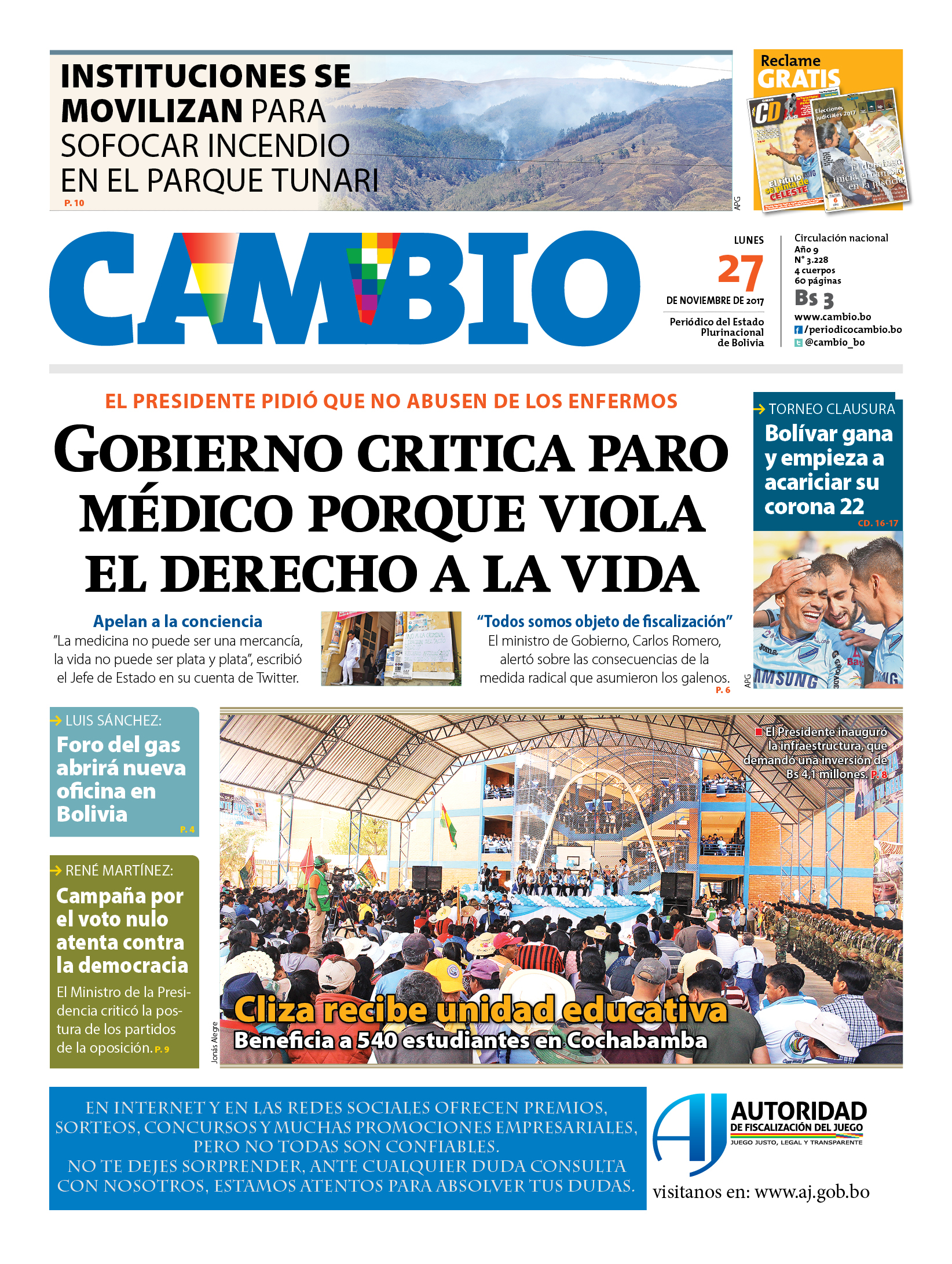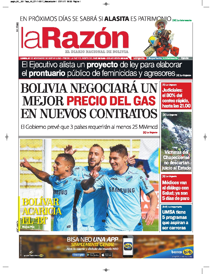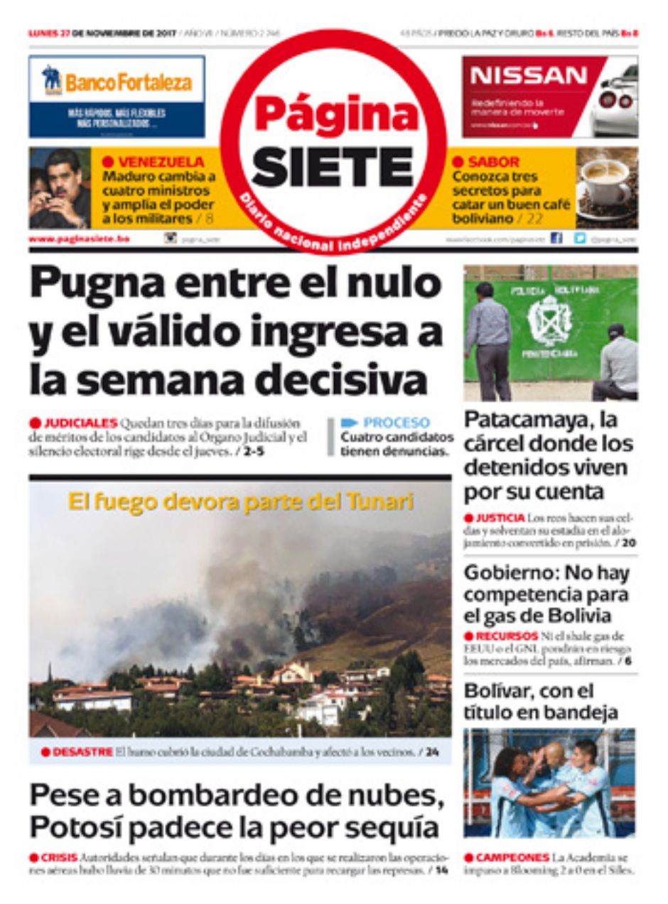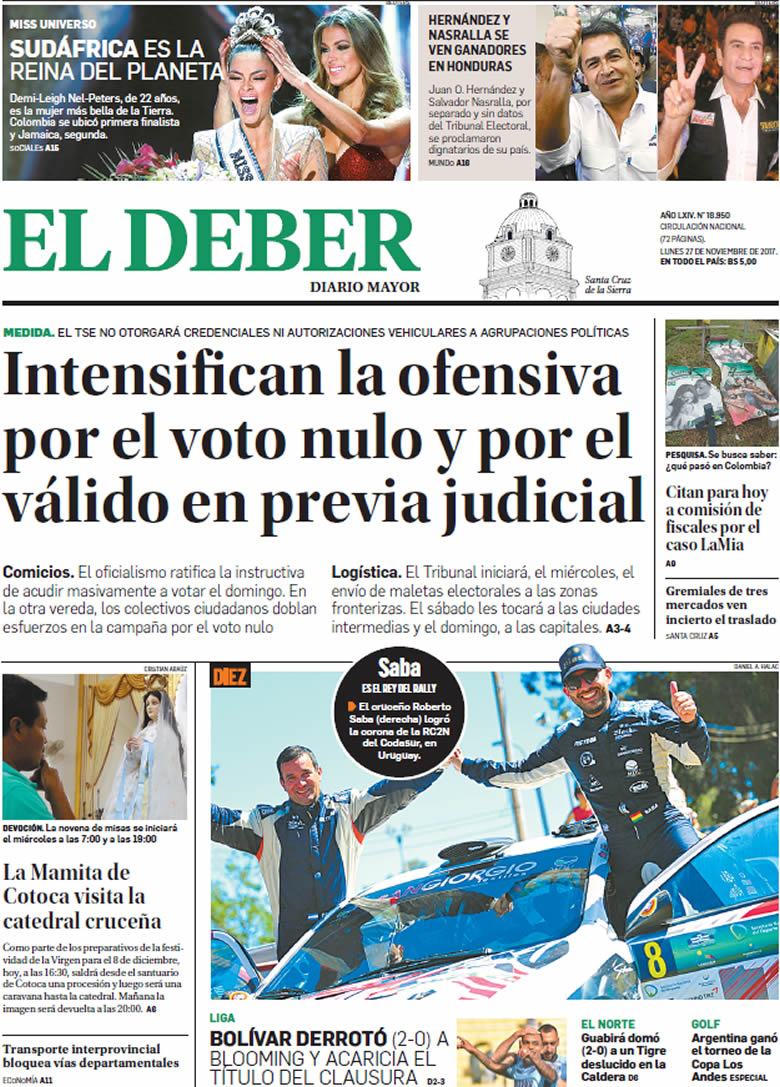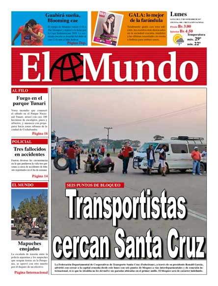 Portadas de periódicos de Bolivia del lunes 27 de noviembre de 2017Categorías MonitoreoEtiquetas , Portadas de periódicos 27/11/2017 El Deber – Los Tiempos – El Día – La Razón – Cambio – El Diario – Página Siete – Opinión