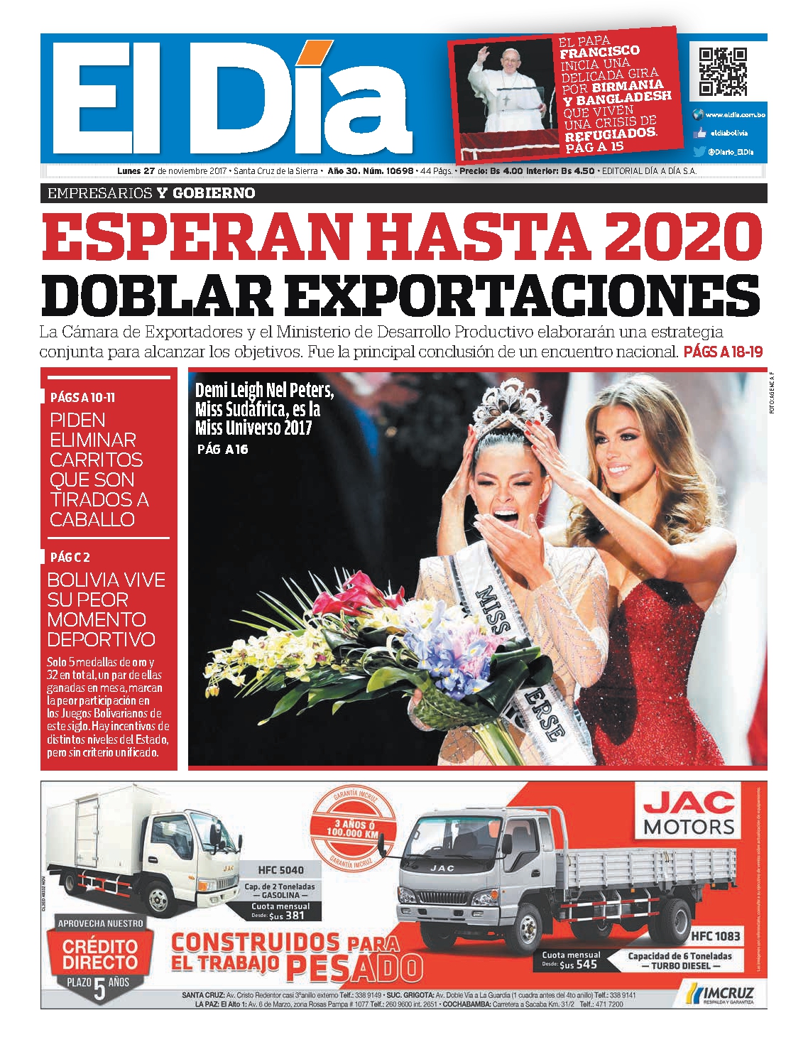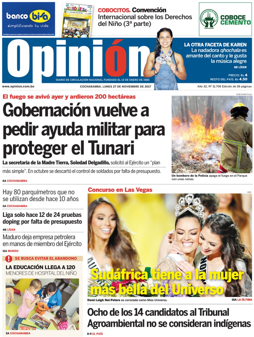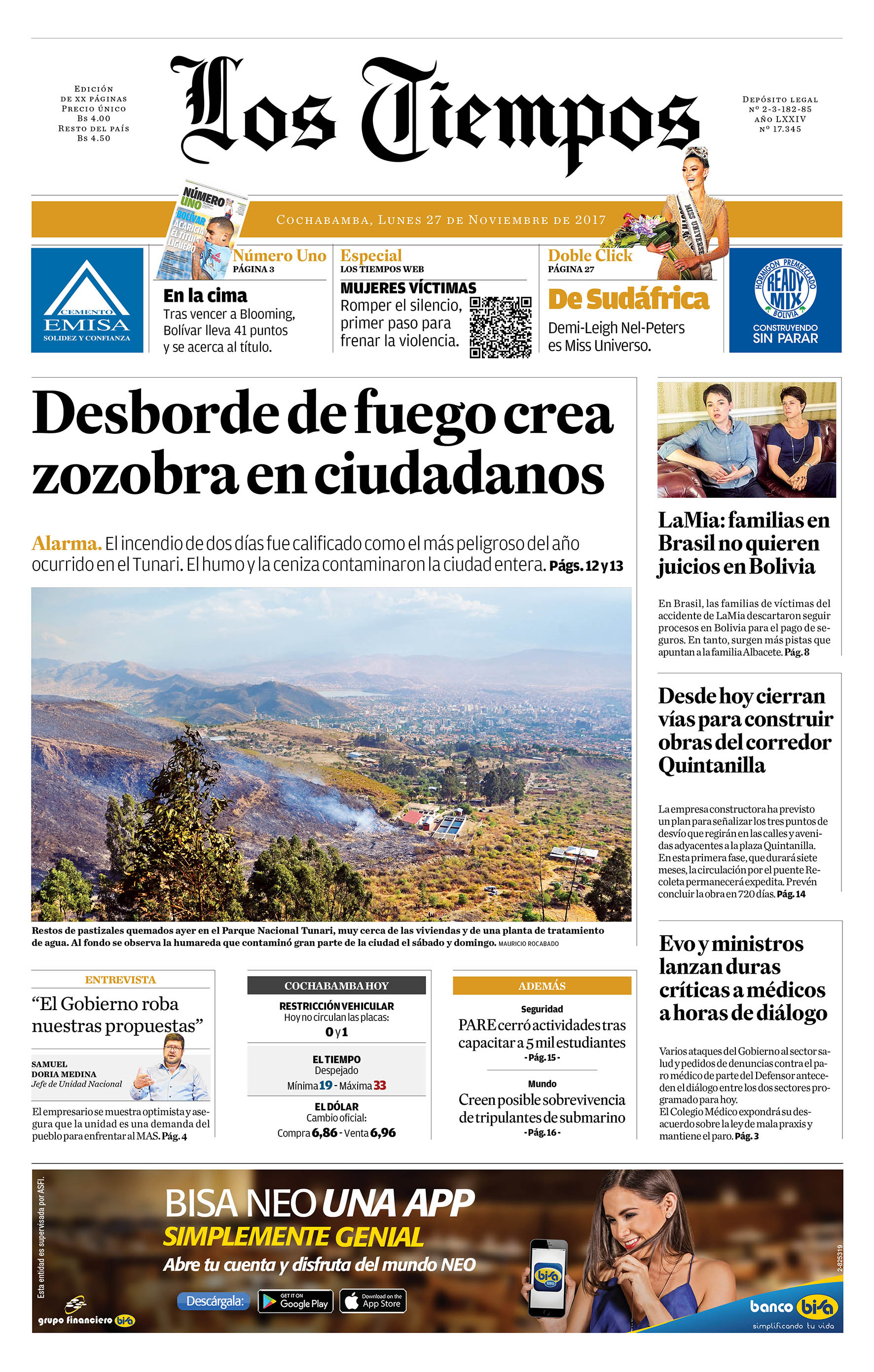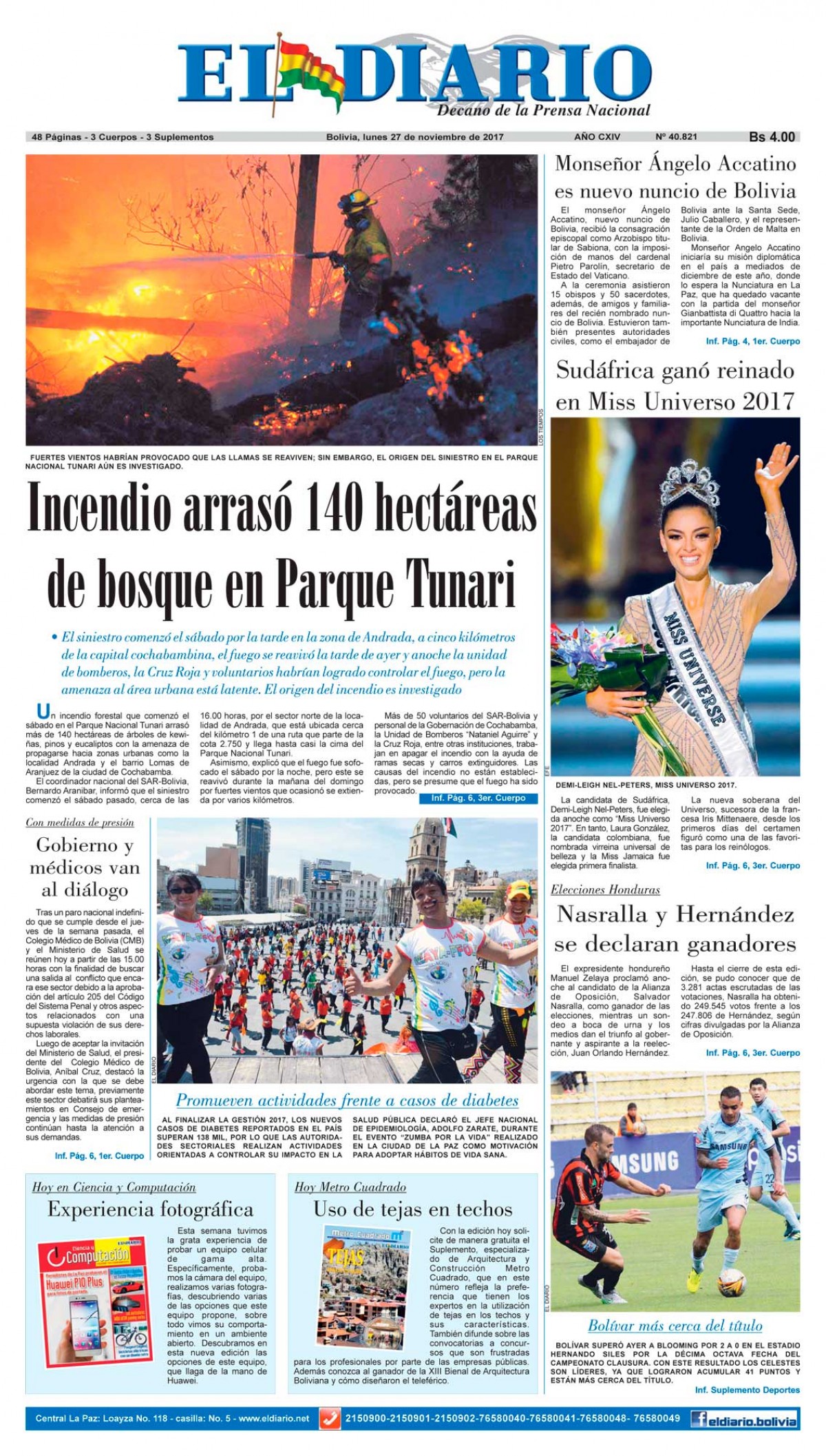 Portadas de periódicos de Bolivia del lunes 27 de noviembre de 2017Categorías MonitoreoEtiquetas , Portadas de periódicos 27/11/2017 El Deber – Los Tiempos – El Día – La Razón – Cambio – El Diario – Página Siete – Opinión