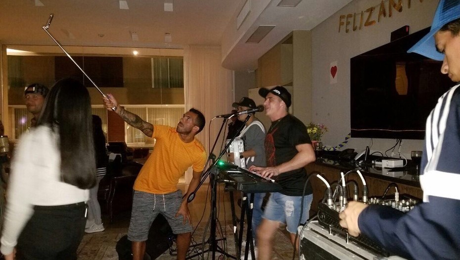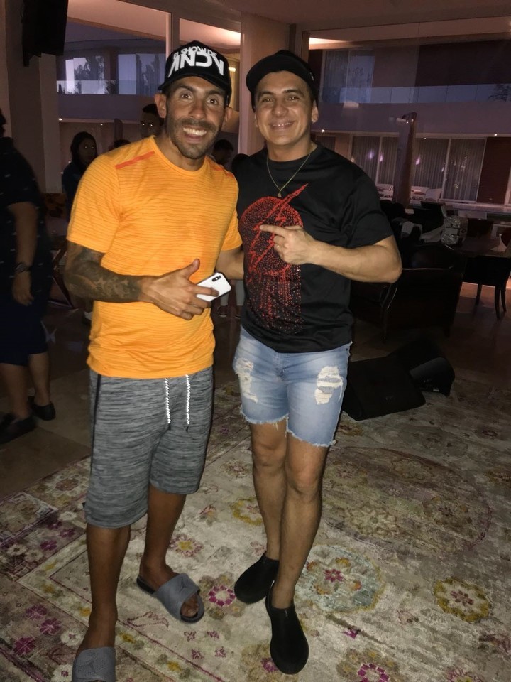 Carlos Tevez y Andy, durante el festejo navideño animado por el cantante preferido de los futbolistas. (@ELSHOWDEANDY)
