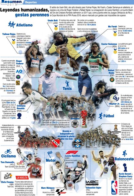 Los legendarios Rafa y Roger. Si el jamaicano cerró su leyenda en el atletismo, Rafael Nadal y Roger Federer prorrogaron la suya en el tenis. Ambos se repartieron la gloria en el Grand Slam. El español, número uno del mundo de la disciplina, ganó Roland Garros y el Abierto de los Estados Unidos; el suizo triunfó en el Abierto de Australia y en Wimbledon.