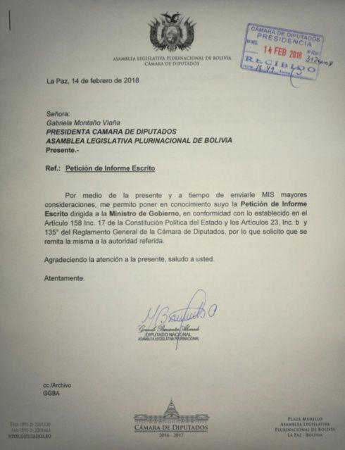 «En el marco de la facultad de fiscalización, en apego a lo establecido por el artículo 158º de la Constitución Política del Estado (CPE), y conforme a lo dispuesto en los artículos 135º y 136º, del Reglamento General de la Cámara de Diputados, solicito al ministro de Gobierno que tenga a bien remitir la presente petición de informe estricto de acuerdo con el siguiente cuestionario», se lee en la solicitud firmada por el diputado de Unidad Nacional.