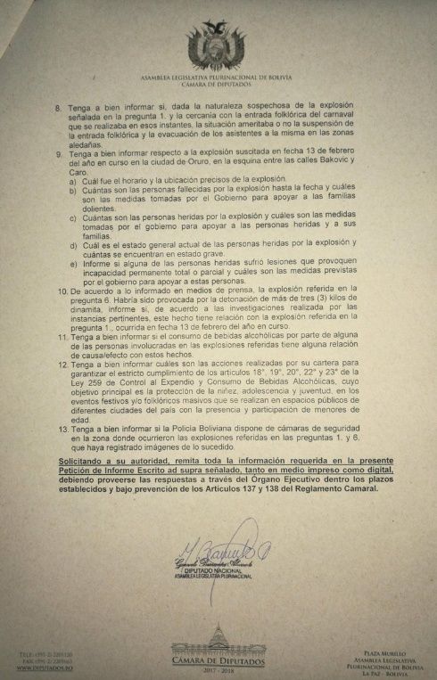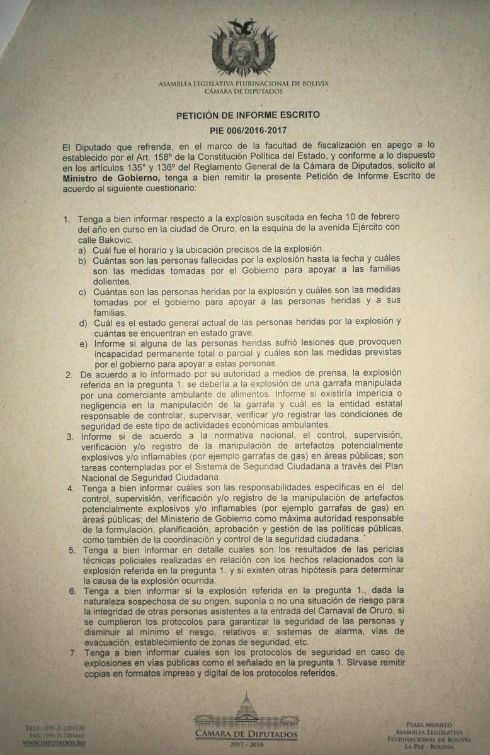 El diputado de Unidad Demócrata (UD), Gonzalo Barrientos, solicitó una petición de informe escrito al ministro de Gobierno, Carlos Romero, sobre las dos explosiones ocurridas en Oruro, durante los días de Carnaval.